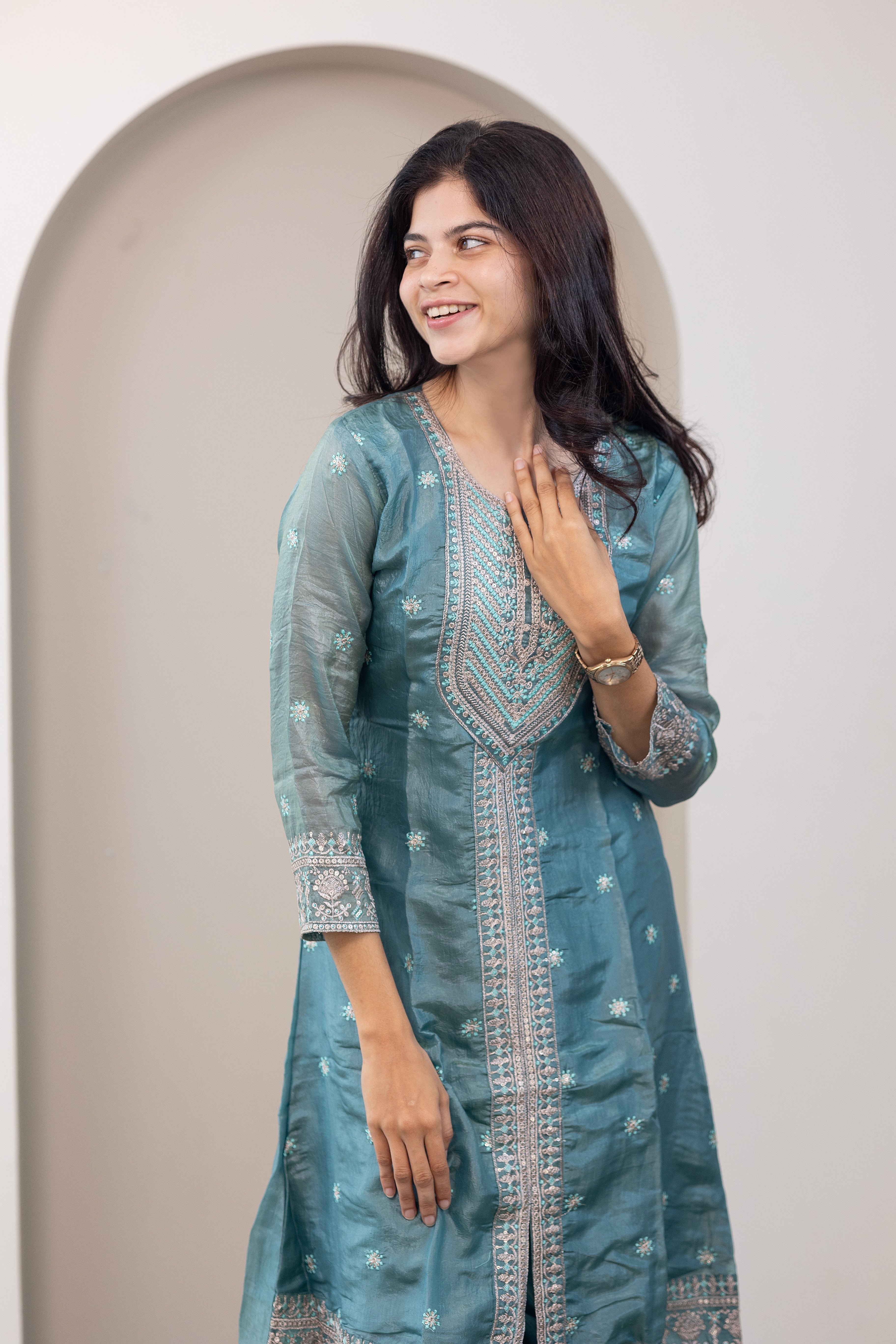 Elevate your ethnic wardrobe with the Aaradhya embroidered kurti set, a masterpiece of refined elegance. Crafted in luxurious crush tissue simmer fabric, this sky blue ensemble features intricate embroidery that captures traditional artistry with contemporary grace. The delicate draping and fluid texture of the fabric create a sophisticated silhouette, perfect for festive occasions, celebrations, or elevated everyday wear. Experience the perfect blend of comfort and style with this timeless piece that celebrates cultural heritage.
