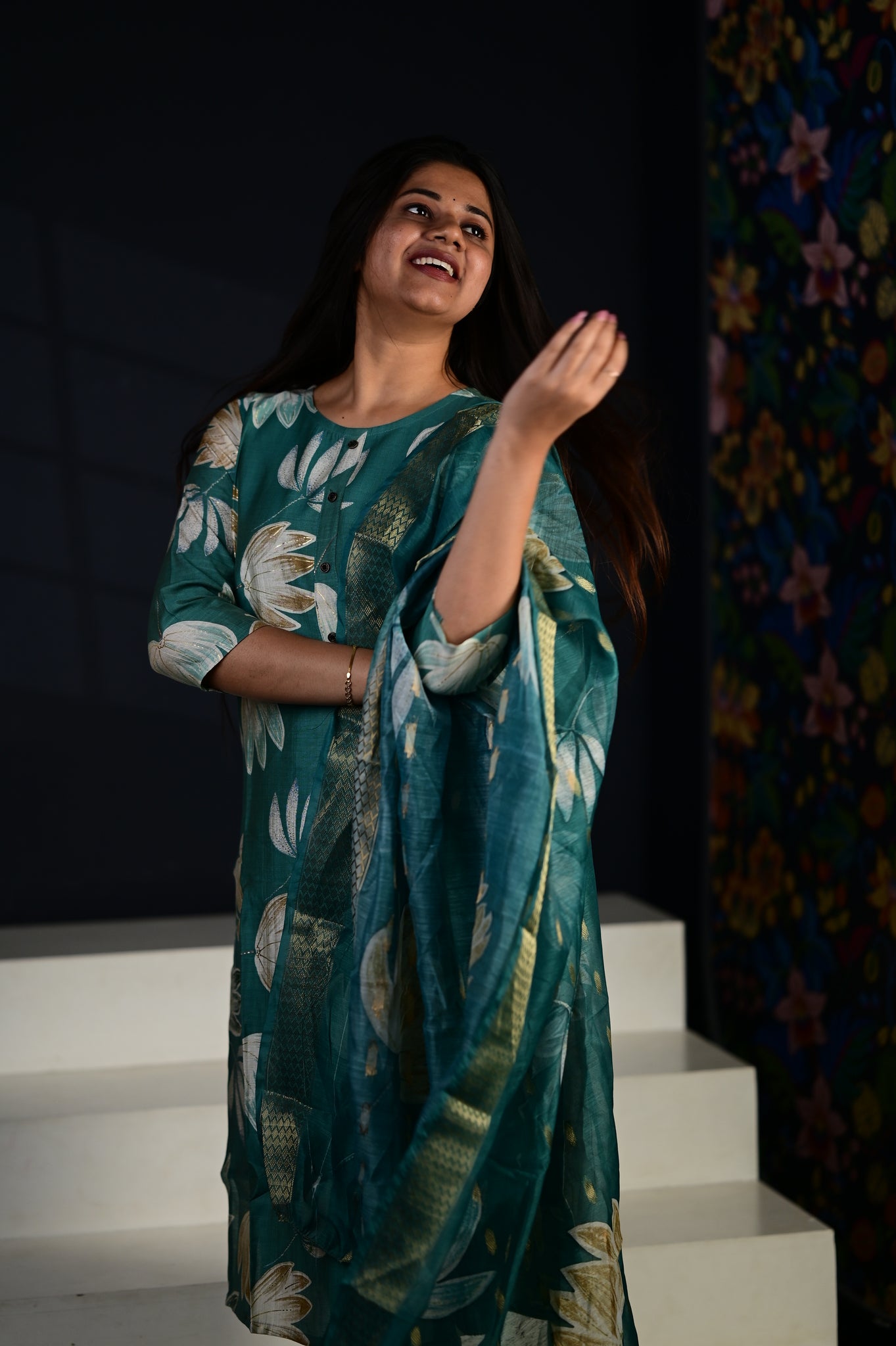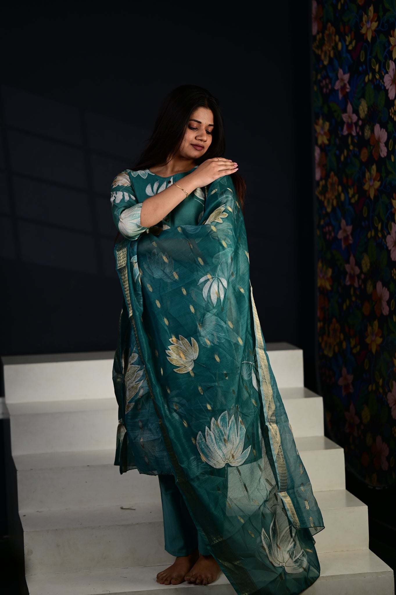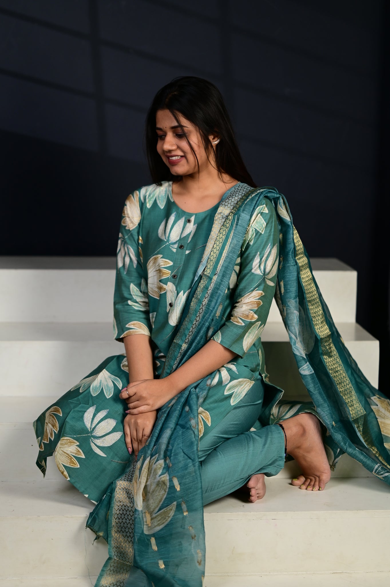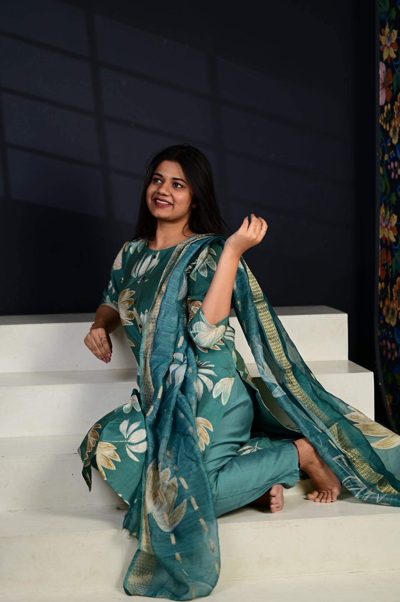 This sophisticated ensemble combines traditional craftsmanship with contemporary elegance, featuring meticulously tailored silhouettes that flatter and enhance. The verdant shade exudes grace and poise, making it an ideal choice for festive occasions, celebrations, or refined everyday wear..