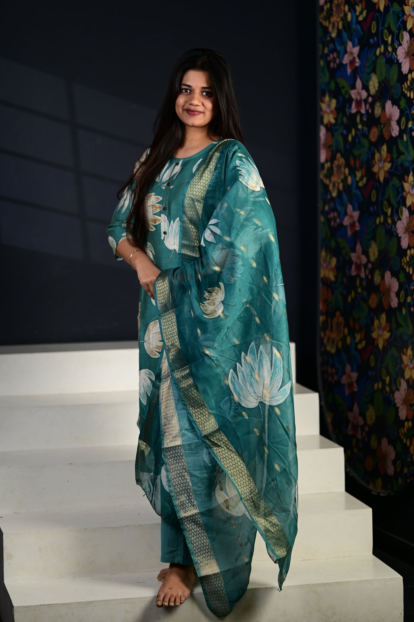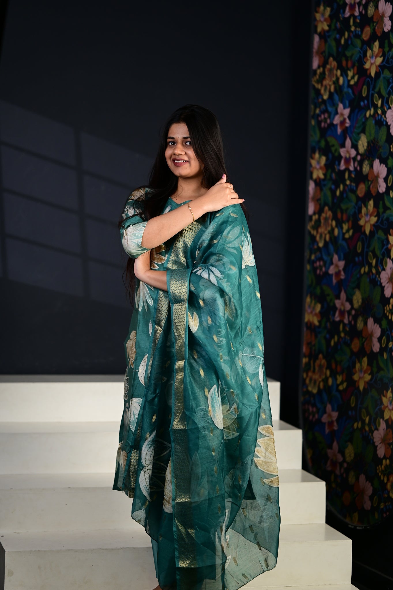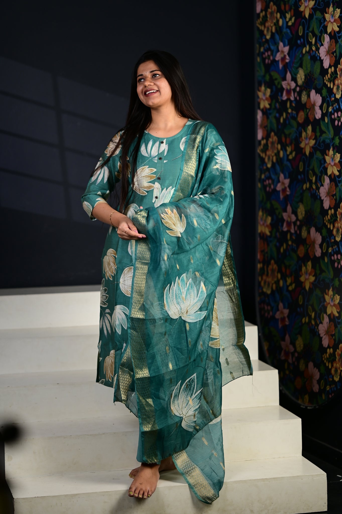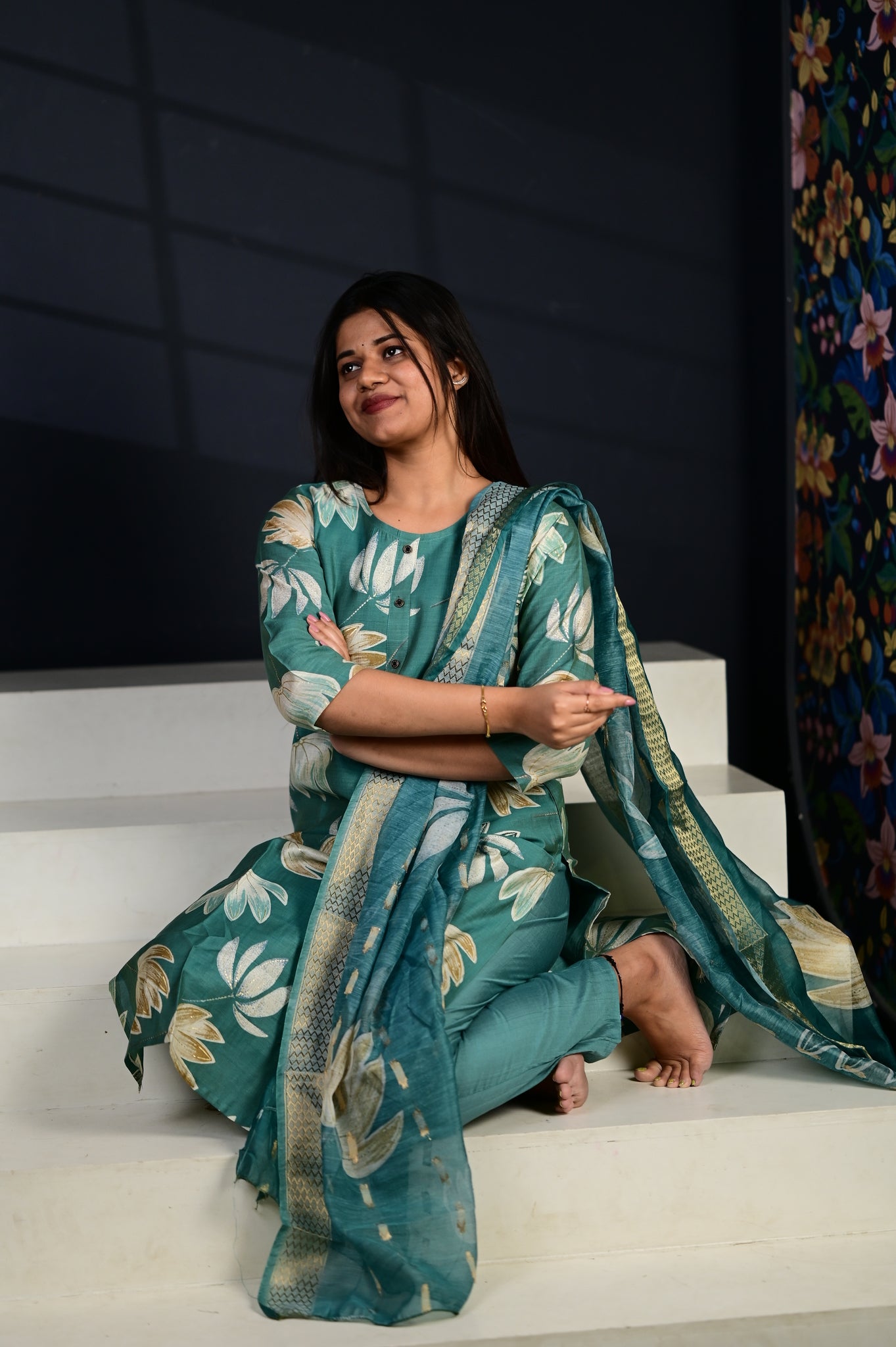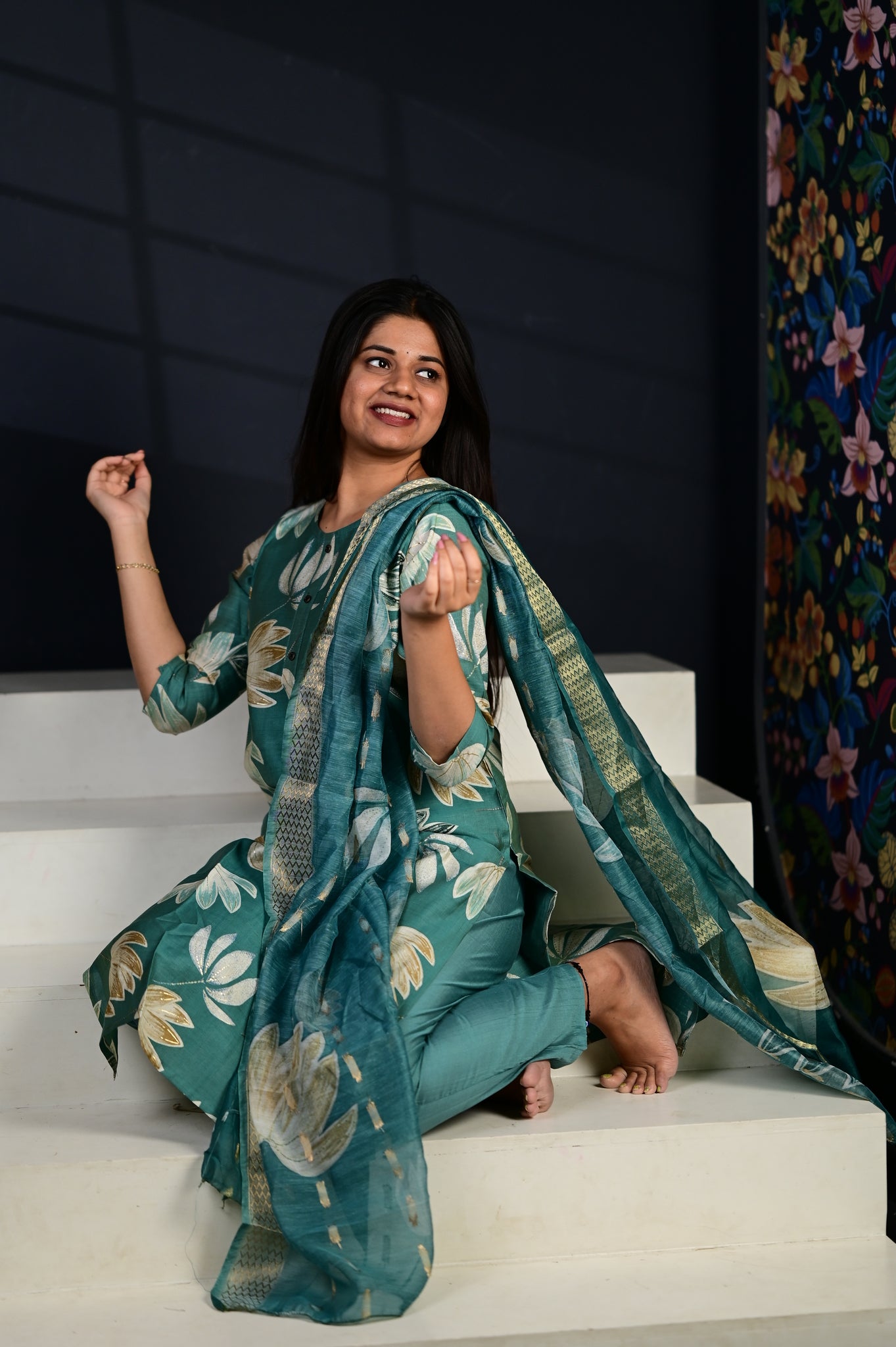 This sophisticated ensemble combines traditional craftsmanship with contemporary elegance, featuring meticulously tailored silhouettes that flatter and enhance. The verdant shade exudes grace and poise, making it an ideal choice for festive occasions, celebrations, or refined everyday wear..