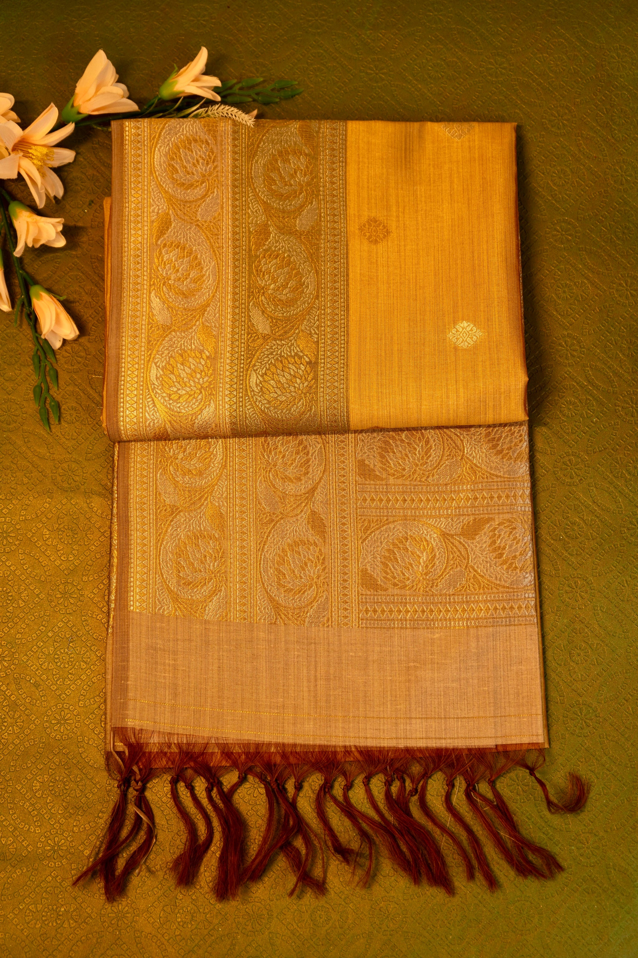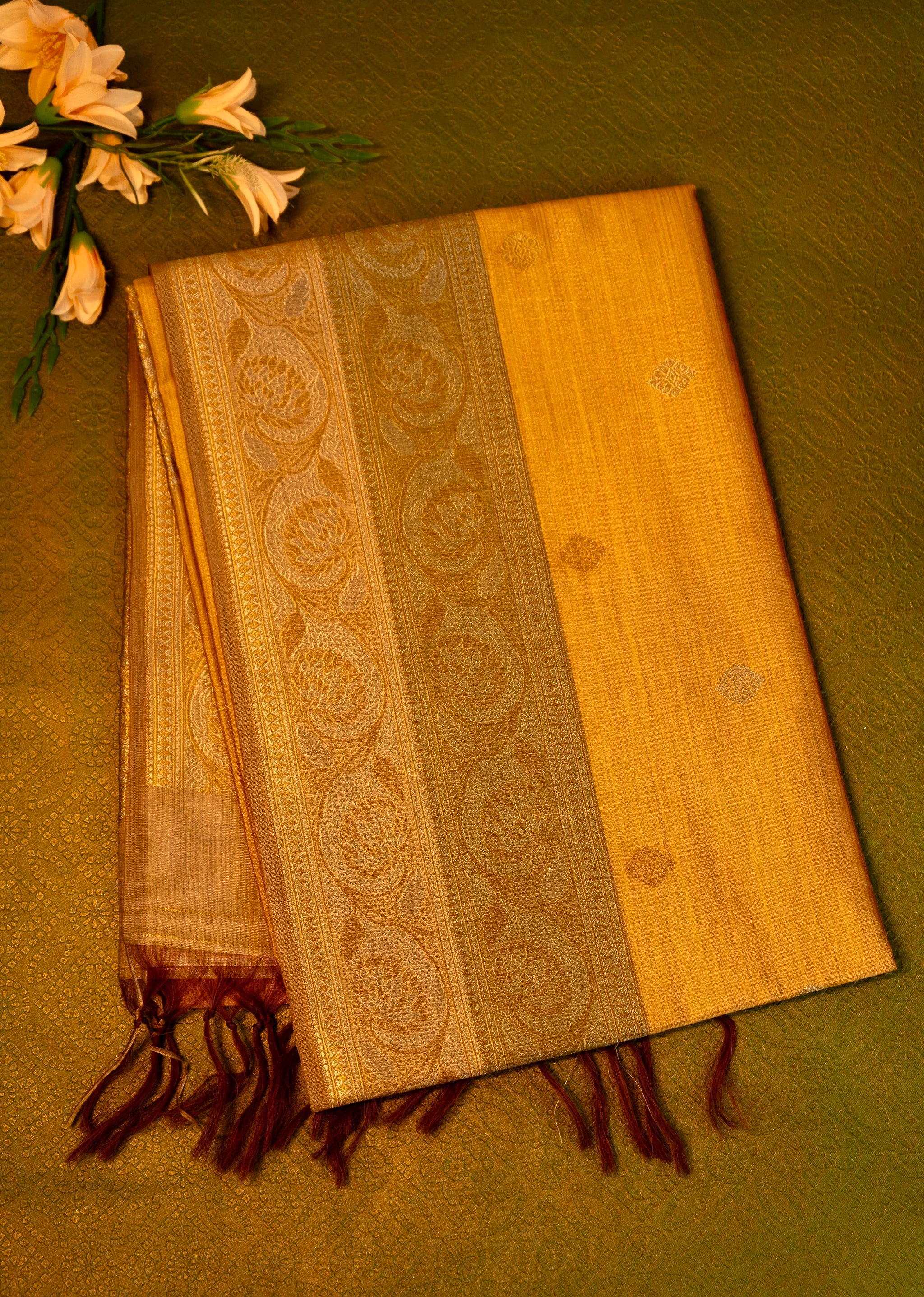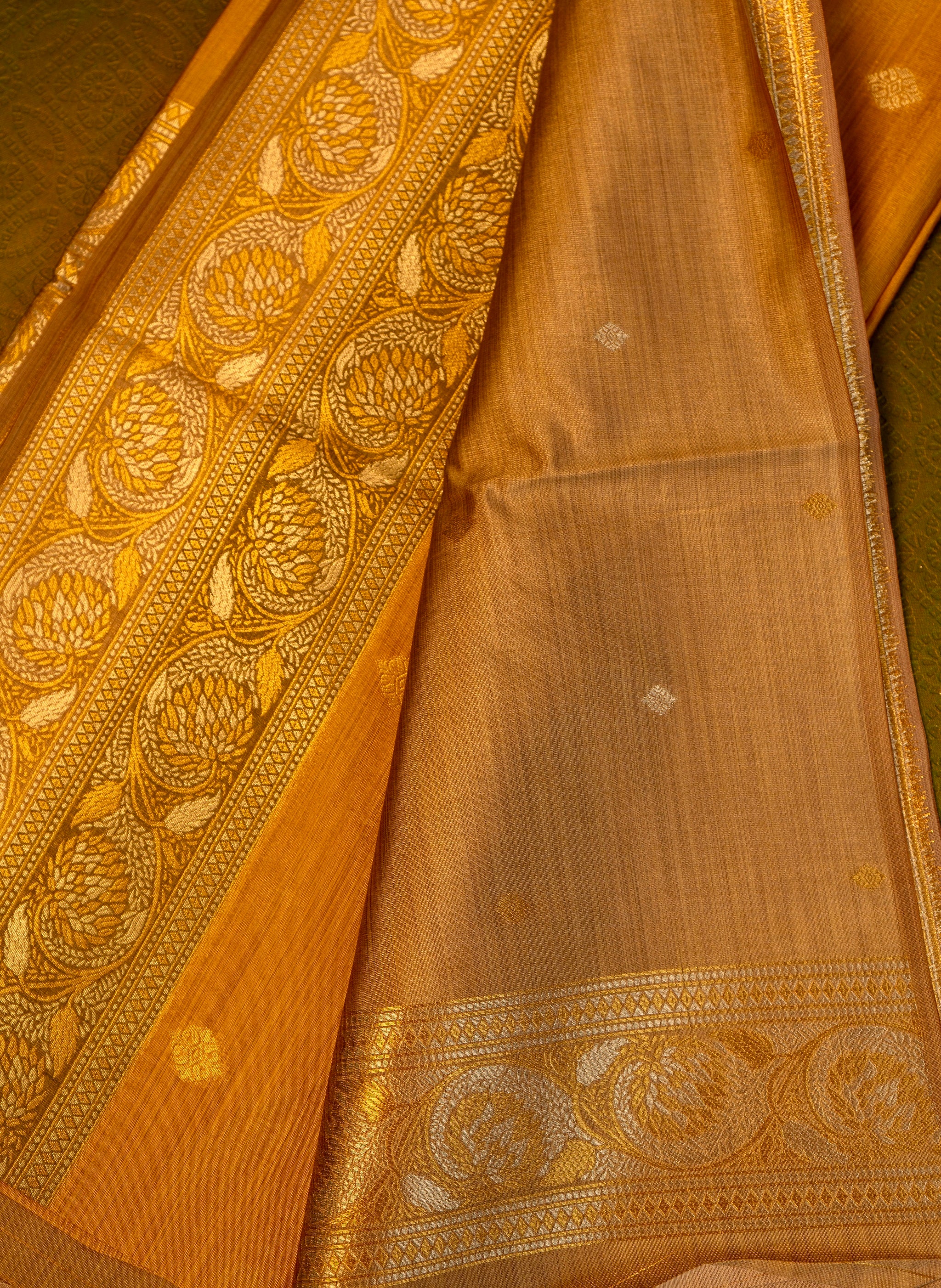This sophisticated designer saree in mustard yellow is accented with a luxurious gold zari border, highlighting its timeless elegance. The intricate craftsmanship and rich color combination make it a stunning choice for festive occasions and celebrations.