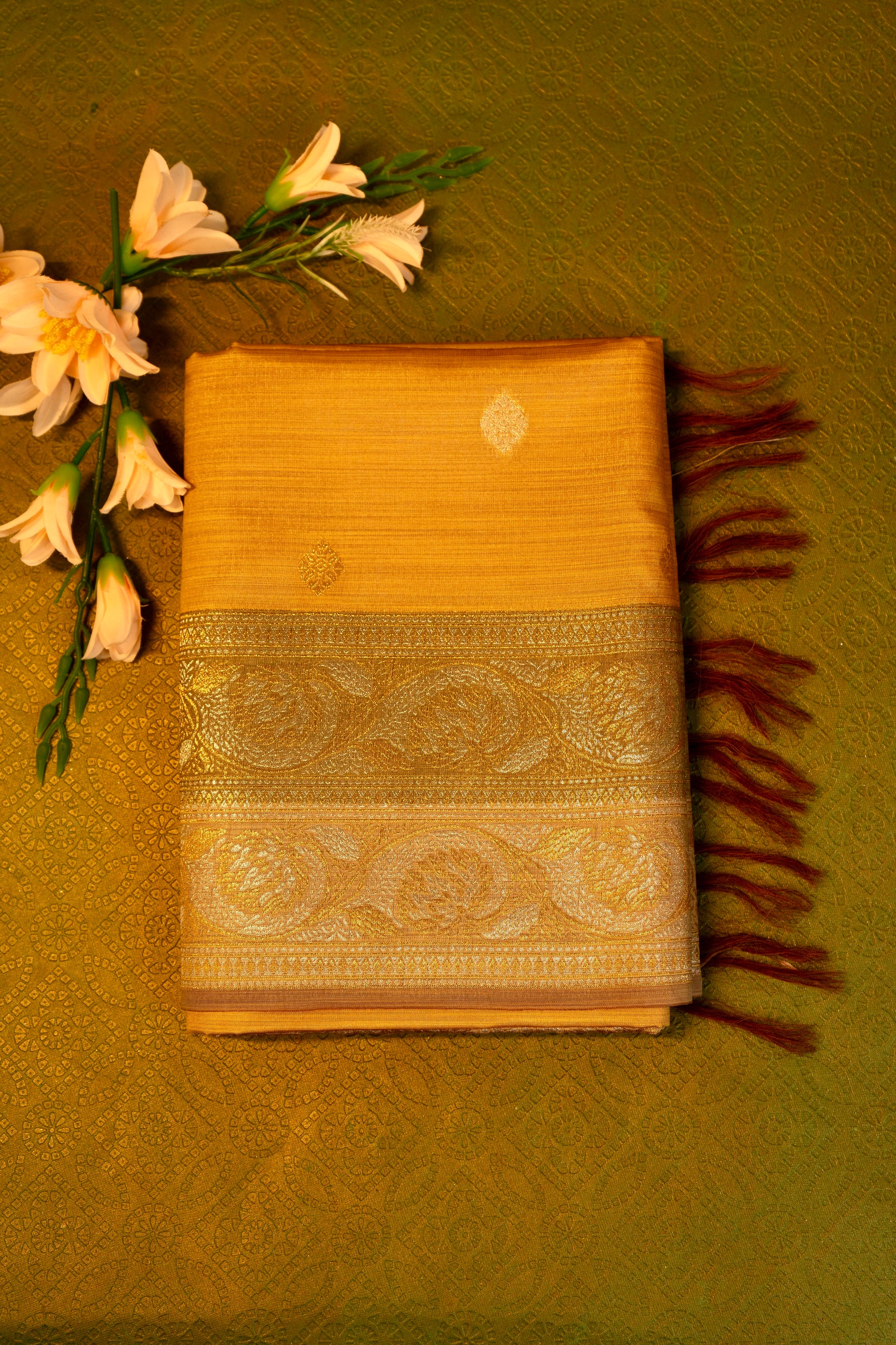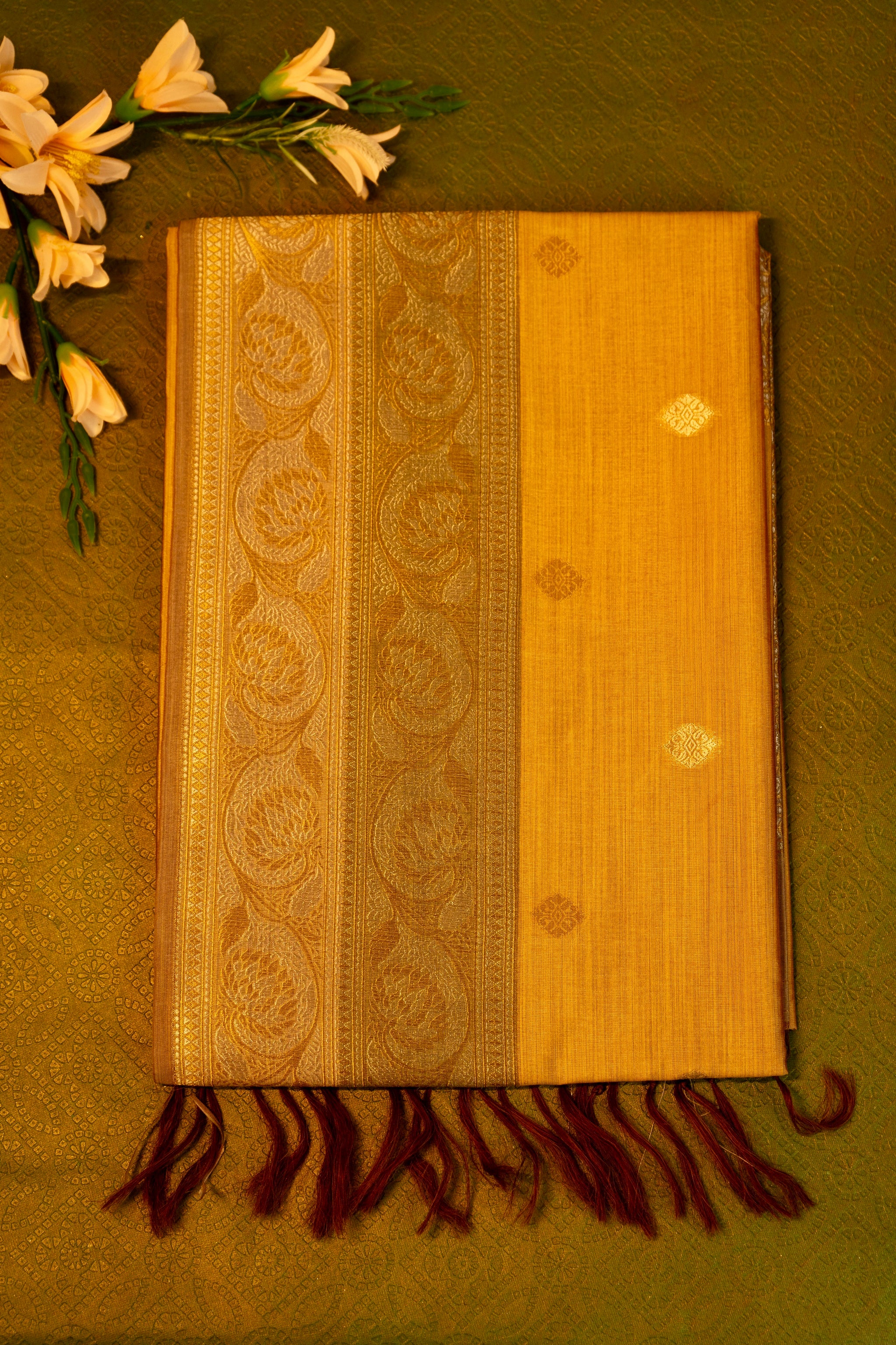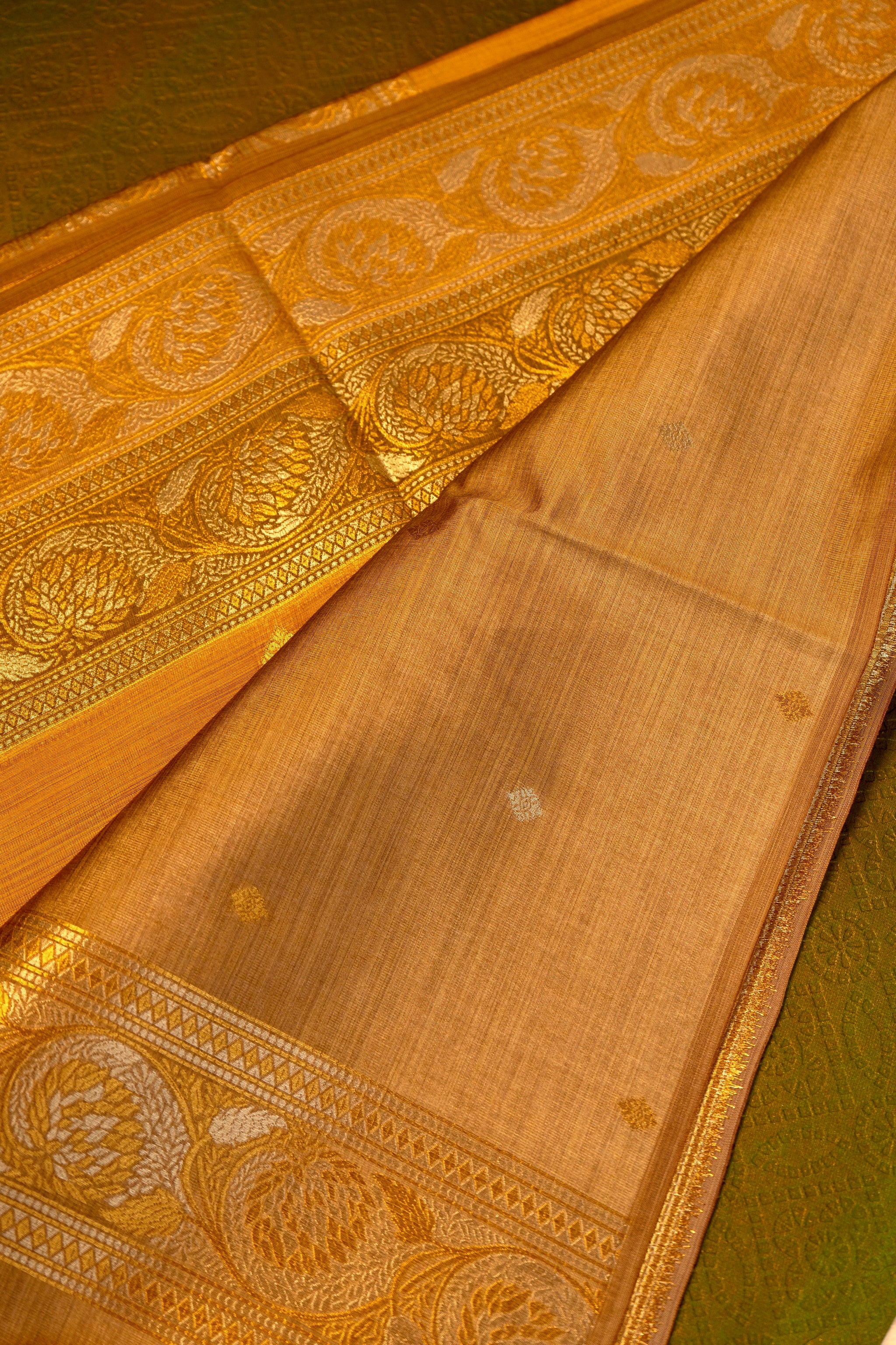 This sophisticated designer saree in mustard yellow is accented with a luxurious gold zari border, highlighting its timeless elegance. The intricate craftsmanship and rich color combination make it a stunning choice for festive occasions and celebrations.