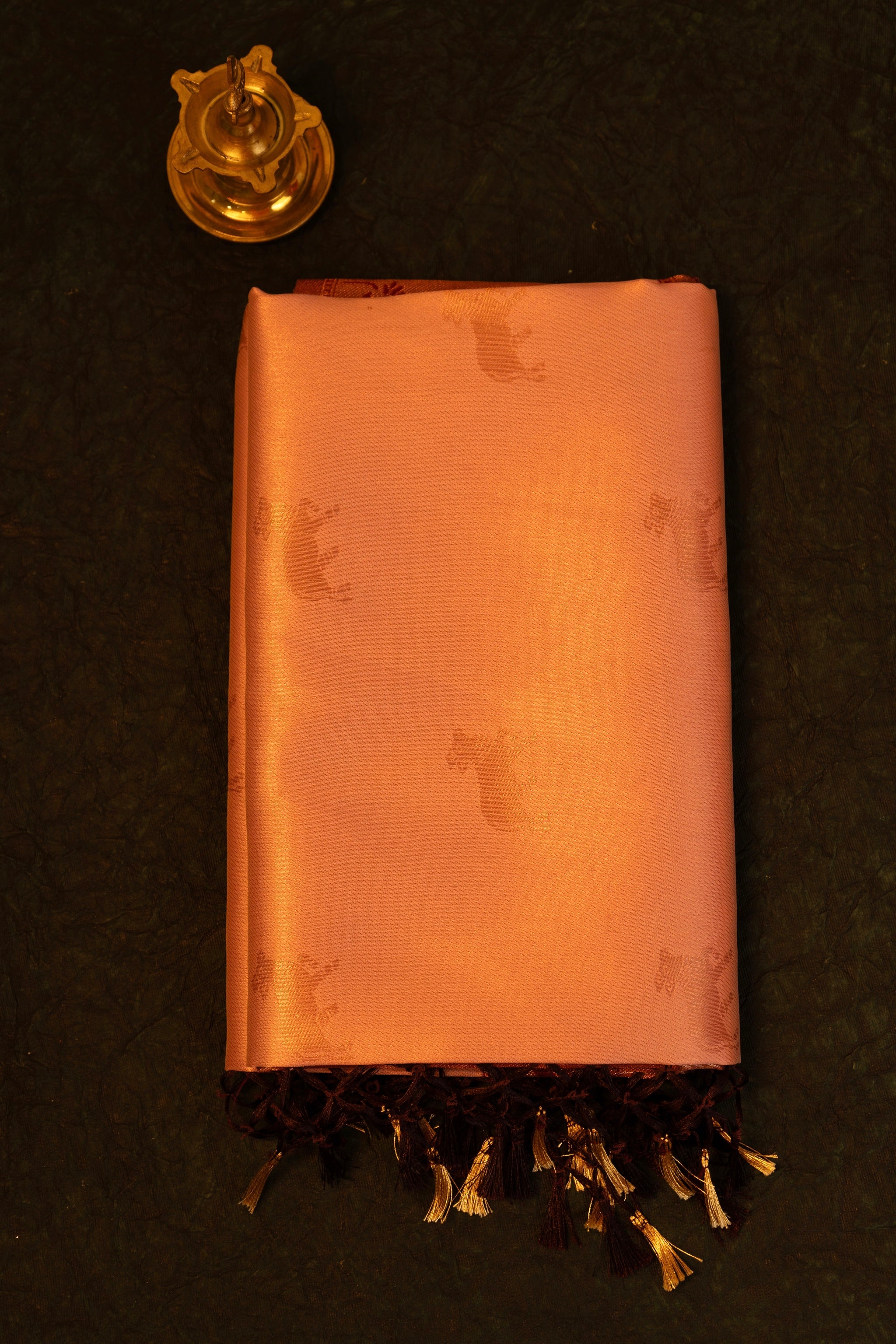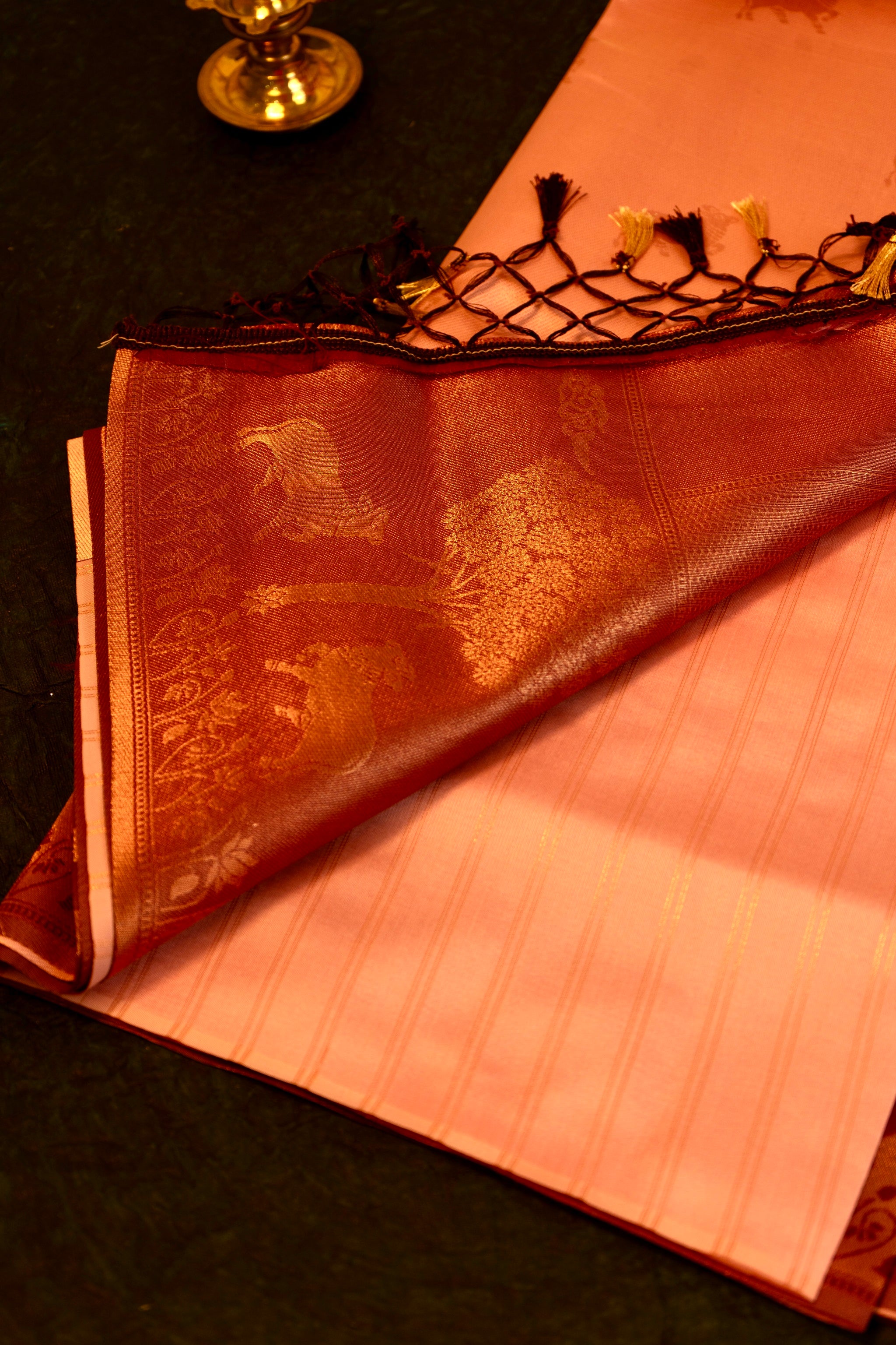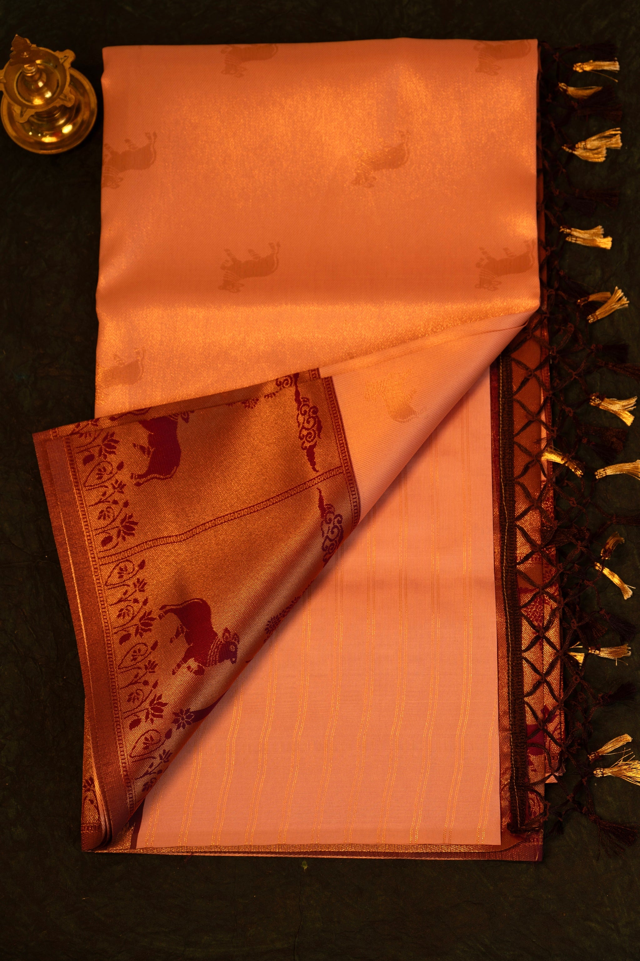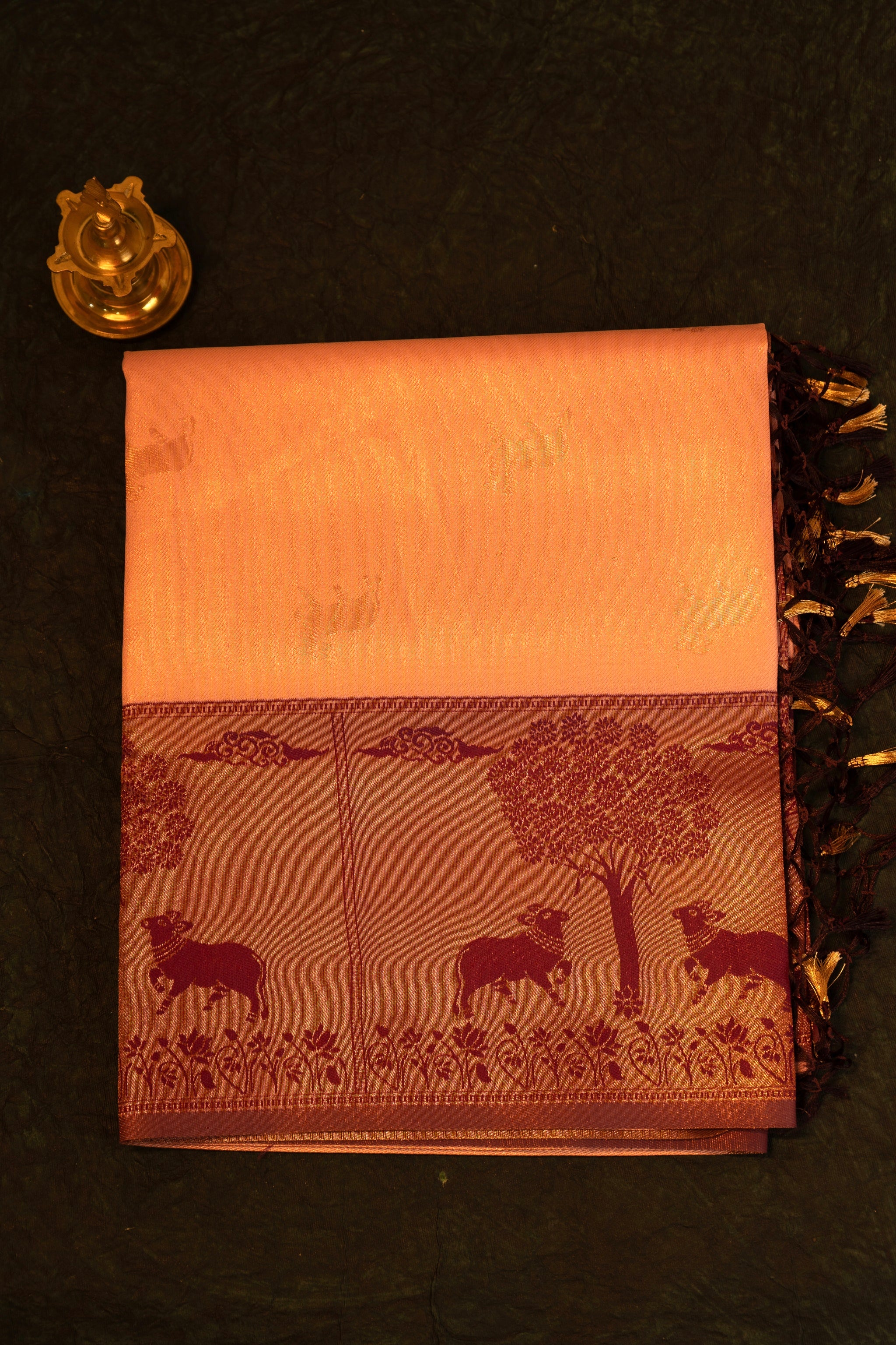 This sophisticated designer saree in peach is complemented by a rich maroon zari border featuring elegant cow and tree motifs. The subtle woven cow patterns throughout the body add a delicate charm, making it an ideal choice for graceful and traditional occasions.