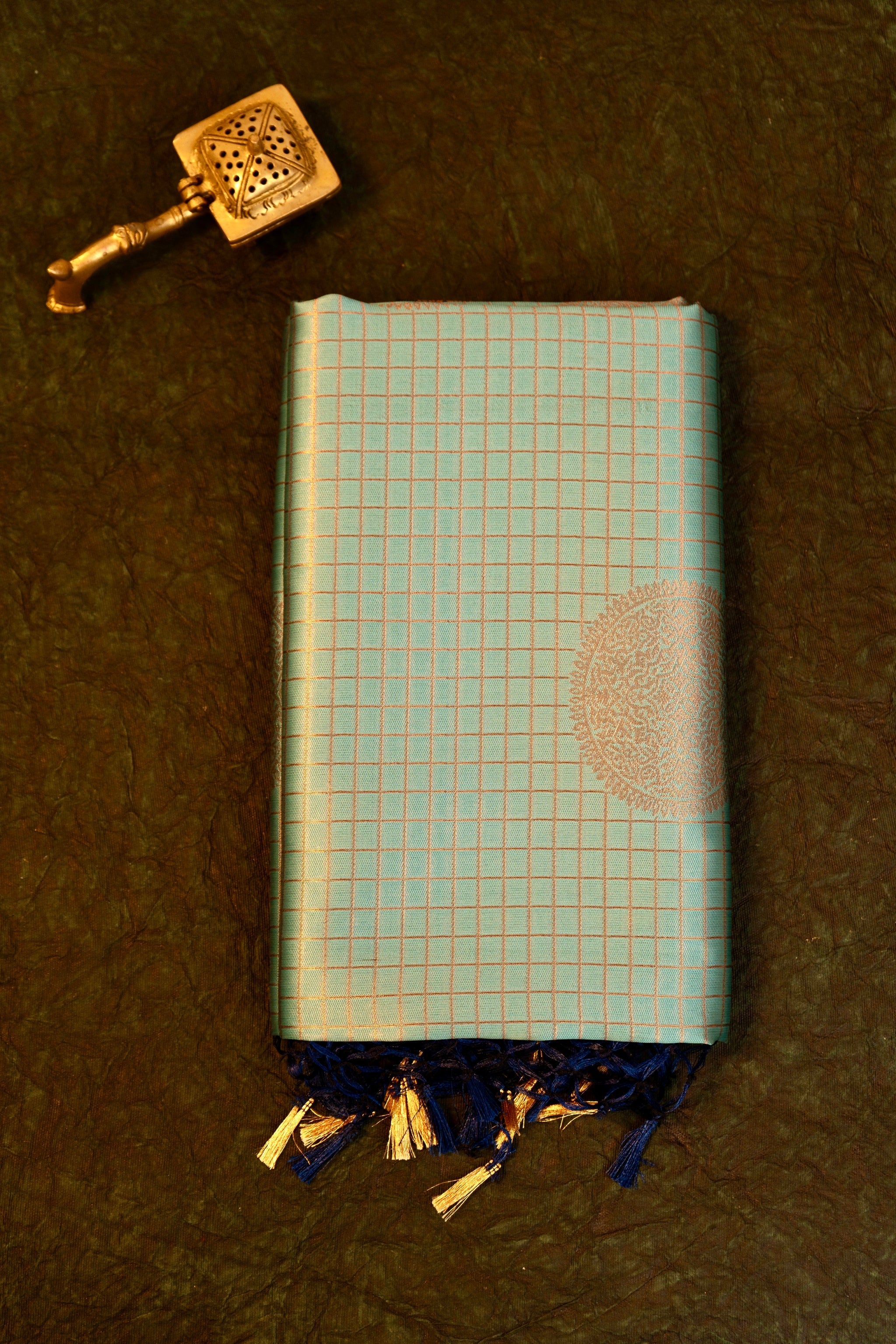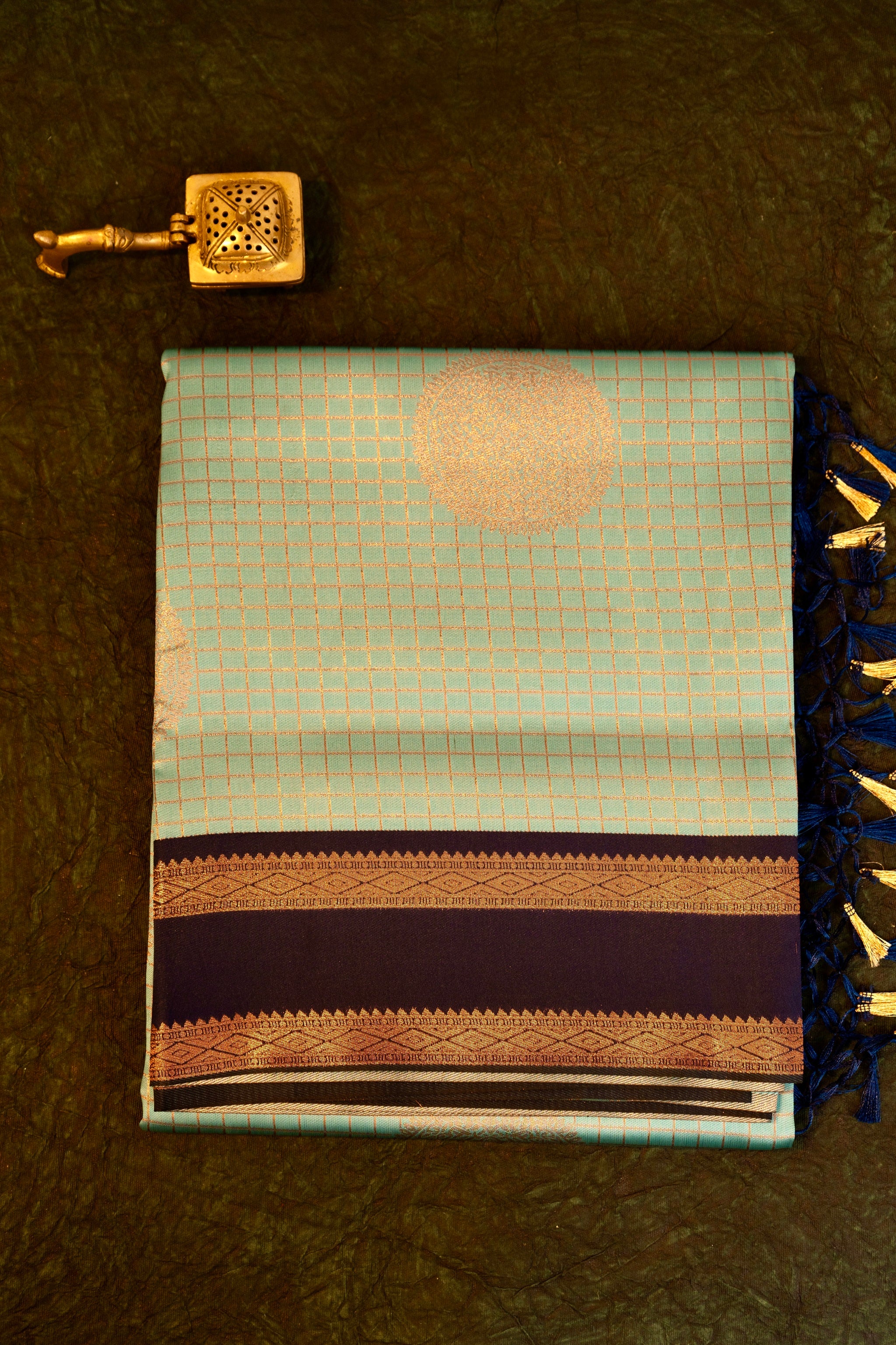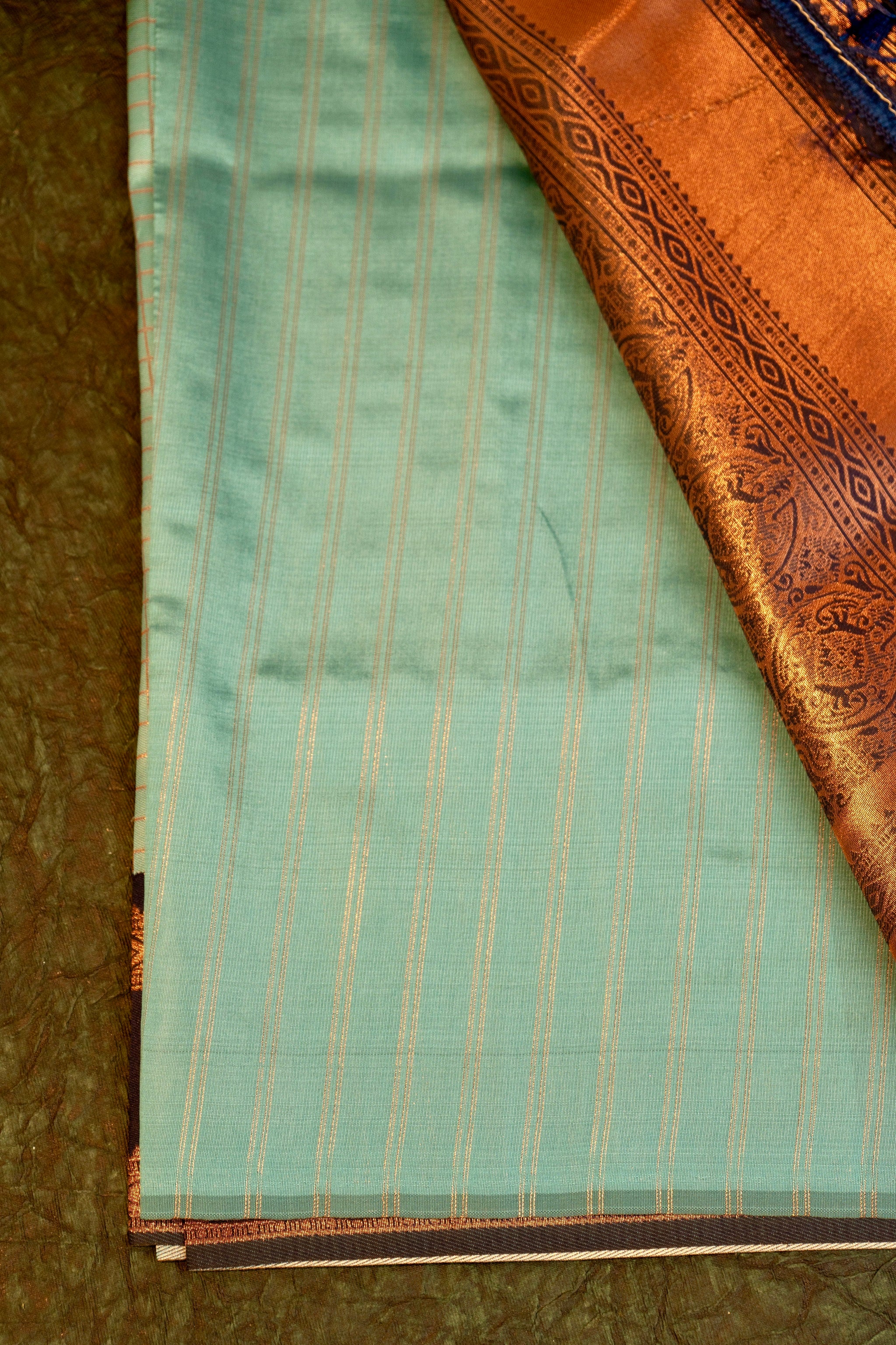 This sophisticated designer saree features a pista pastel green body paired with a dark brown border, beautifully accented by intricate gold zari work. The harmonious color blend and exquisite detailing create a graceful ensemble perfect for special occasions.
