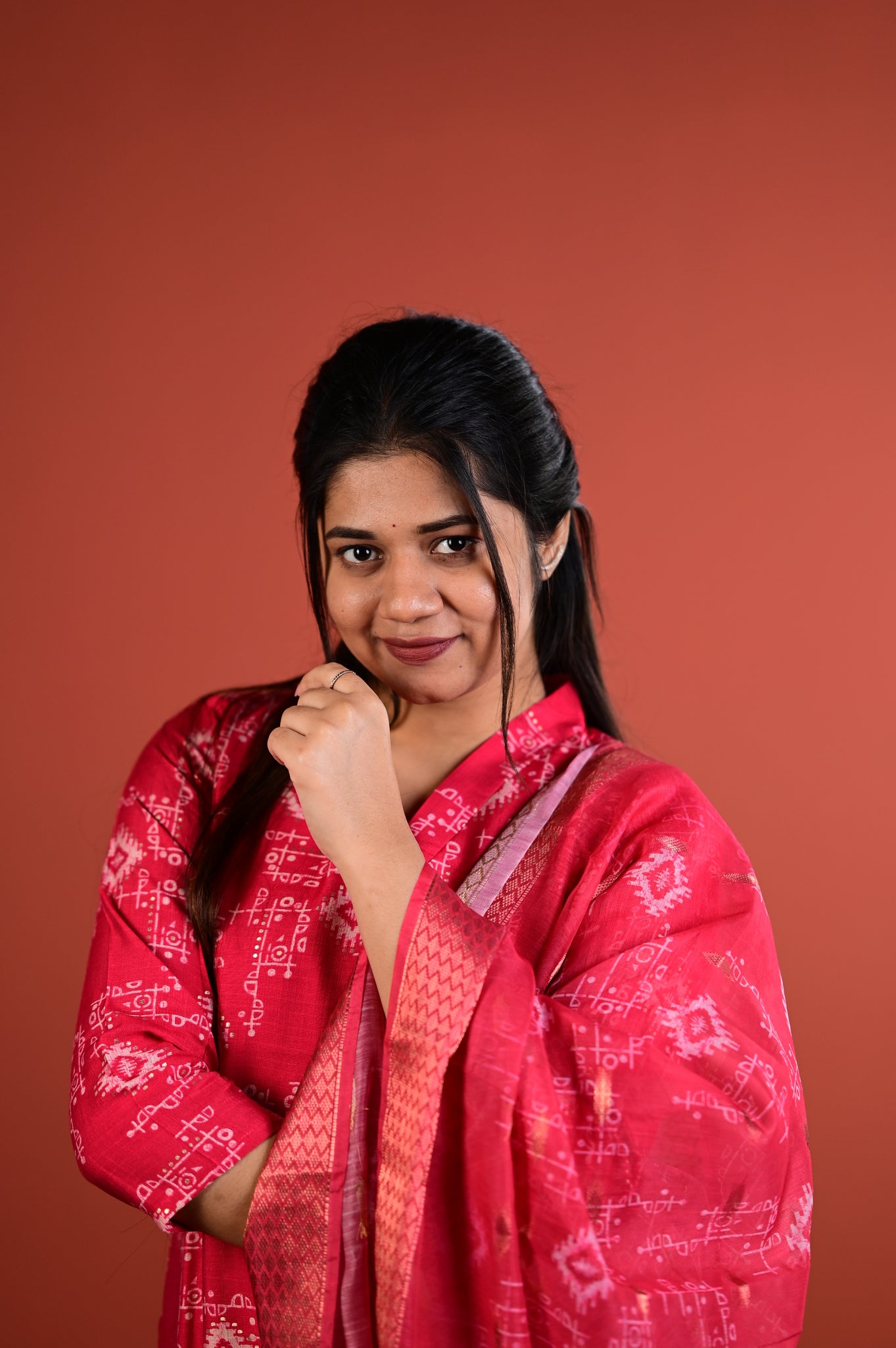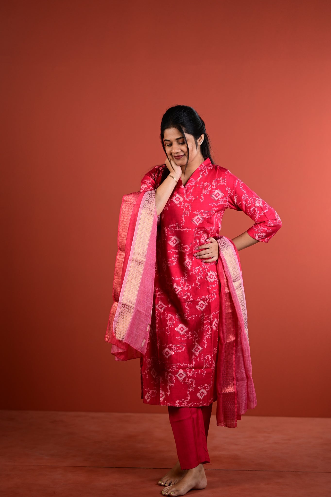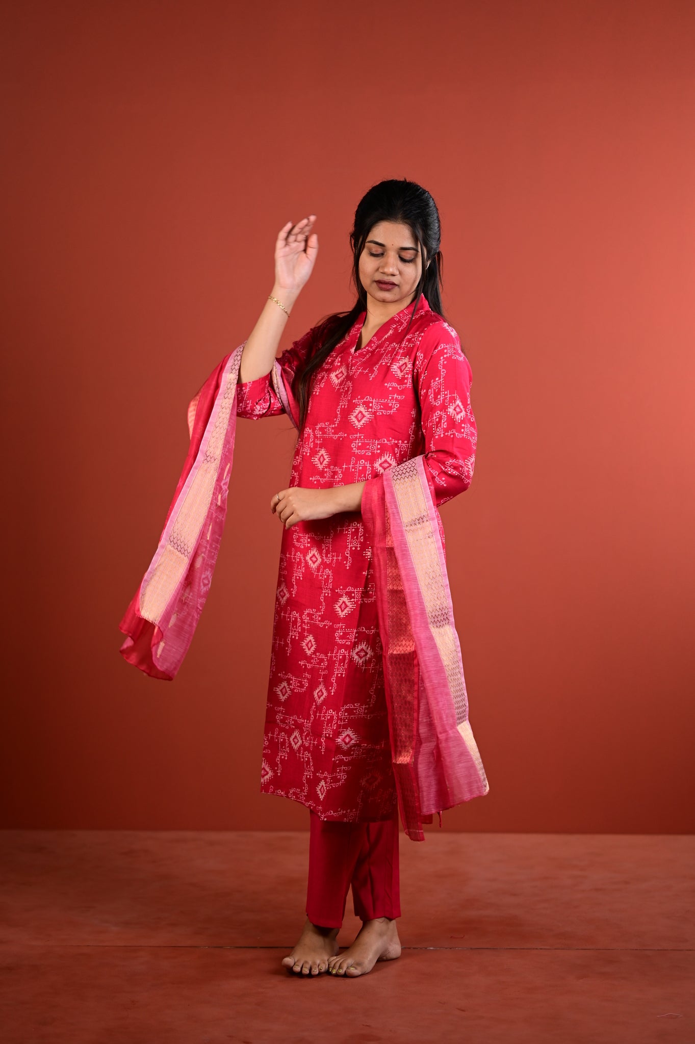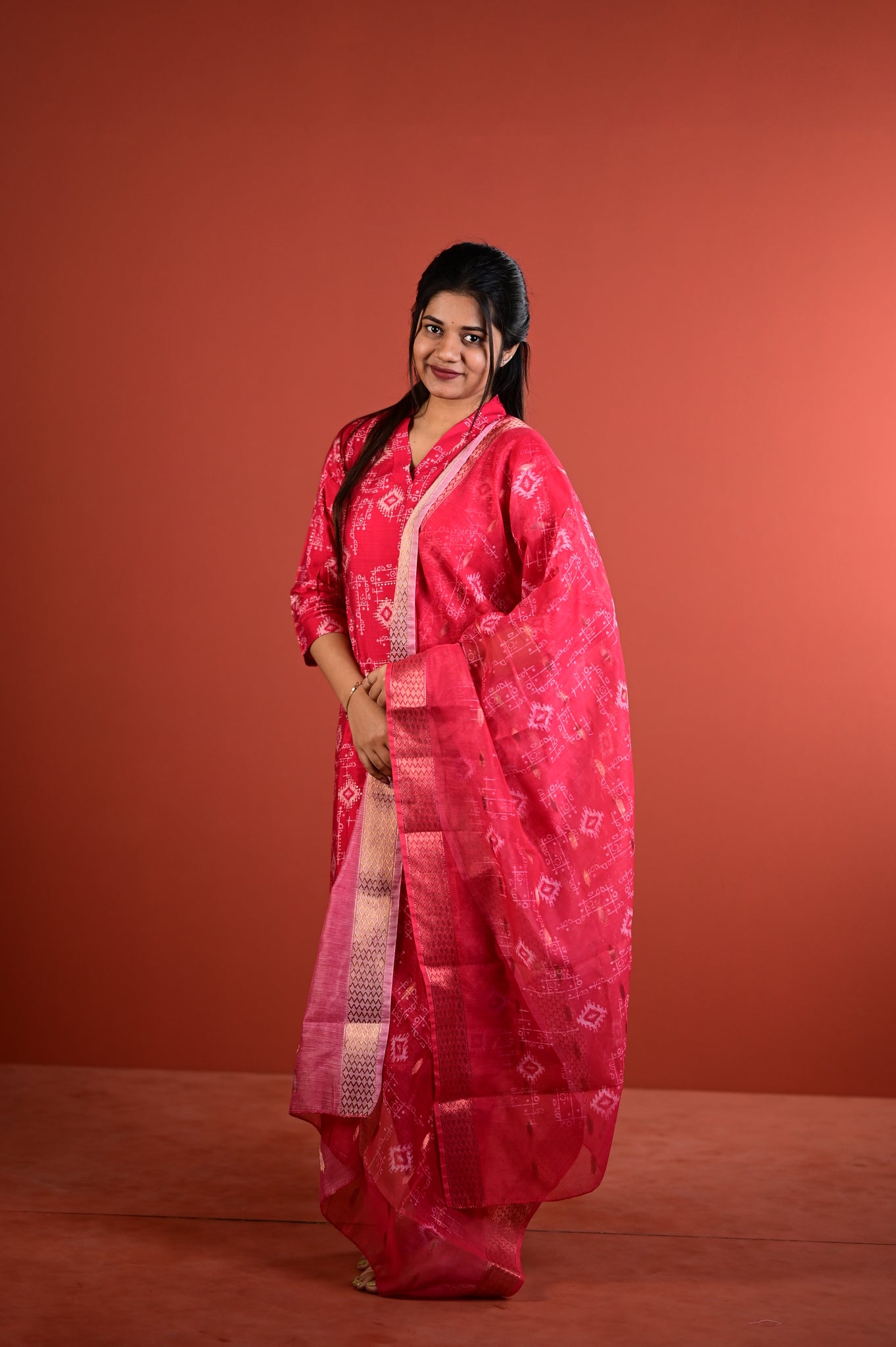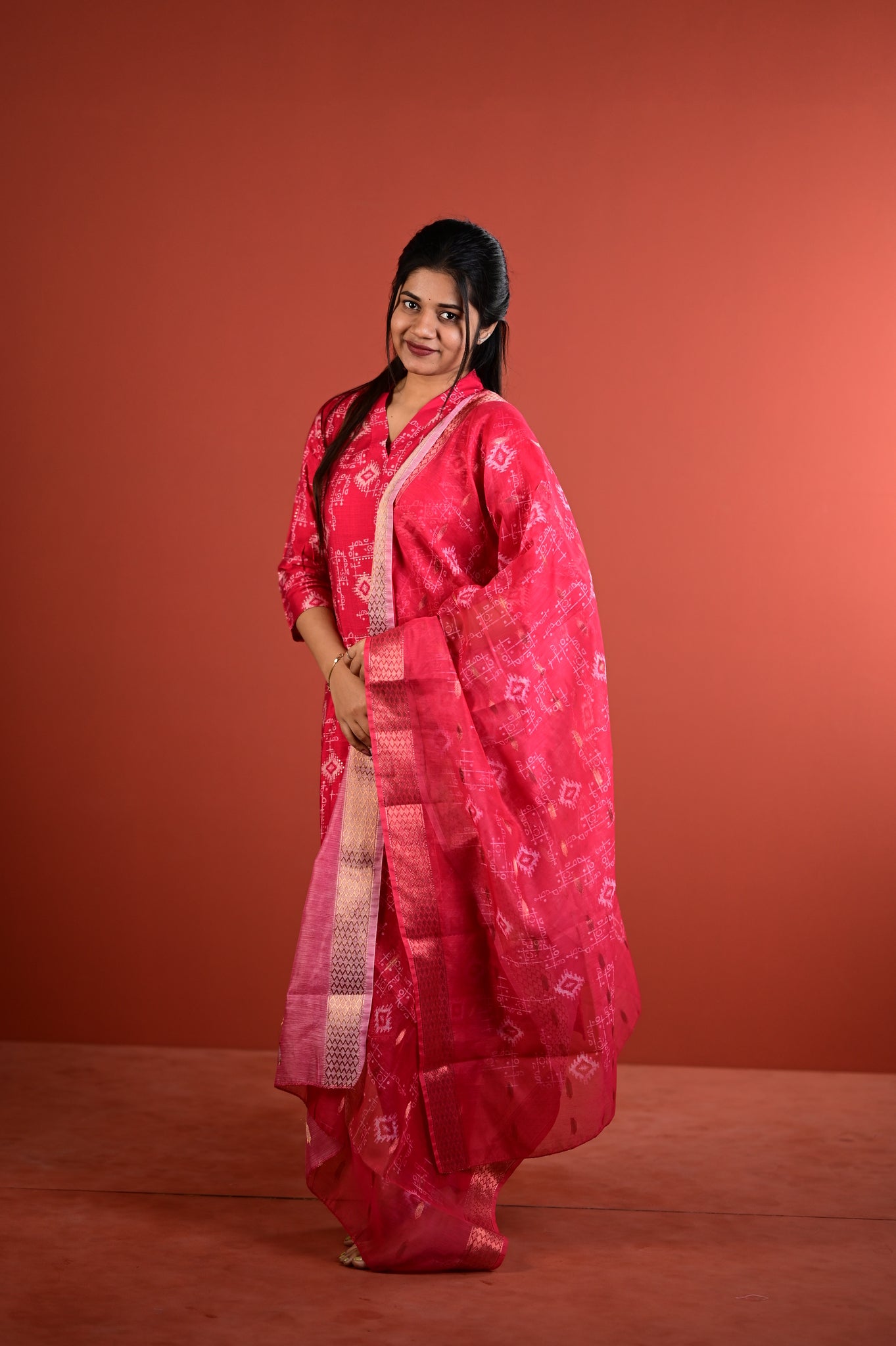 This refined ensemble features the muted sophistication of sage red, a shade that exudes understated luxury and versatility. Crafted with meticulous attention to detail, the Dharshini collection embodies the timeless artistry of Indian silks, making it an ideal choice for festive occasions, celebrations, or refined everyday wear.Â