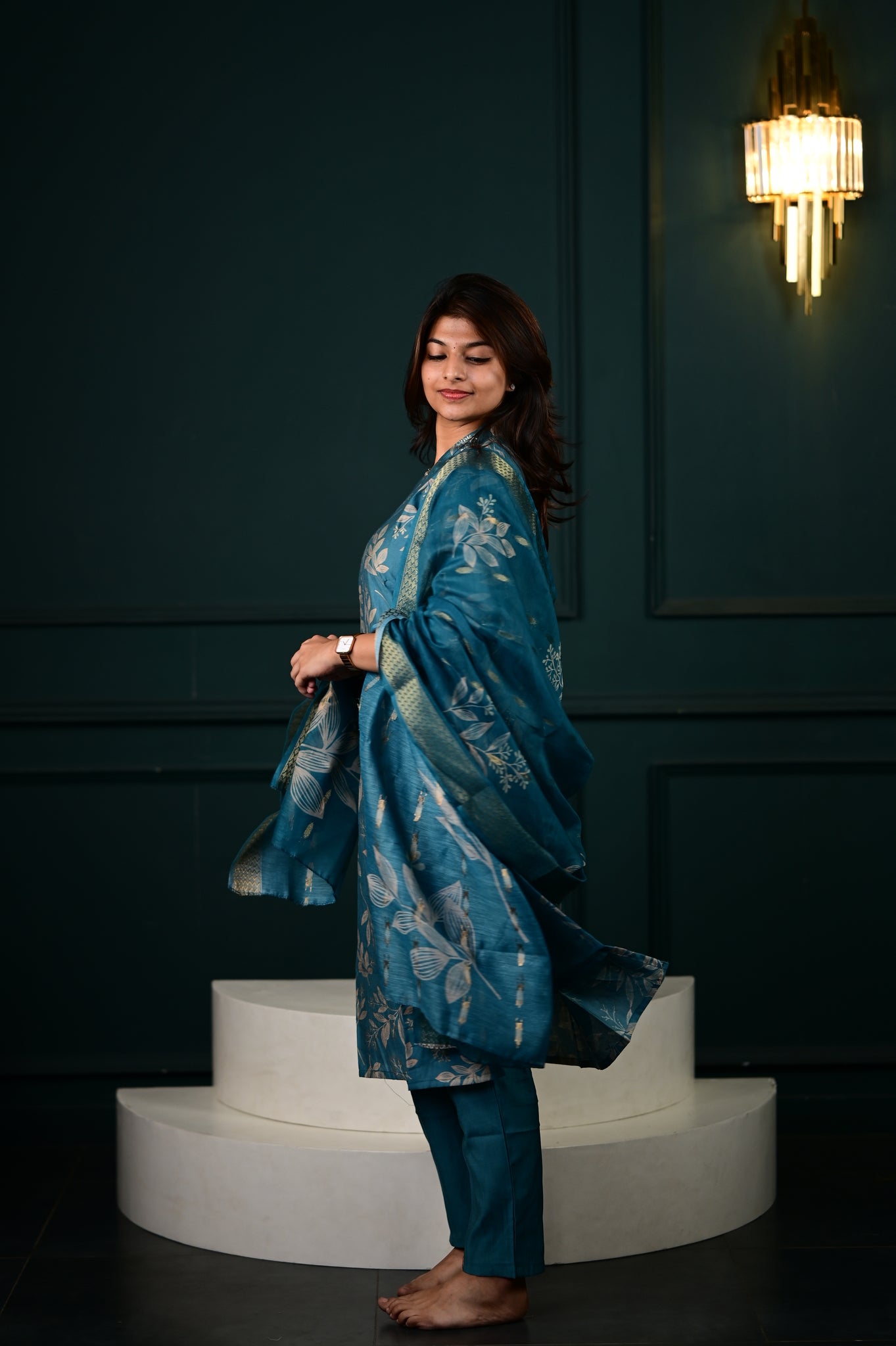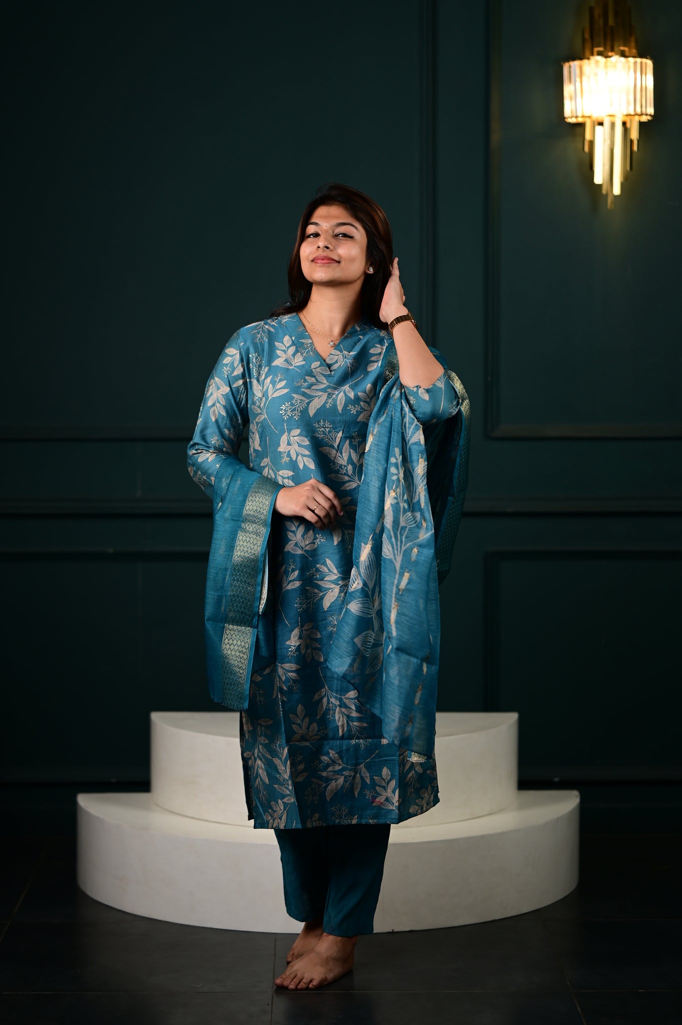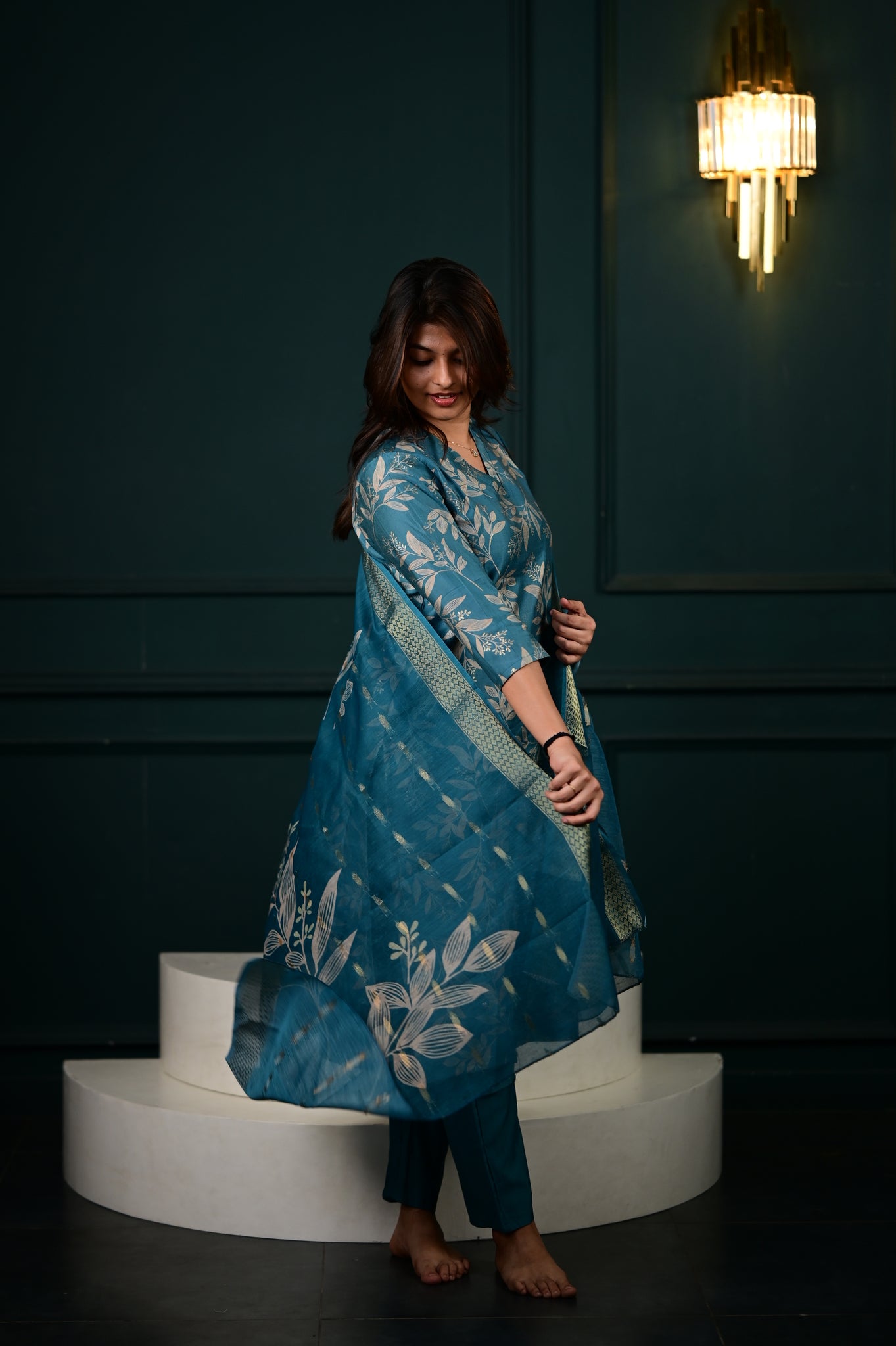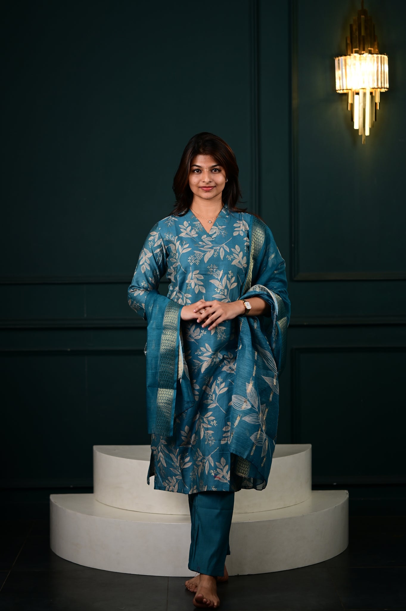 The Hasini salwar set in blue represents a masterfully executed interpretation of traditional Indian formal wear. Crafted with precision, this three-piece ensemble showcases expert tailoring that ensures optimal fit and movement.