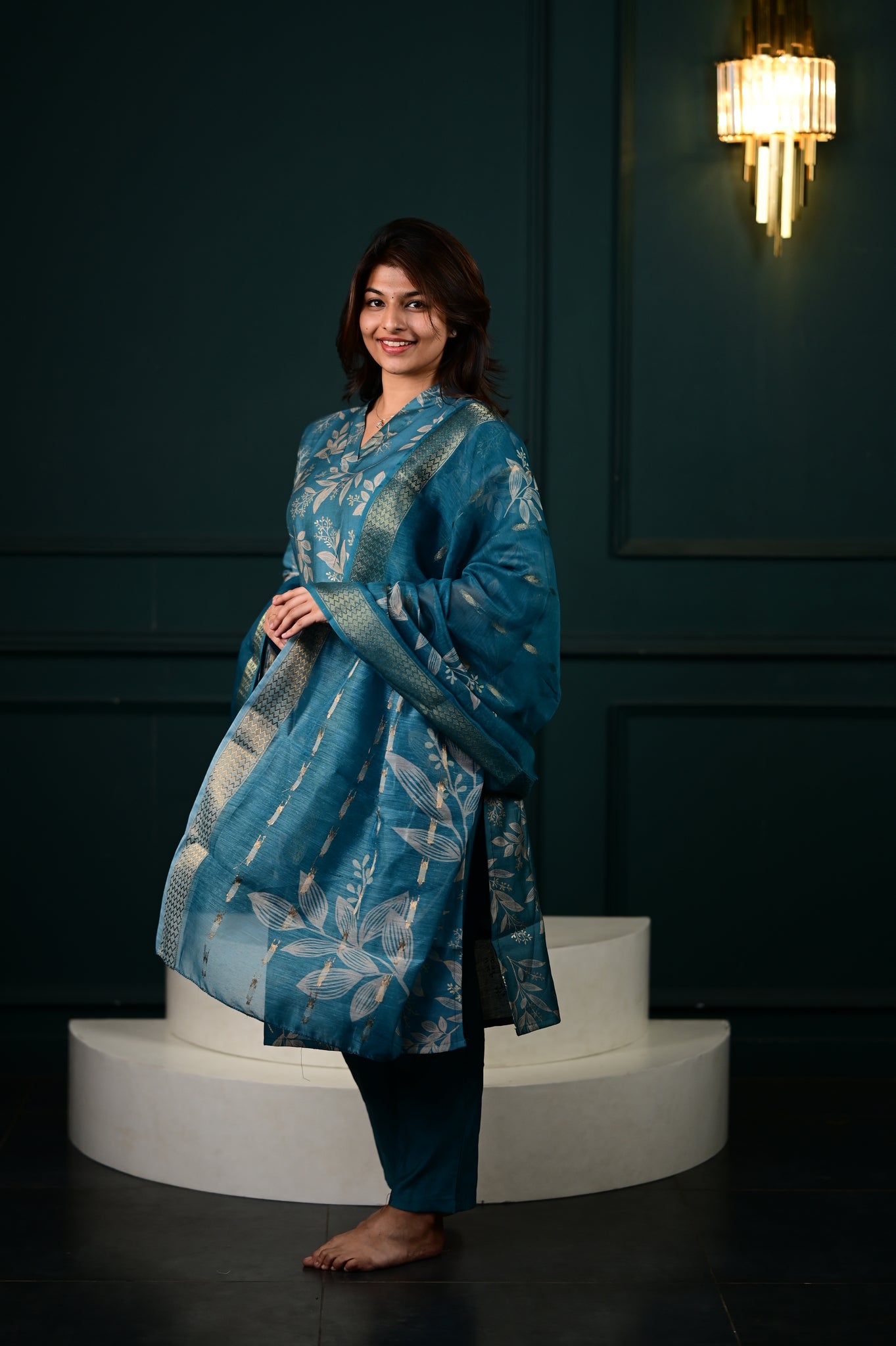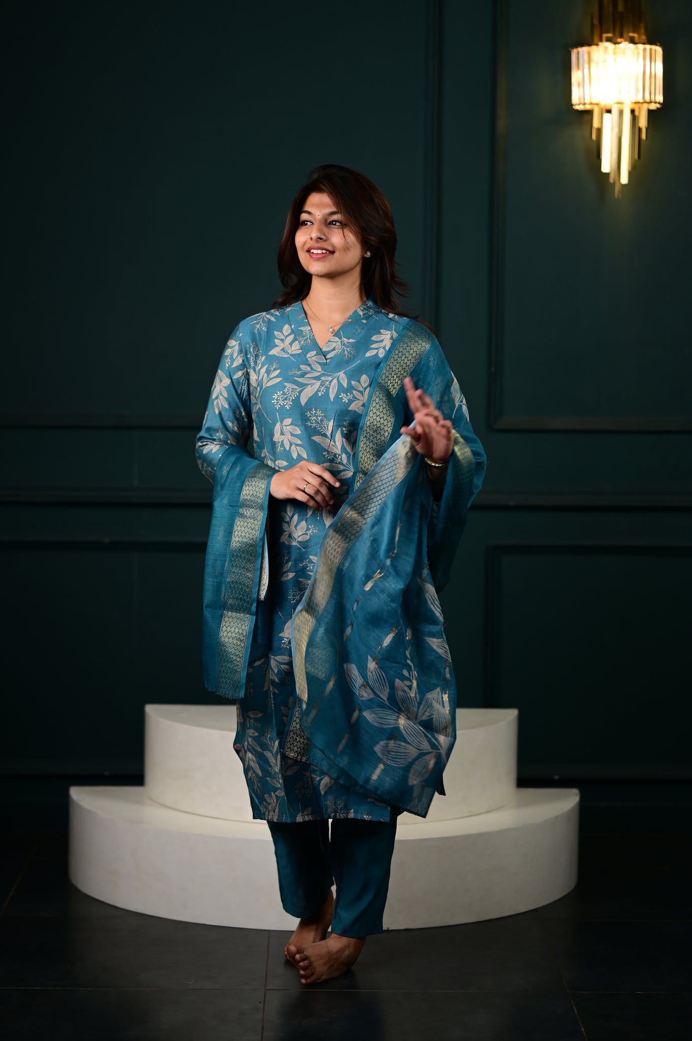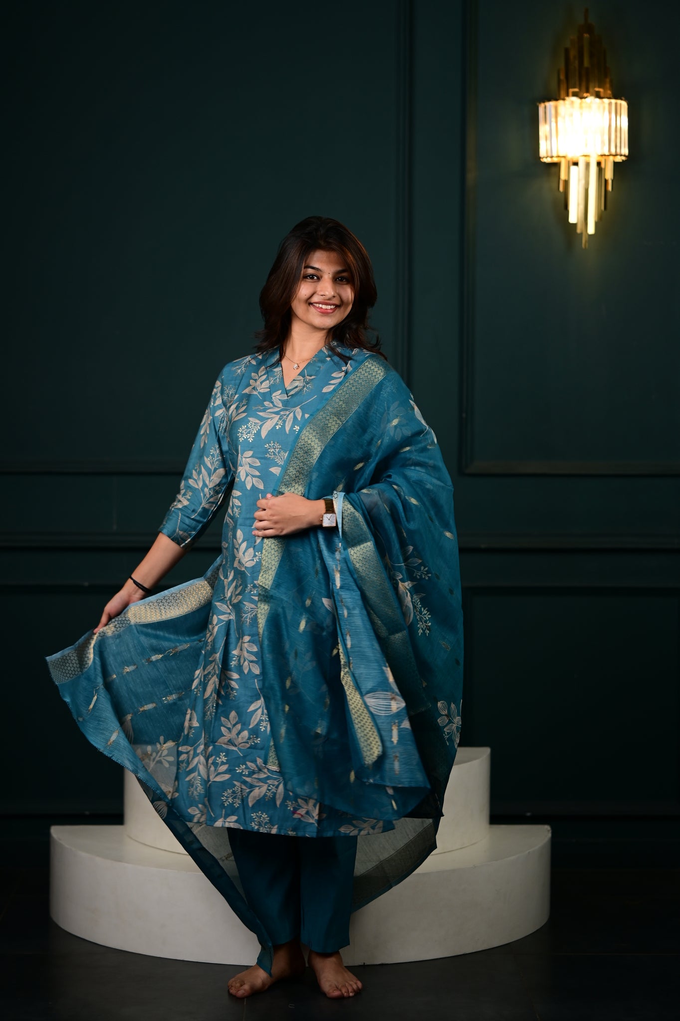 The Hasini salwar set in blue represents a masterfully executed interpretation of traditional Indian formal wear. Crafted with precision, this three-piece ensemble showcases expert tailoring that ensures optimal fit and movement.