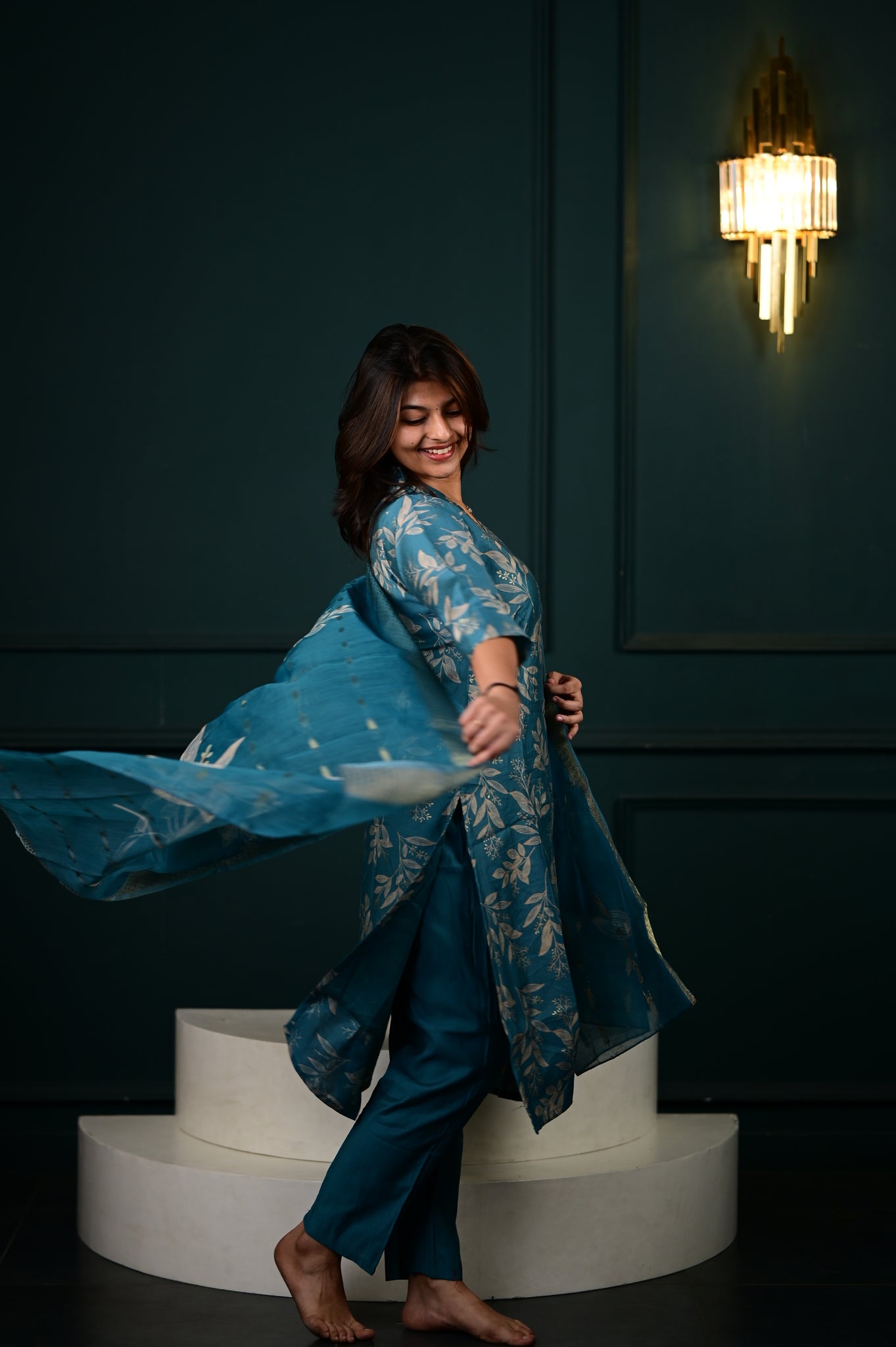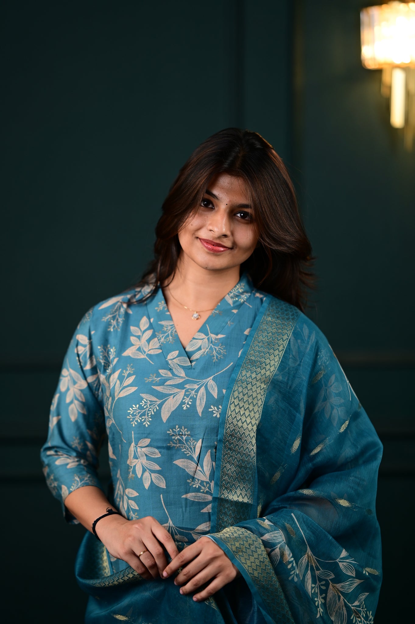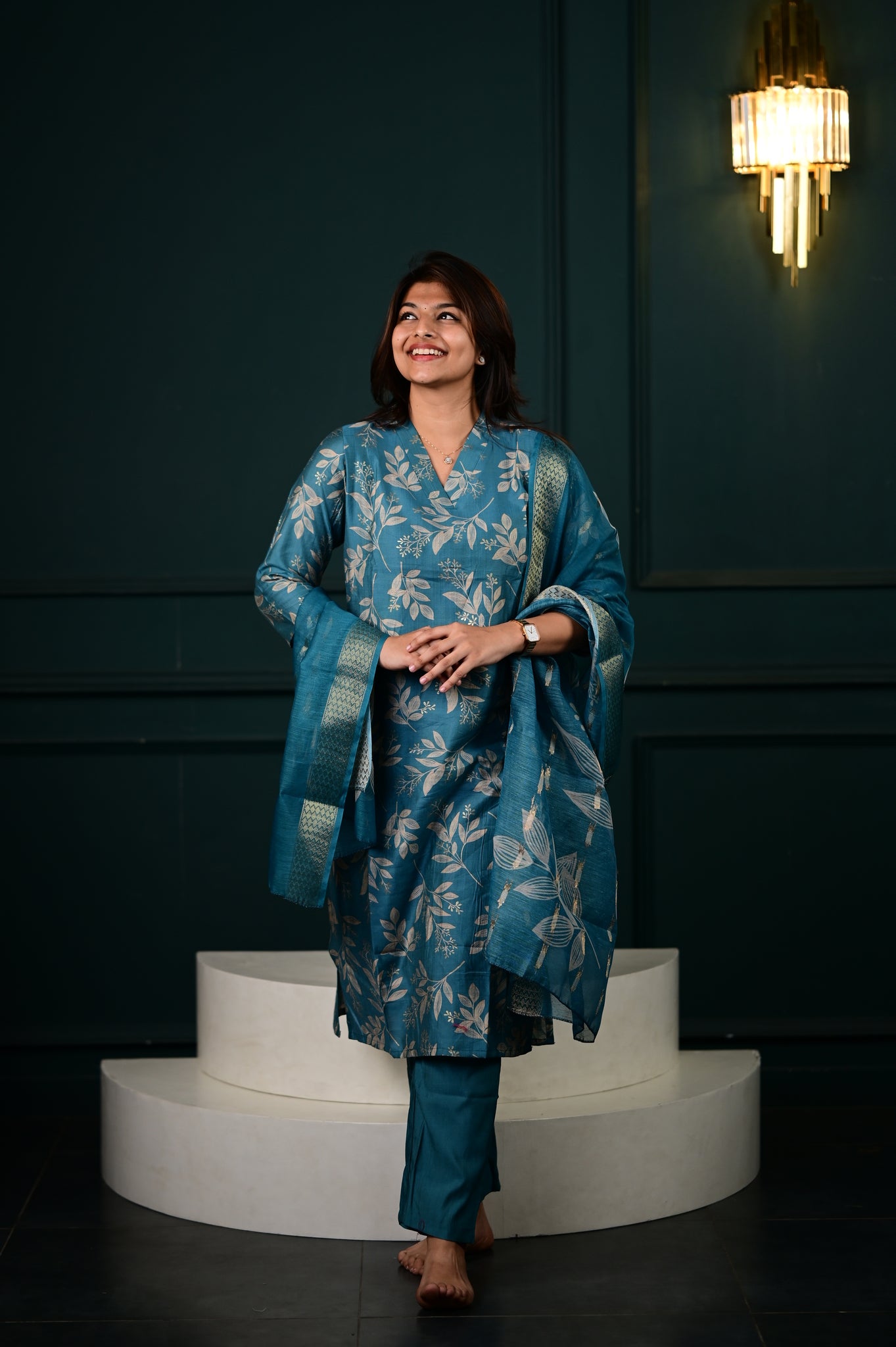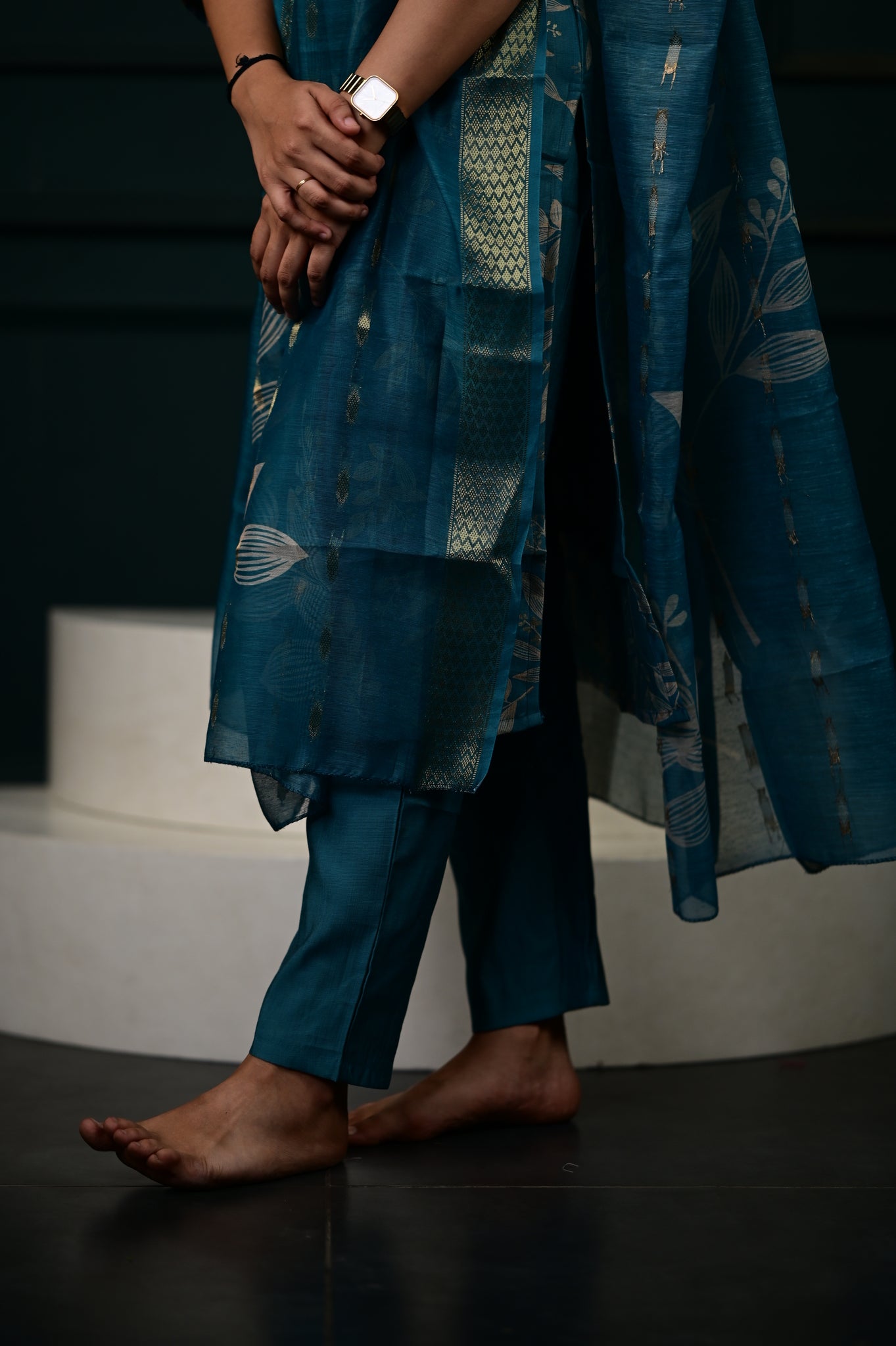 The Hasini salwar set in blue represents a masterfully executed interpretation of traditional Indian formal wear. Crafted with precision, this three-piece ensemble showcases expert tailoring that ensures optimal fit and movement.