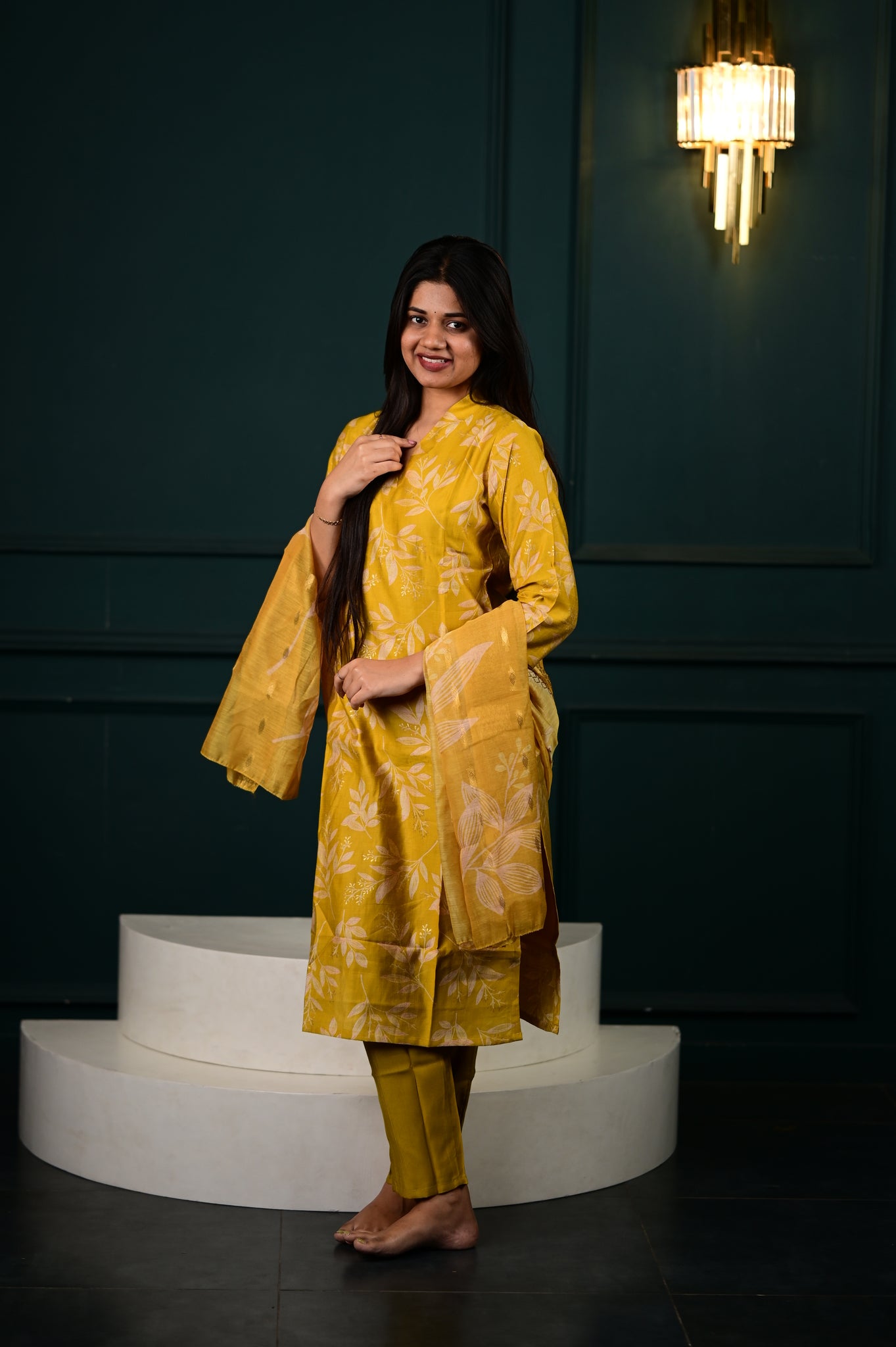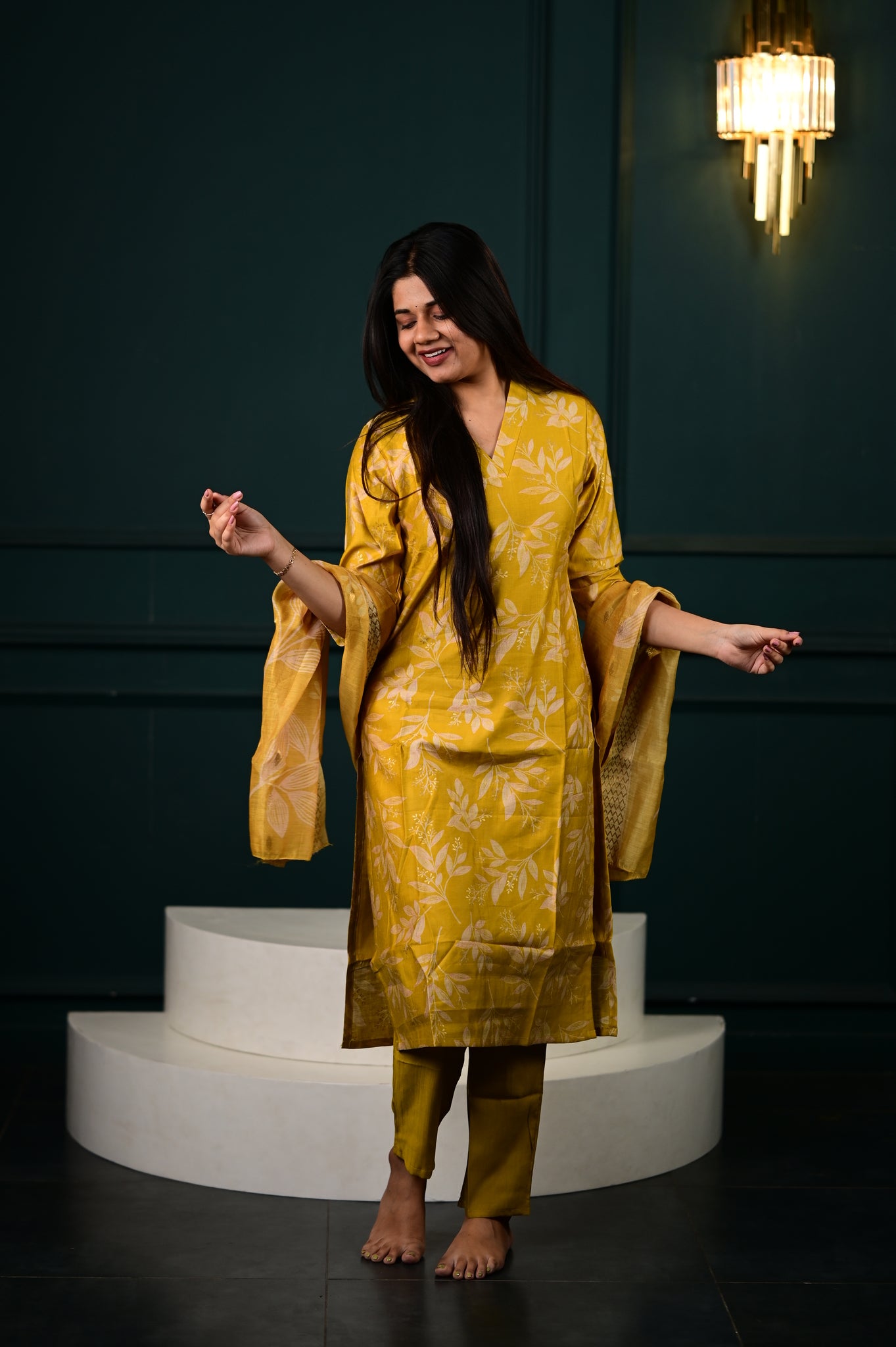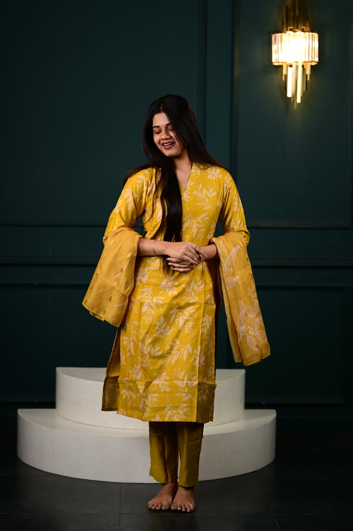 Elevate your ethnic wardrobe with the Hasini salwar set in a radiant yellow hue. This sophisticated ensemble combines traditional craftsmanship with contemporary elegance, featuring meticulously tailored pieces that drape beautifully.