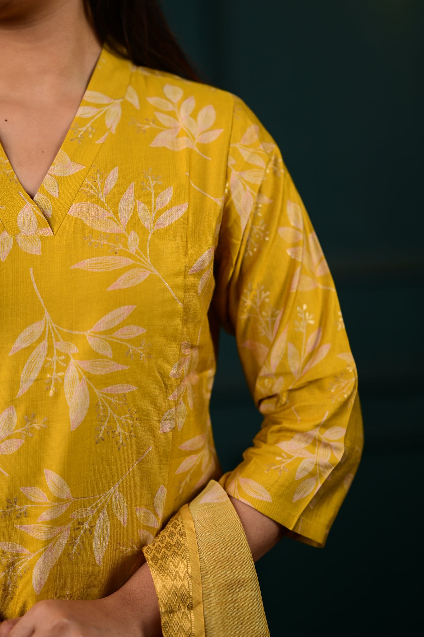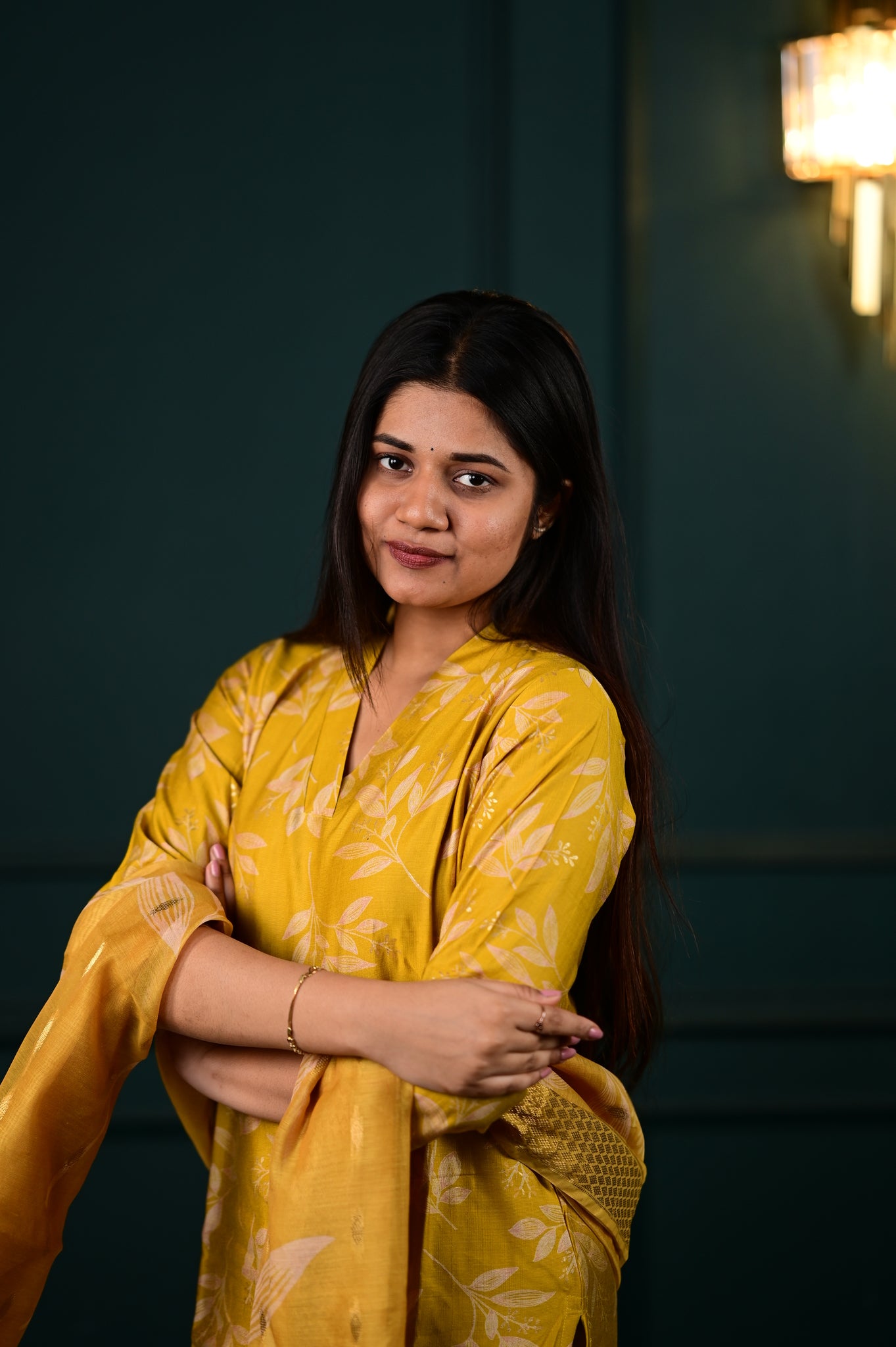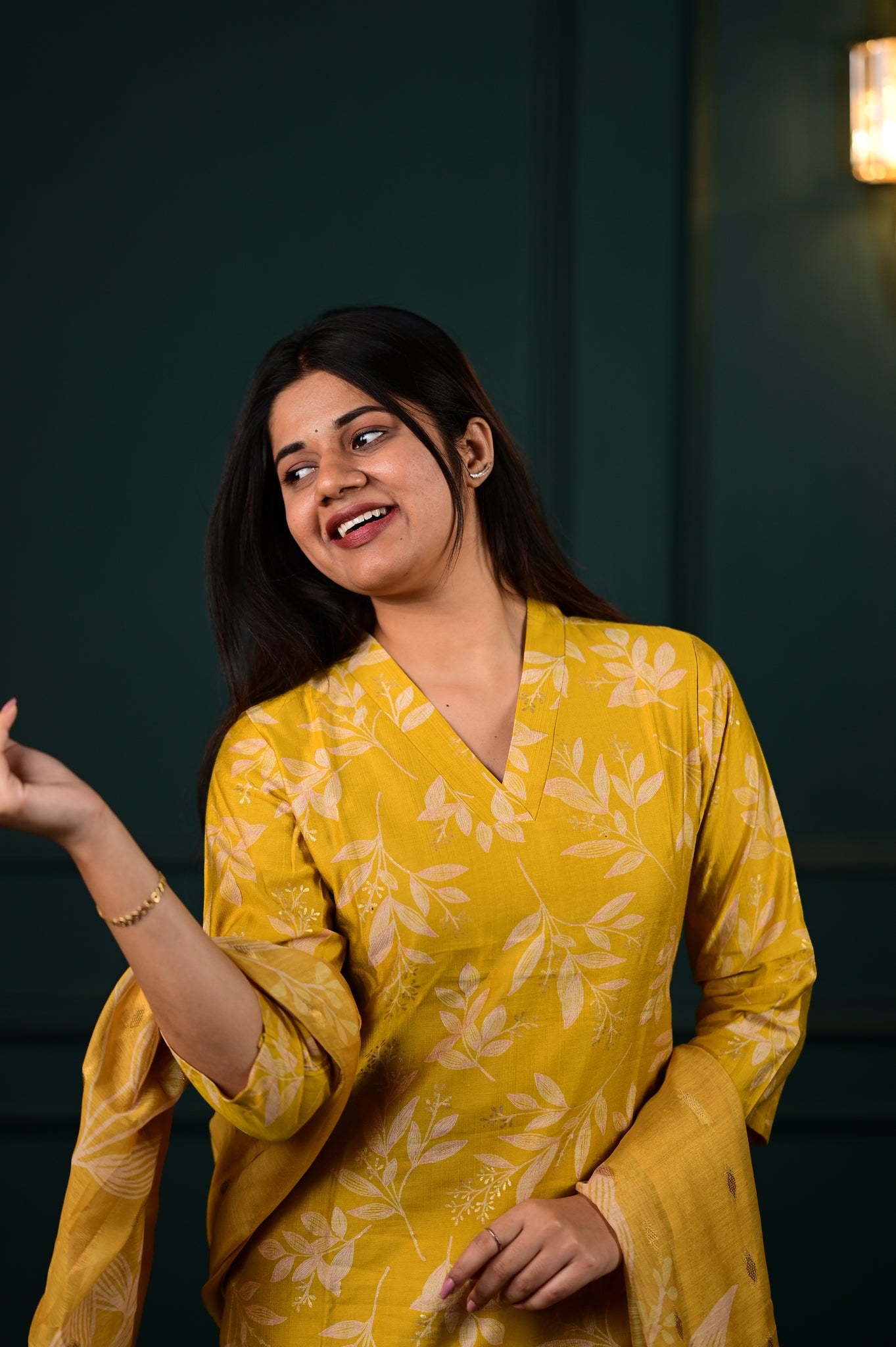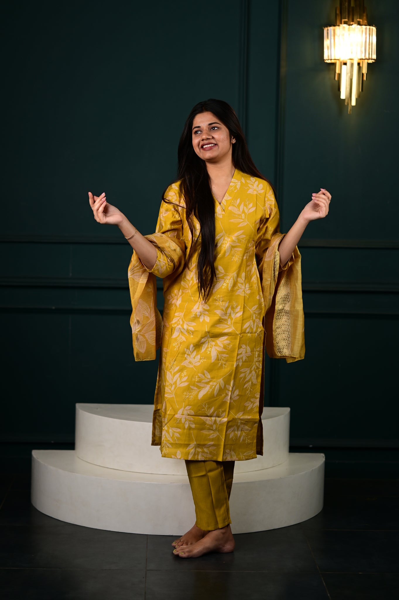 Elevate your ethnic wardrobe with the Hasini salwar set in a radiant yellow hue. This sophisticated ensemble combines traditional craftsmanship with contemporary elegance, featuring meticulously tailored pieces that drape beautifully.