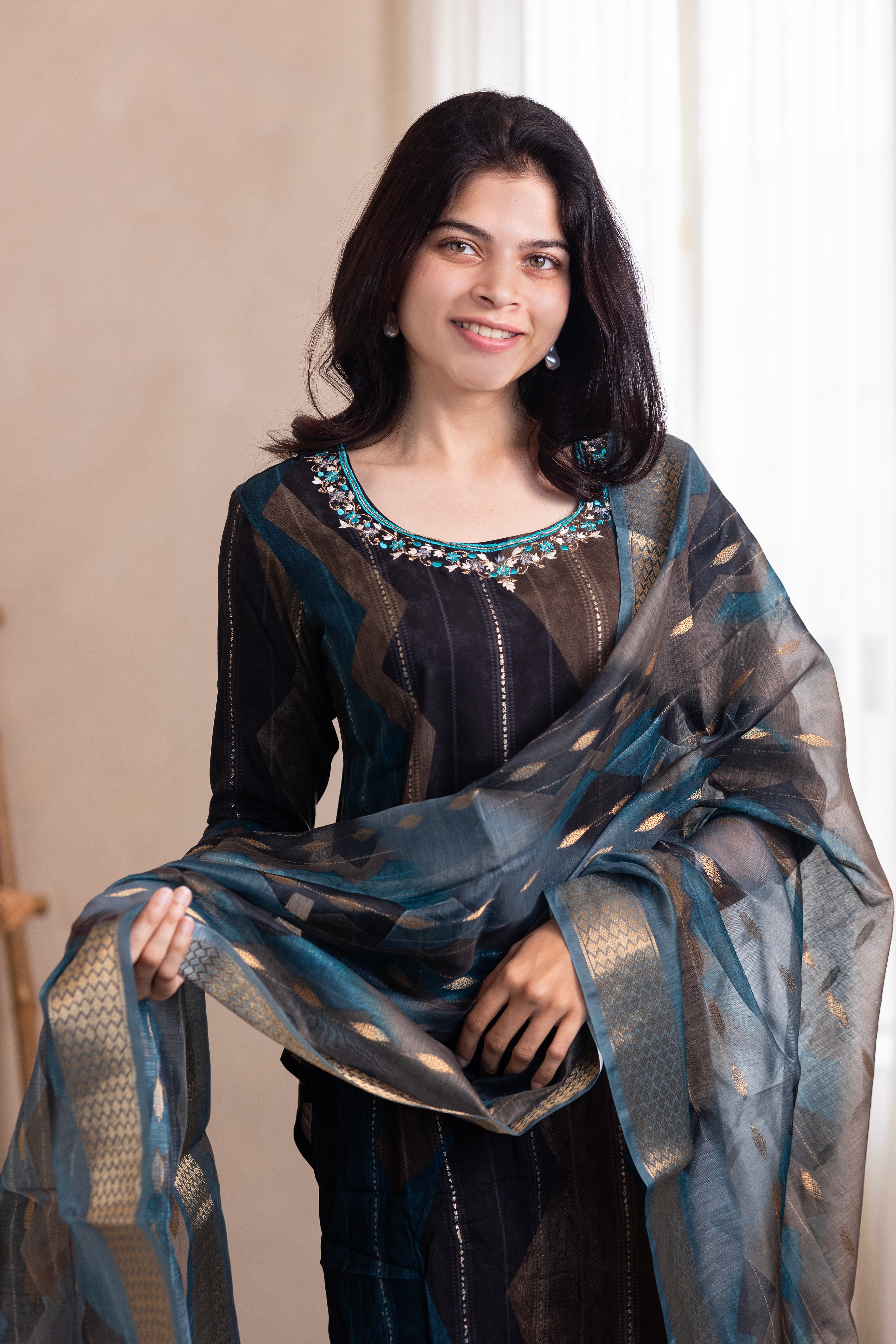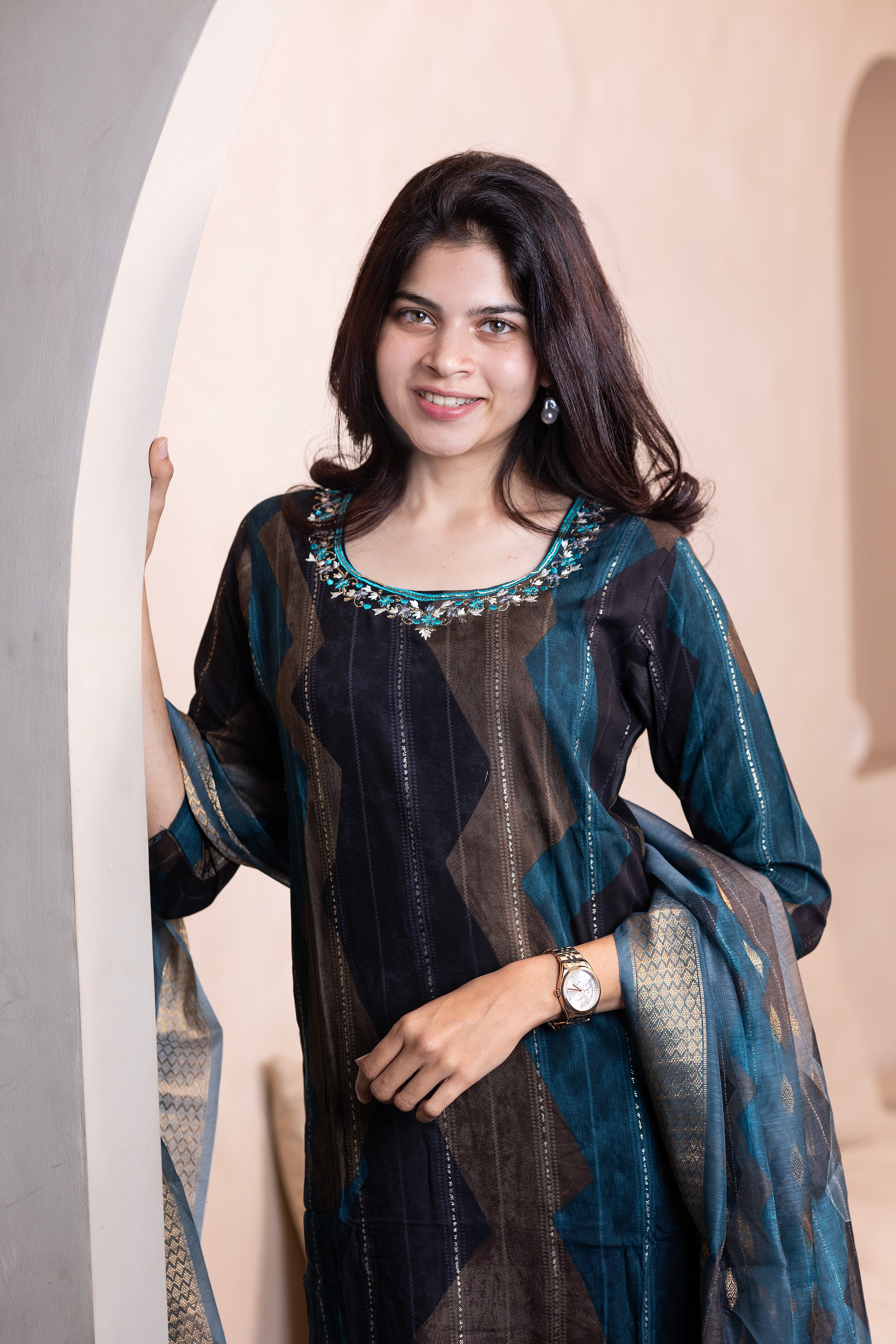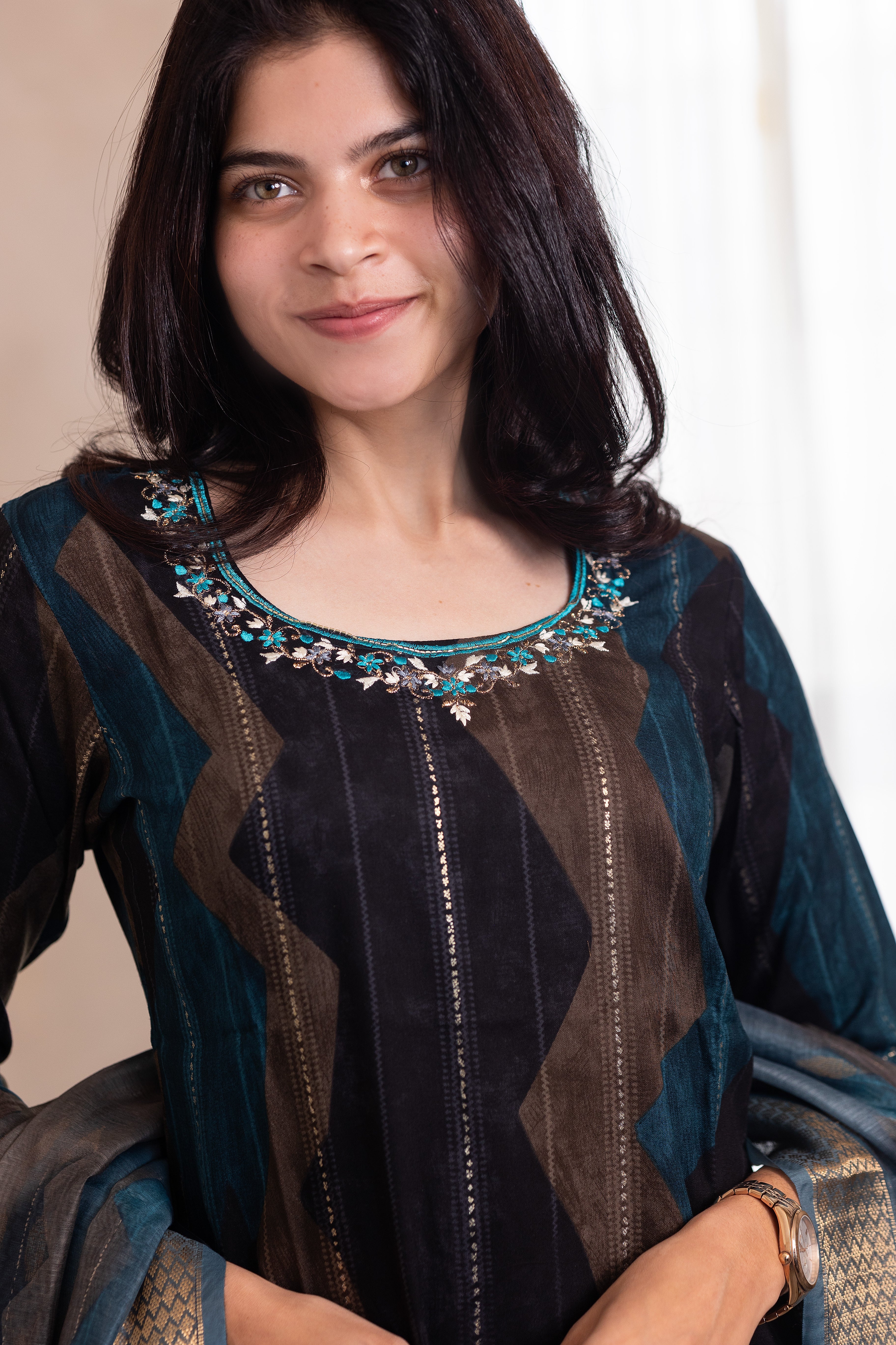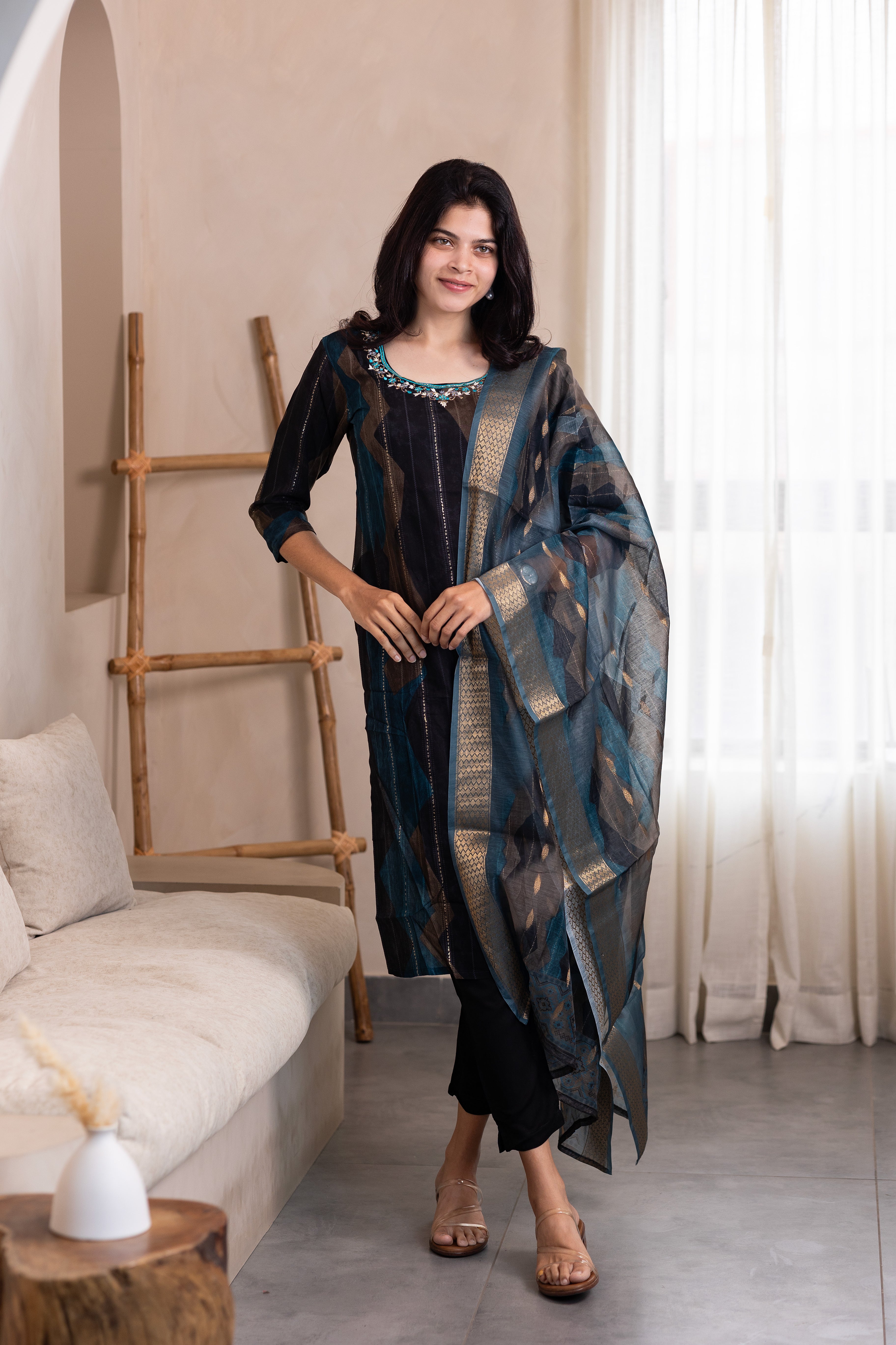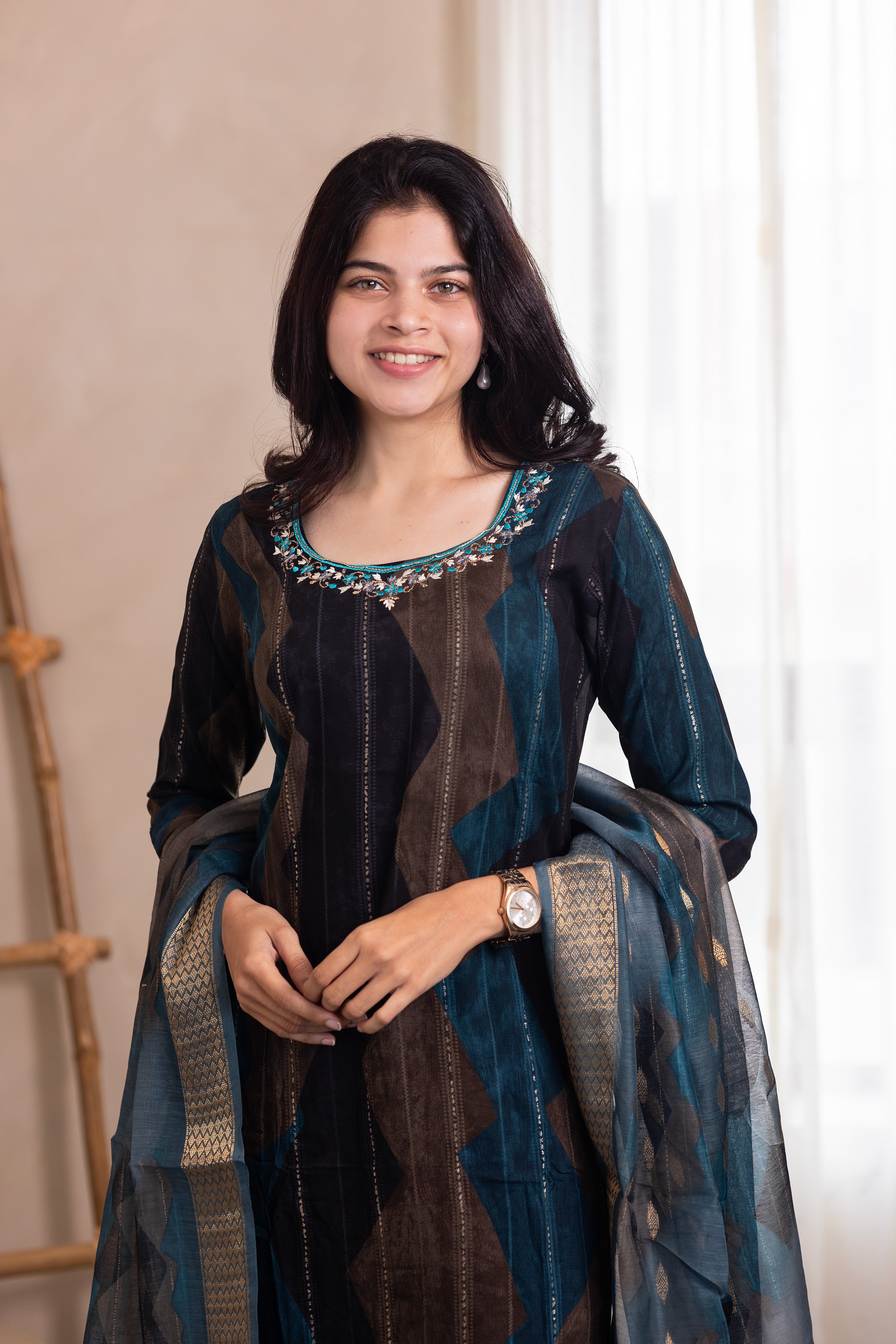 Elevate your ethnic wardrobe with this exquisite Hemanika embroidered salwar set in serene blue. Crafted from luxurious rayon fabric, this ensemble combines traditional artistry with contemporary comfort. The intricate embroidery detailing showcases meticulous craftsmanship, while the fluid drape of rayon ensures effortless elegance throughout the day. Perfect for festive occasions, celebrations, or refined everyday wear, this salwar set embodies timeless sophistication and cultural grace.