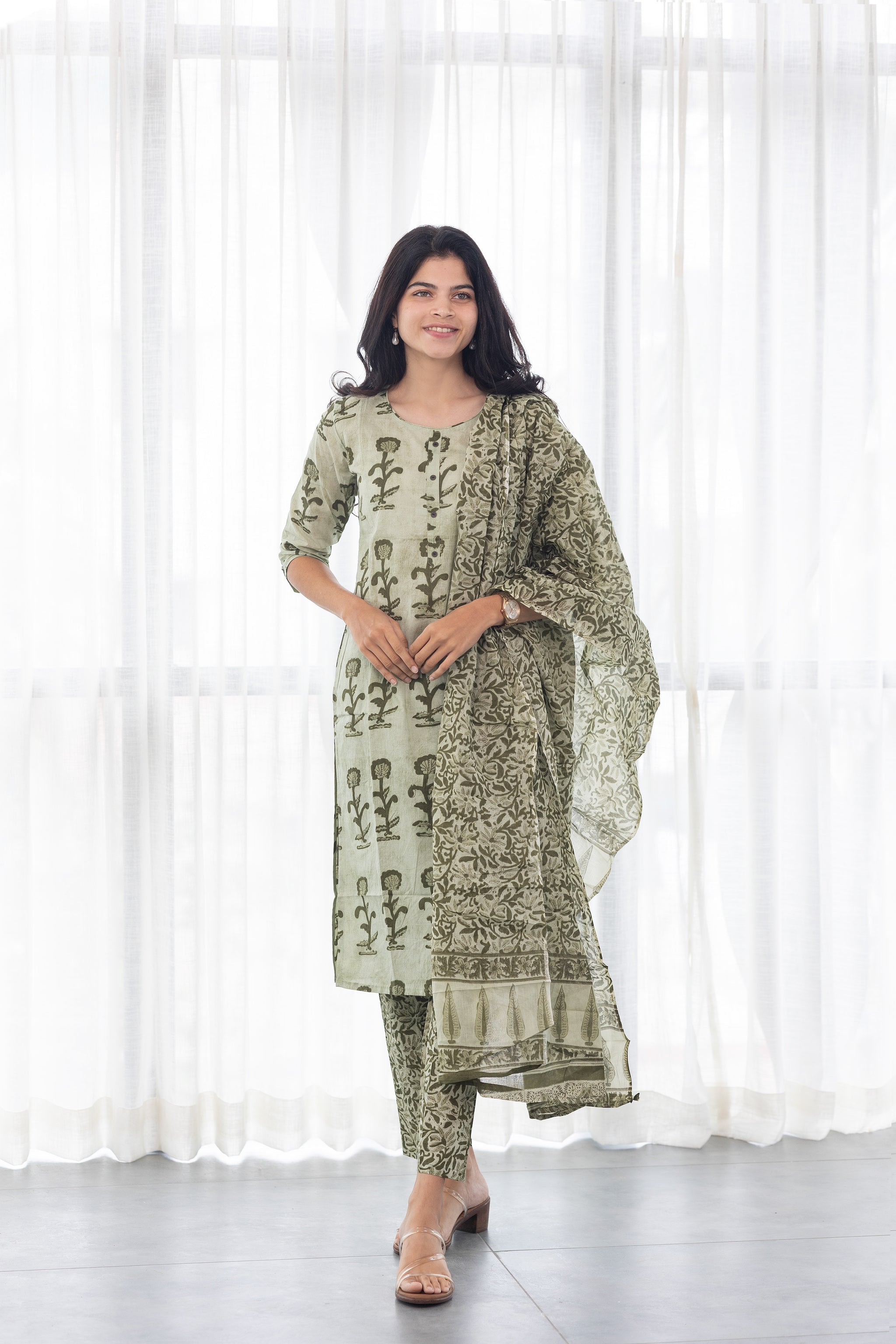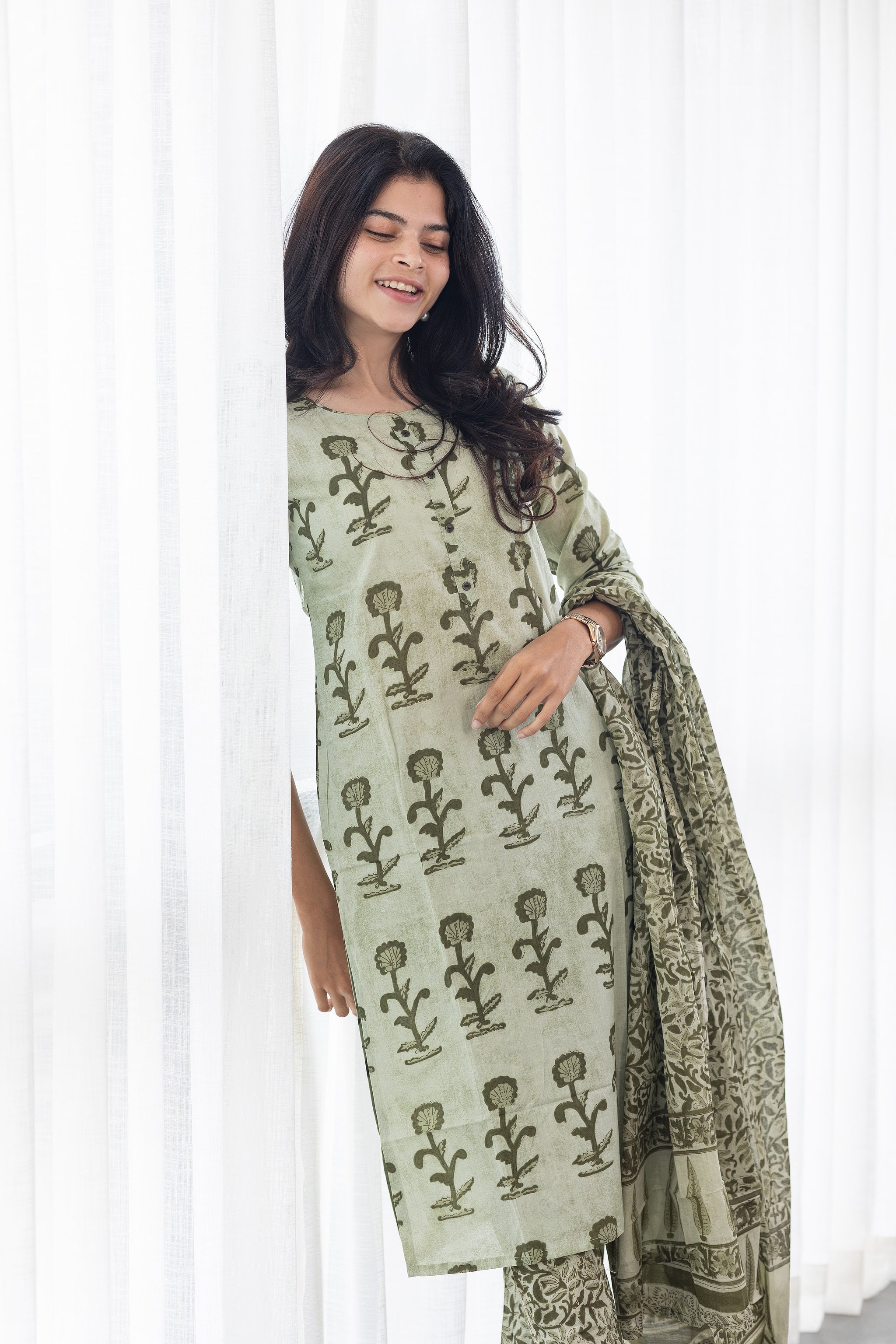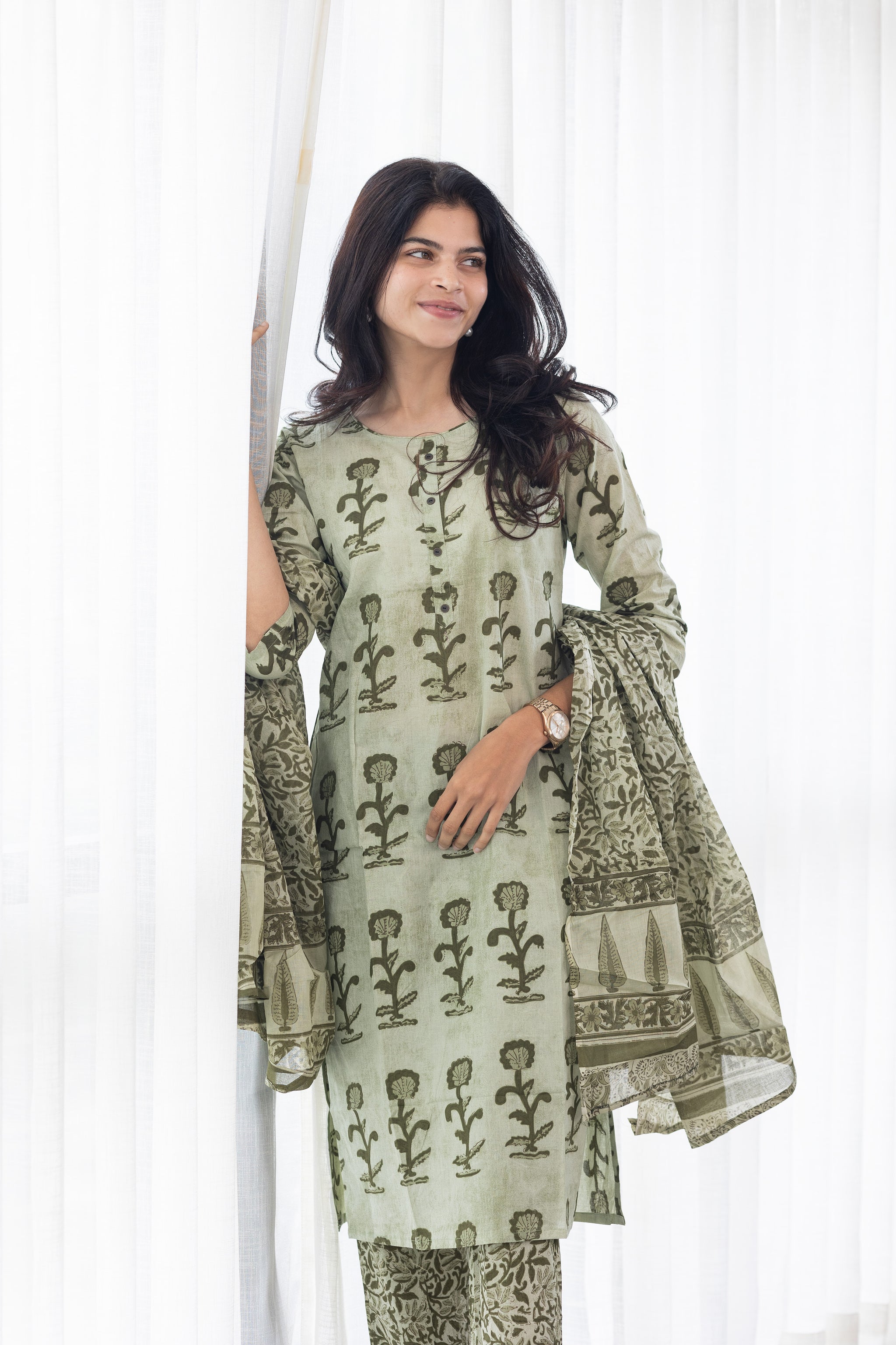 Introducing the Leela salwar set, a timeless ensemble that embodies refined elegance. Crafted in a serene green hue, this sophisticated piece features a graceful round neckline that flatters and complements any complexion. The traditional salwar silhouette offers both comfort and style, making it an ideal choice for festive occasions, celebrations, or everyday wear. The carefully chosen shade of blue exudes calm sophistication while maintaining the classic appeal of authentic Indian attire. Perfect for those who appreciate quality craftsmanship and understated luxury in their ethnic wardrobe.