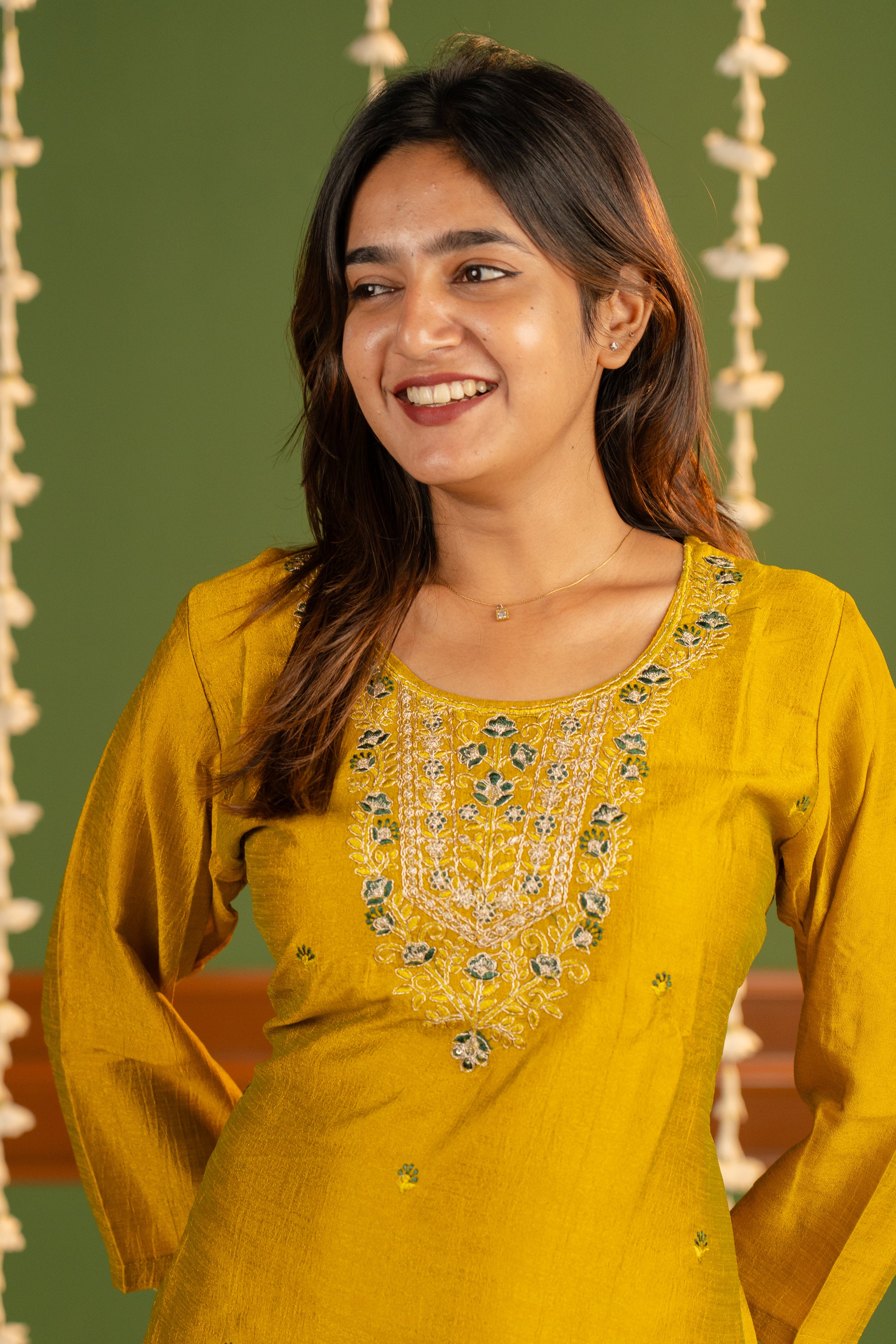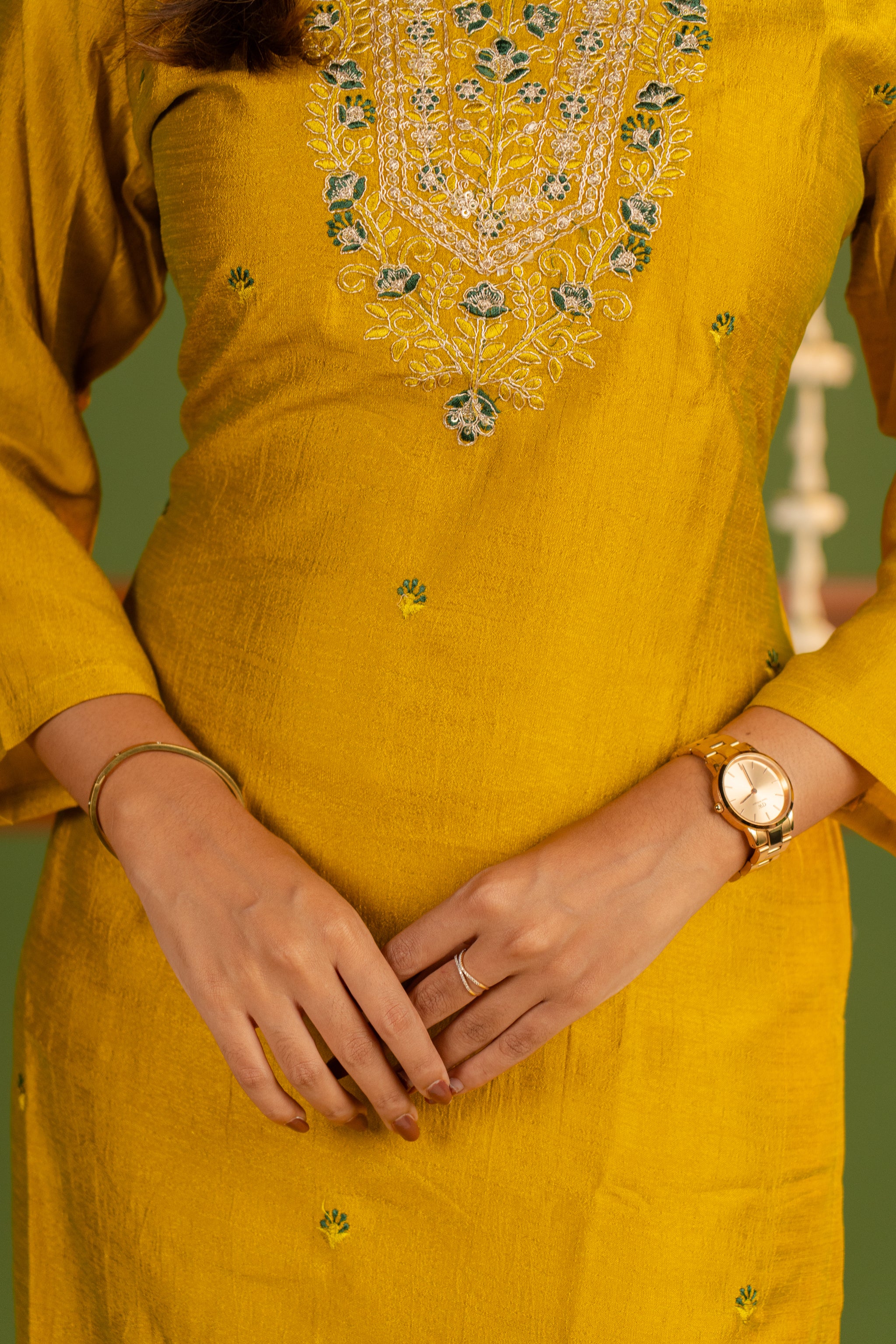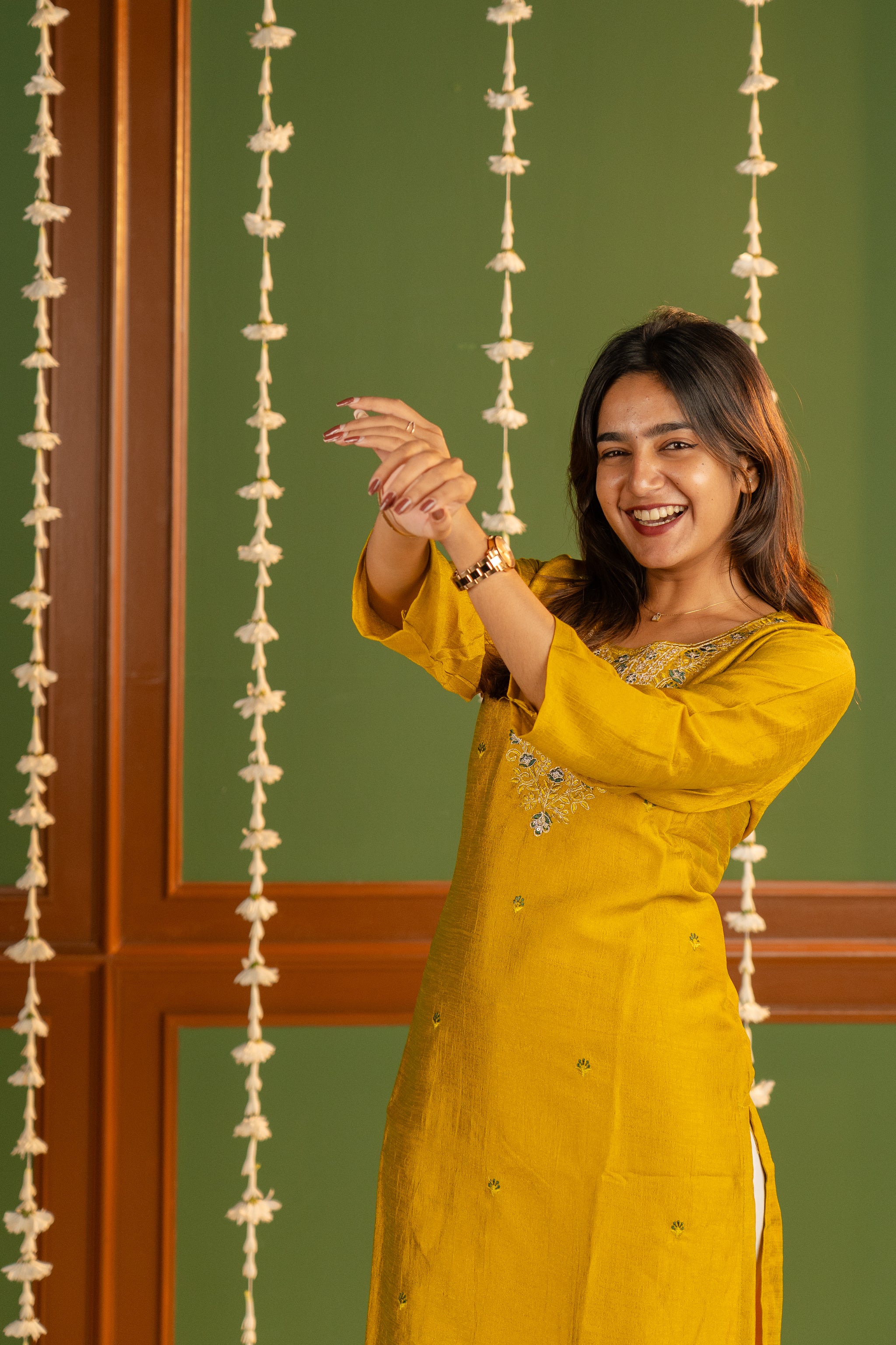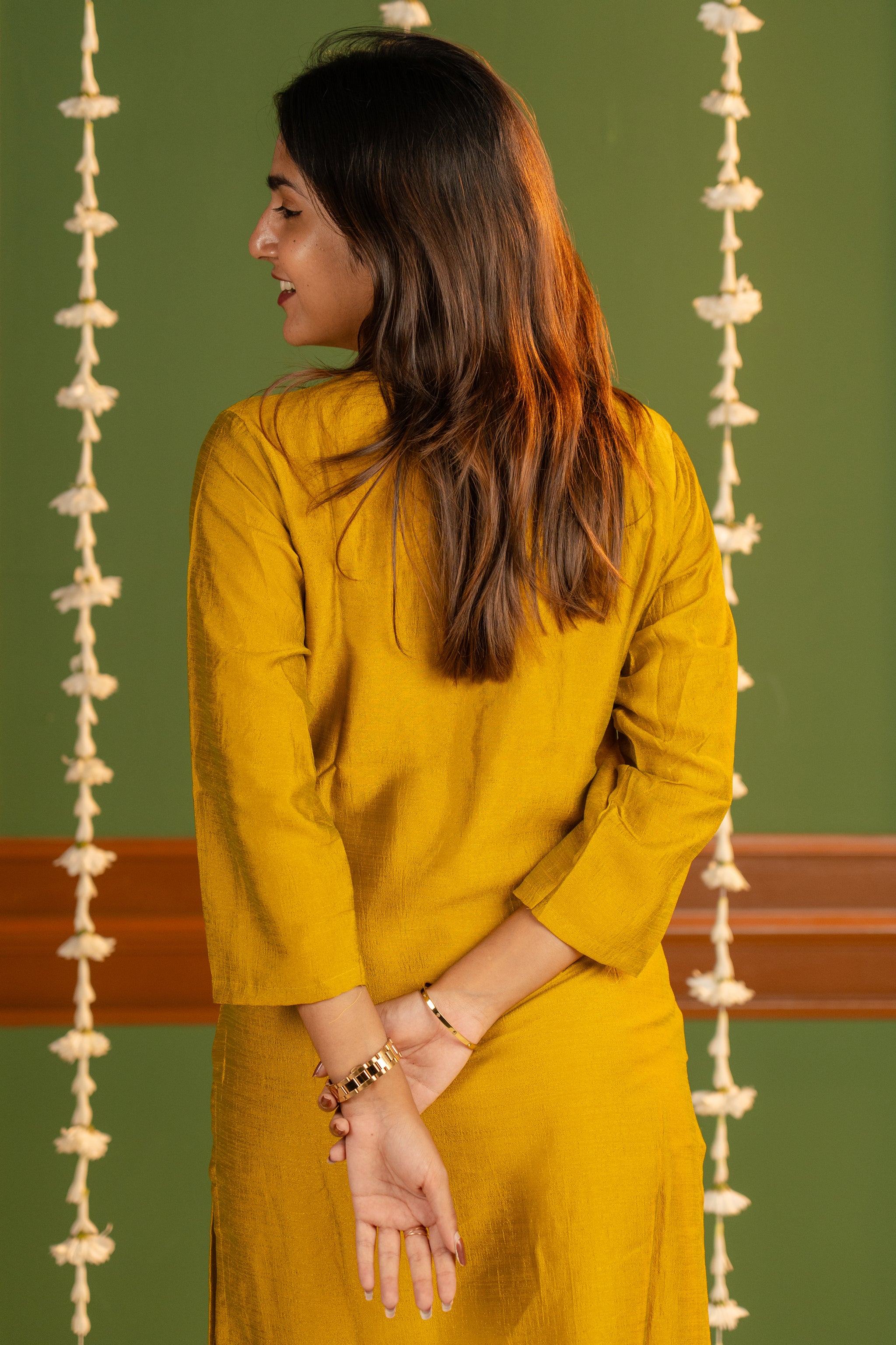 The Meenakshi kurti in yellow radiates understated elegance with its vibrant yet tasteful hue. Designed to offer both comfort and style, this kurti features a refined silhouette perfect for daytime events or casual gatherings. Its sophisticated color and timeless design make it a versatile addition to your wardrobe.