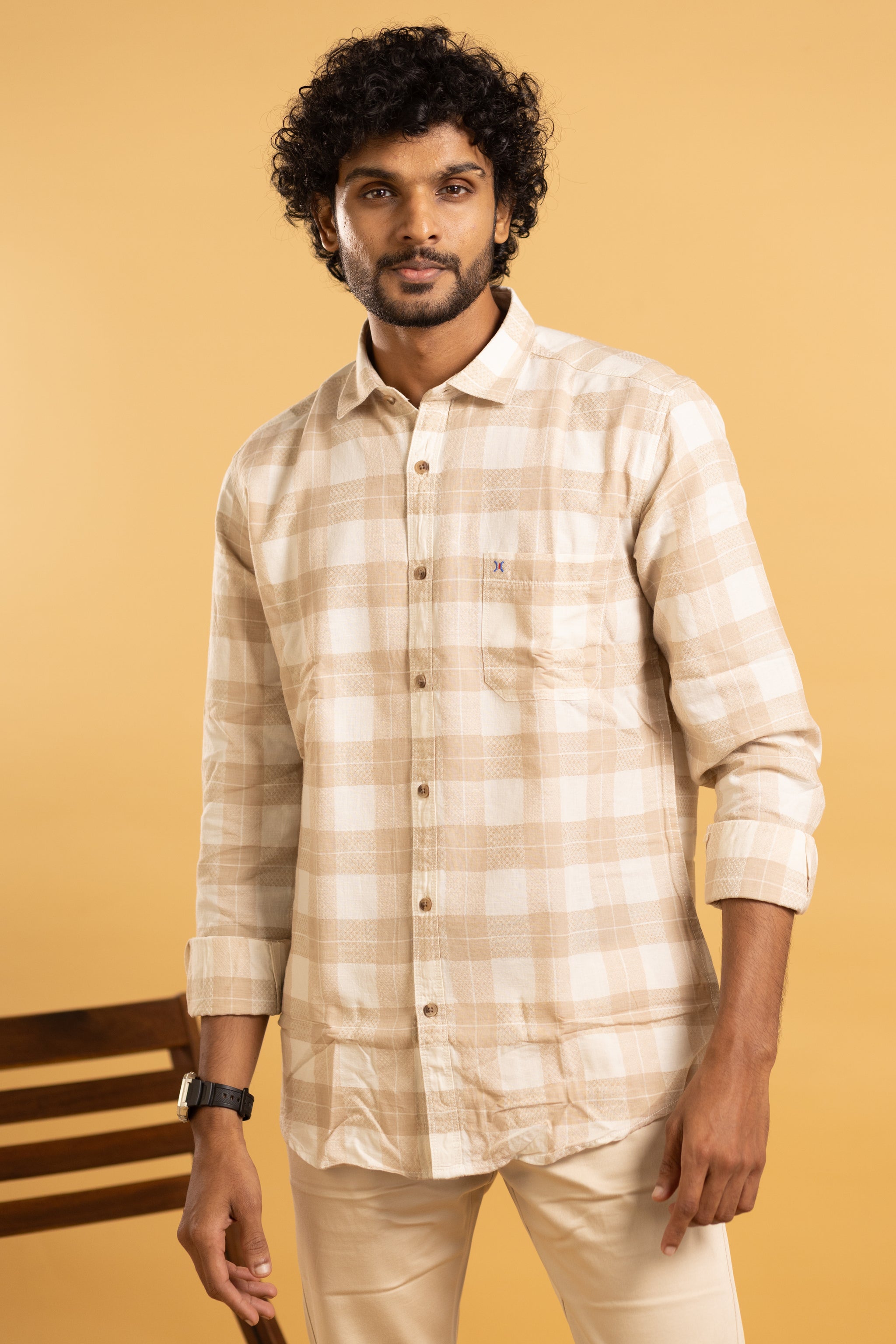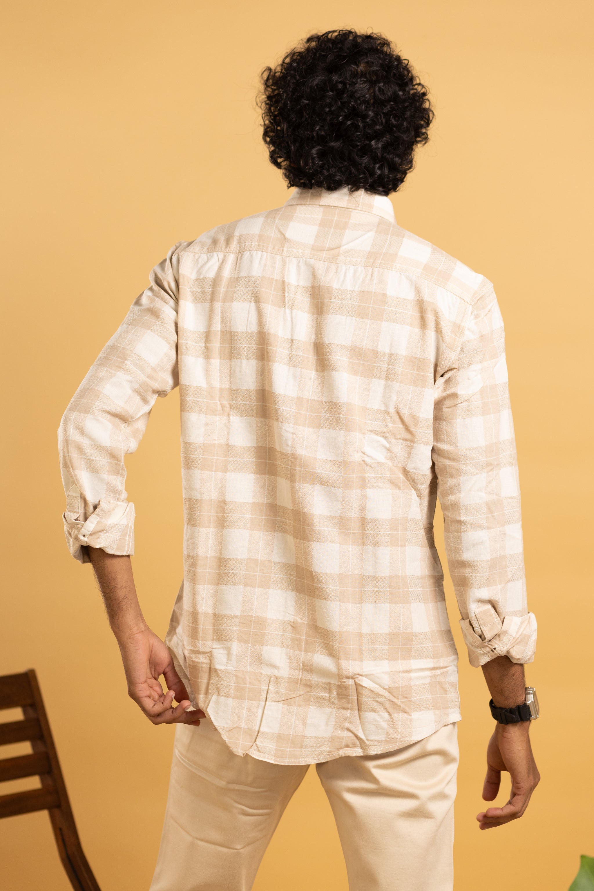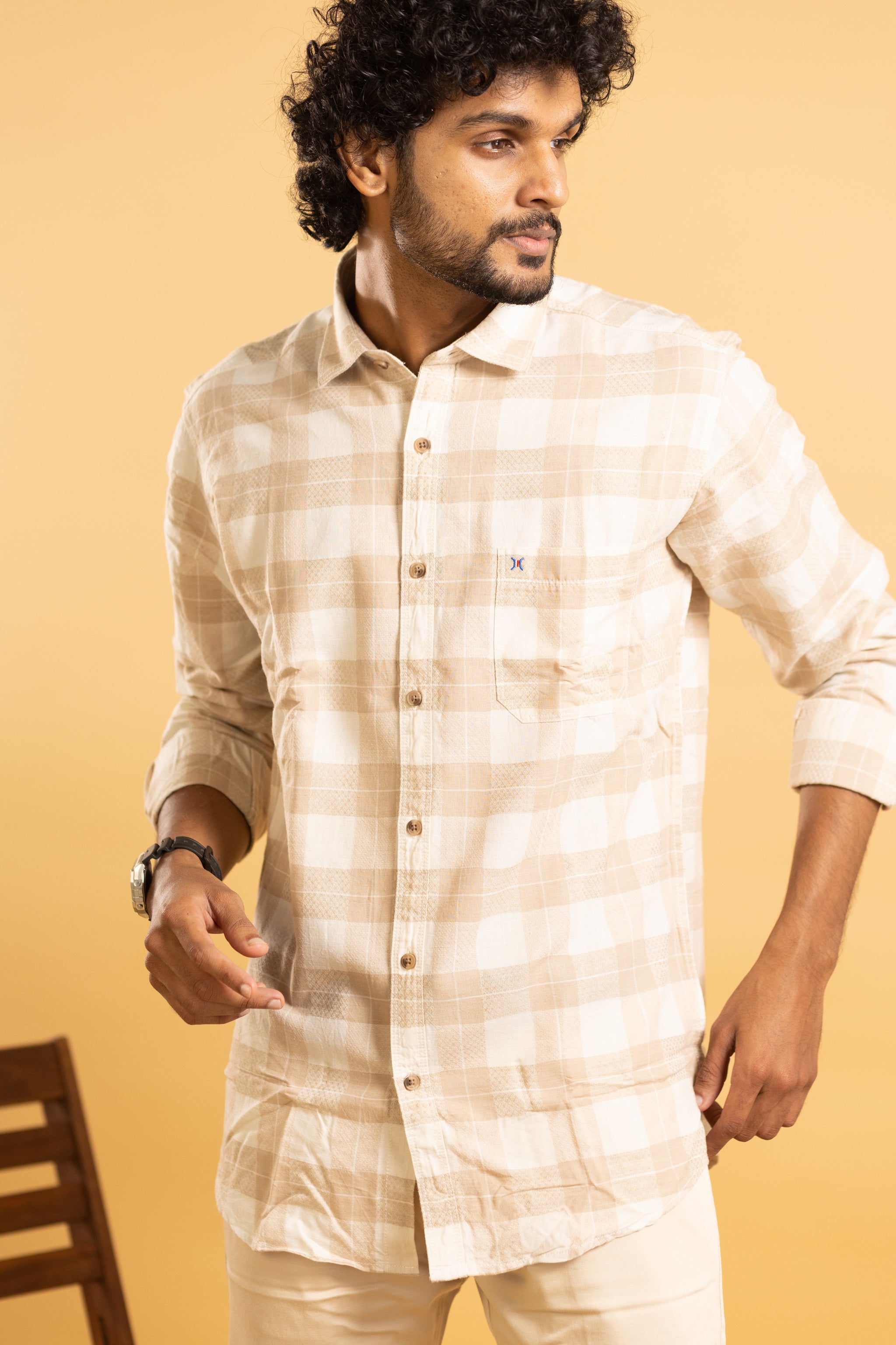 Elevate your wardrobe with this men's full sleeve shirt featuring a refined plaid pattern in subtle beige and cream tones. Designed for a sophisticated look, its timeless color scheme pairs effortlessly with both formal and casual outfits, ensuring versatility and style. Crafted to offer comfort and a tailored fit, this shirt is an essential piece for the modern gentleman seeking understated elegance.
