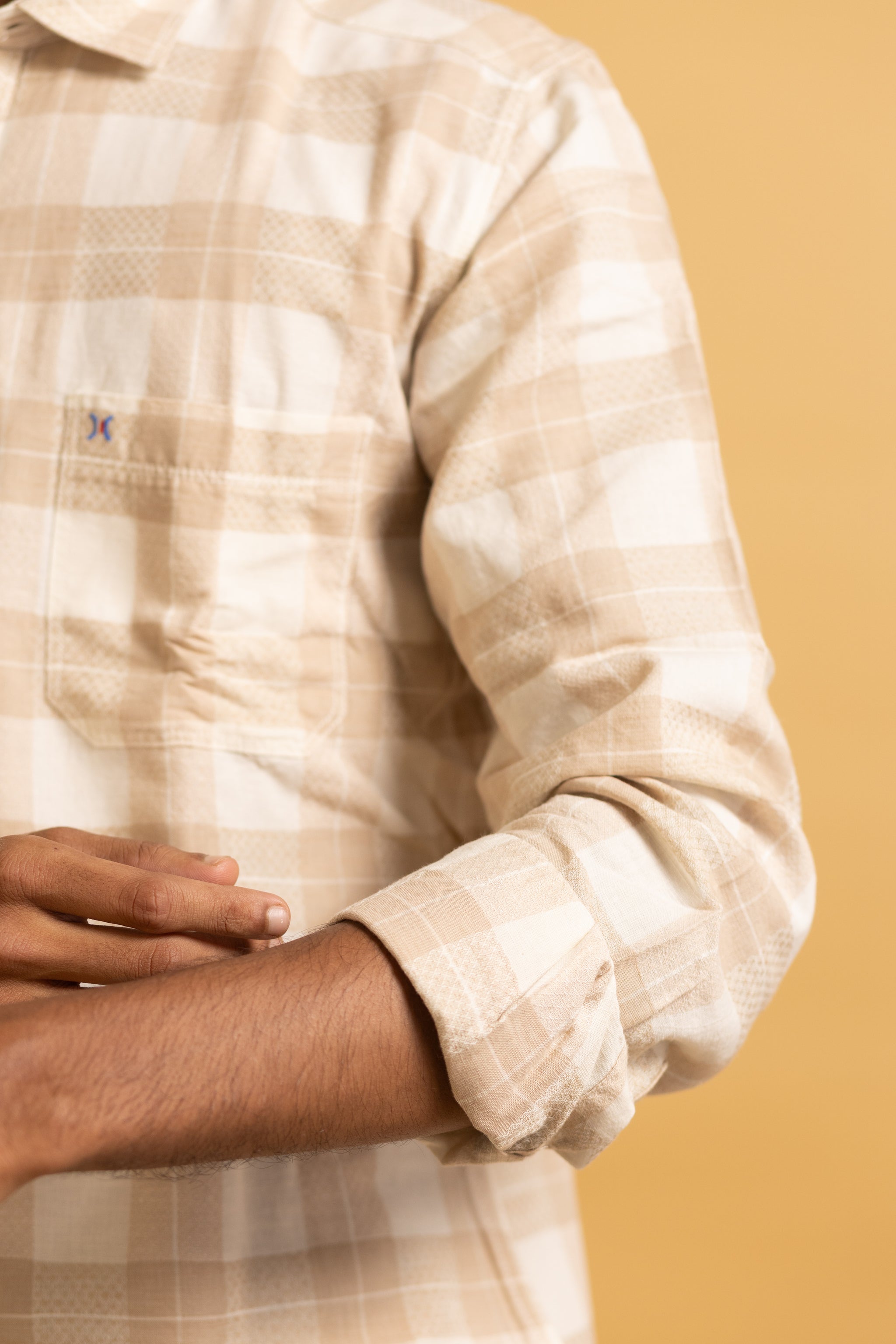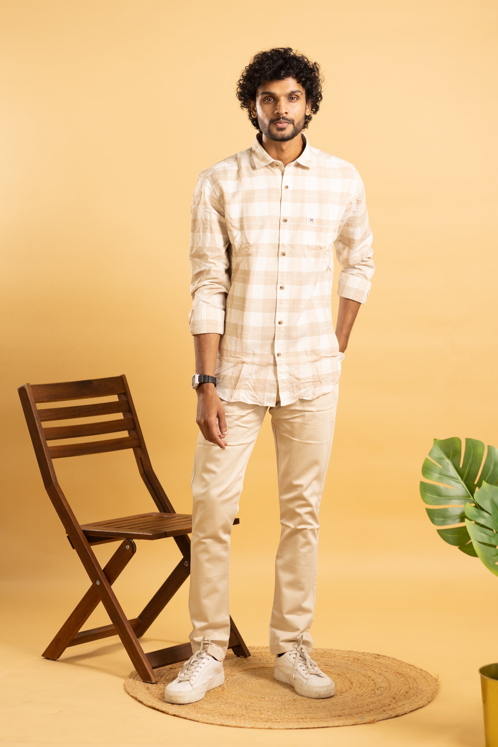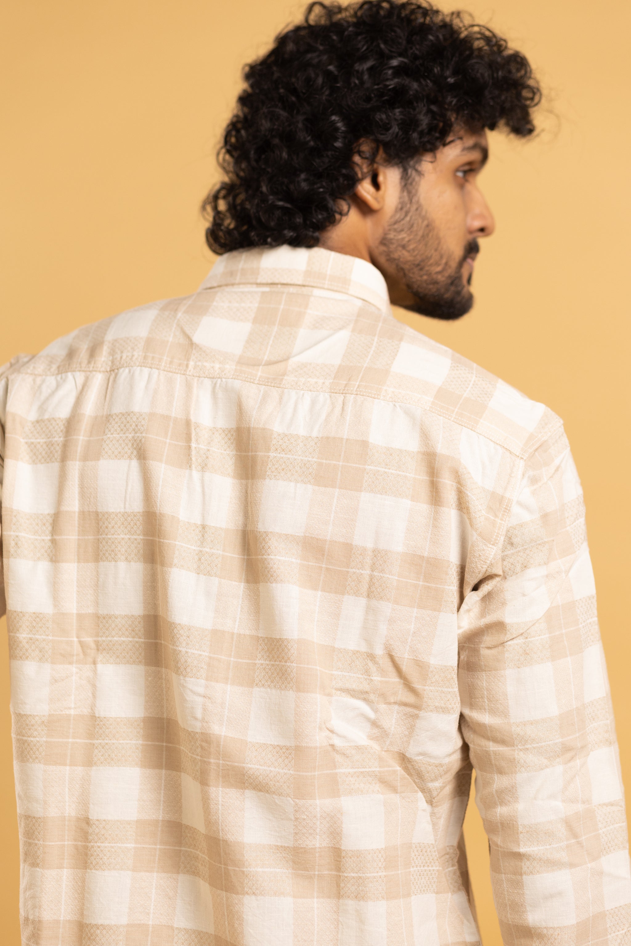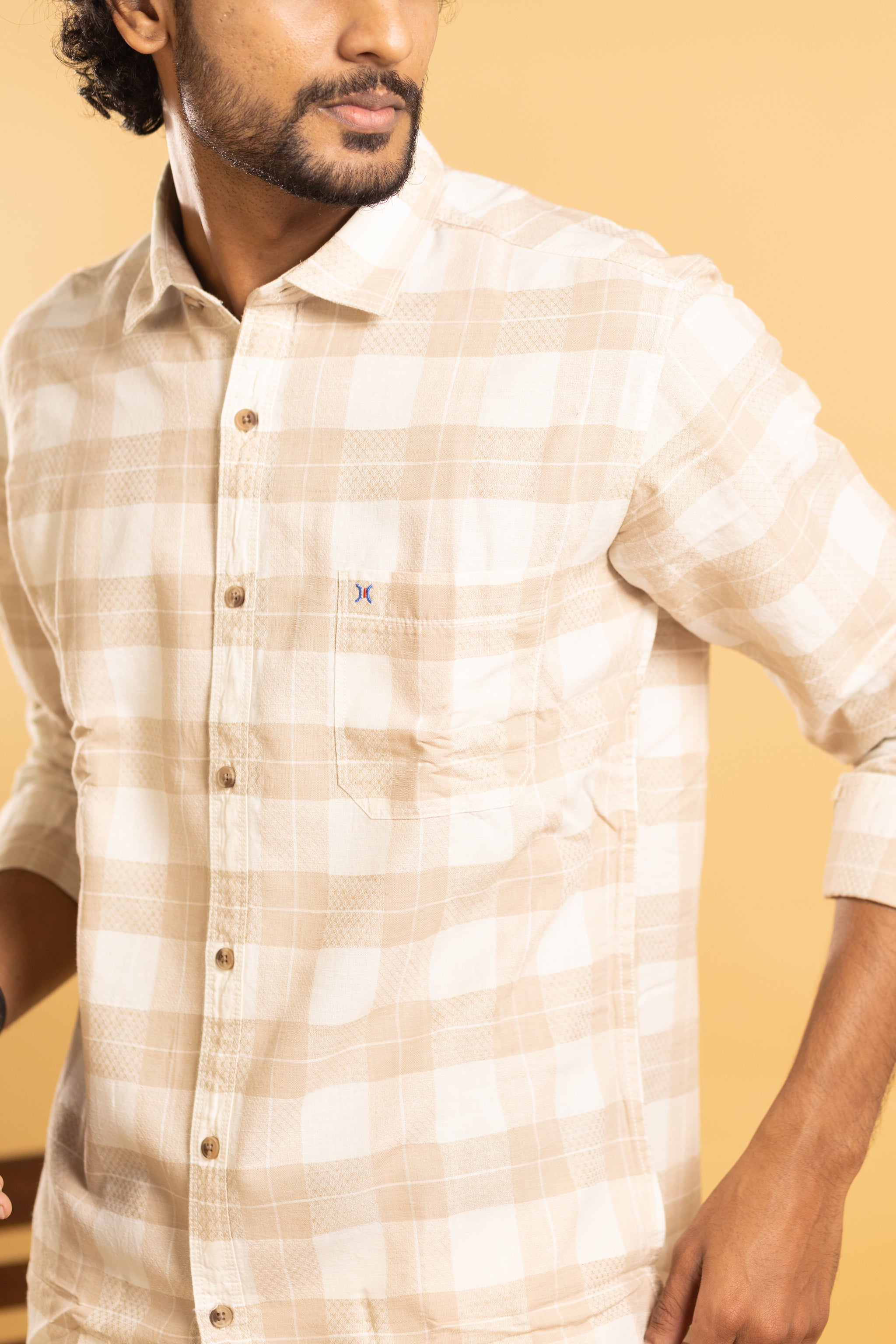 Elevate your wardrobe with this men's full sleeve shirt featuring a refined plaid pattern in subtle beige and cream tones. Designed for a sophisticated look, its timeless color scheme pairs effortlessly with both formal and casual outfits, ensuring versatility and style. Crafted to offer comfort and a tailored fit, this shirt is an essential piece for the modern gentleman seeking understated elegance.