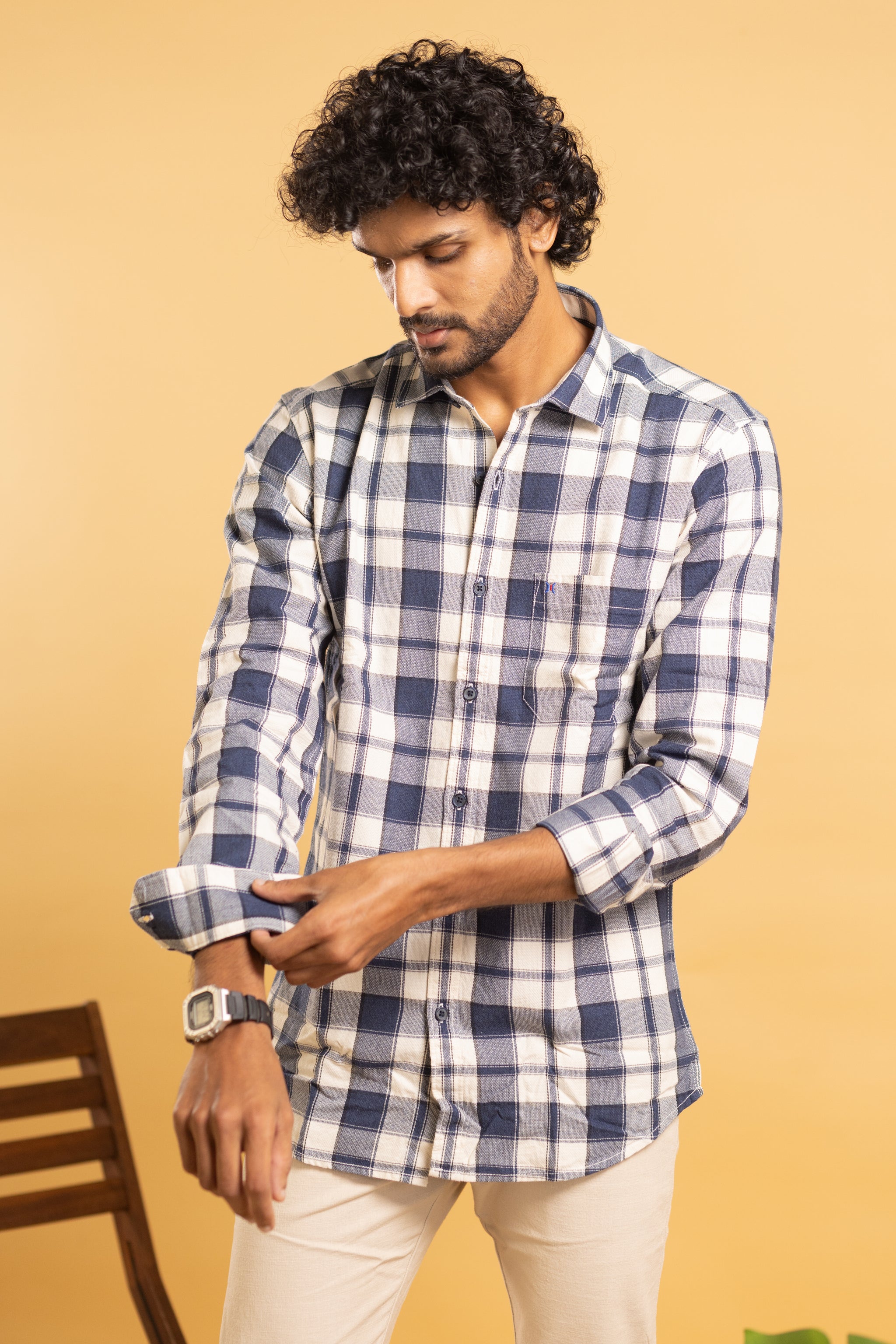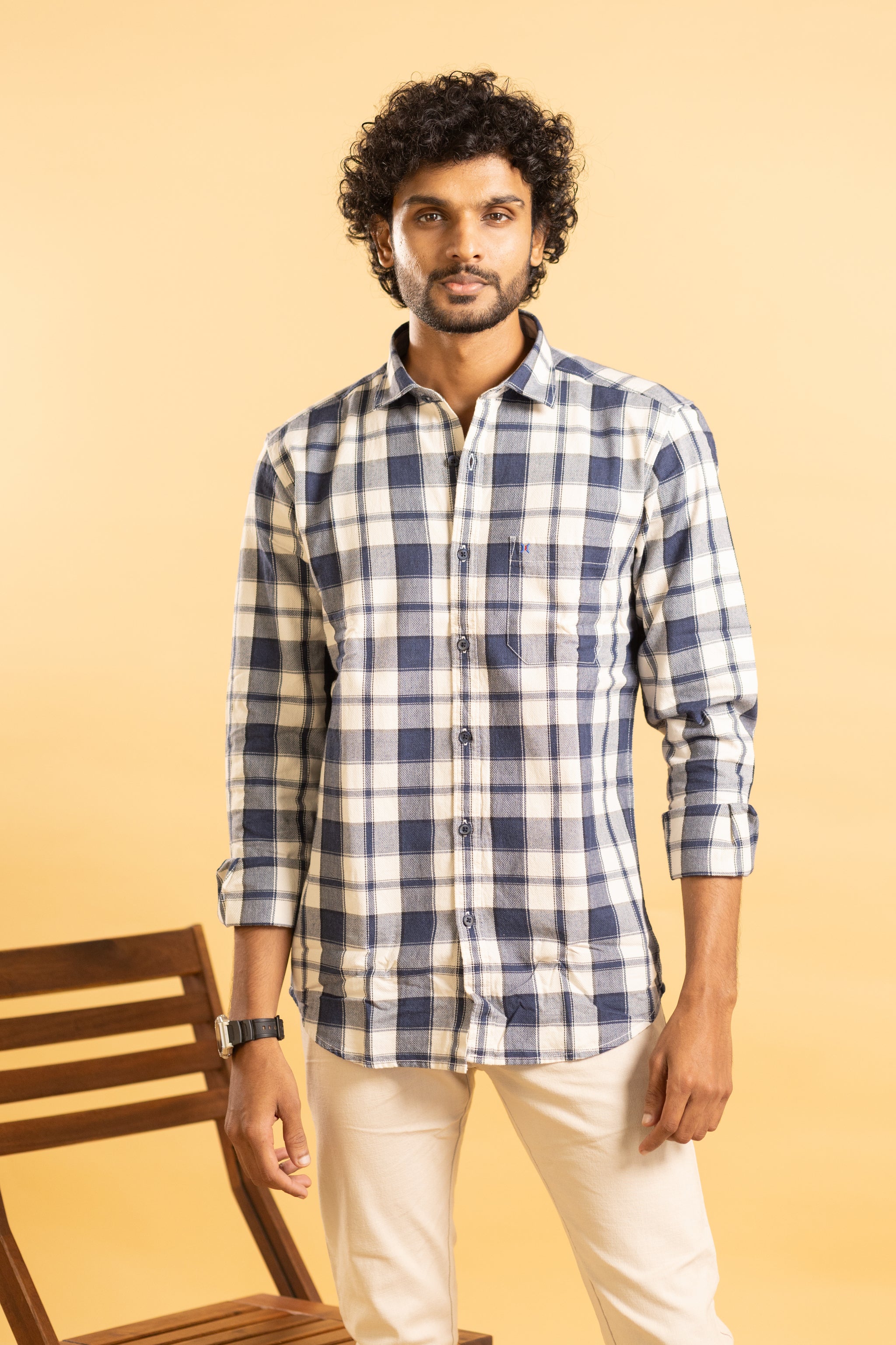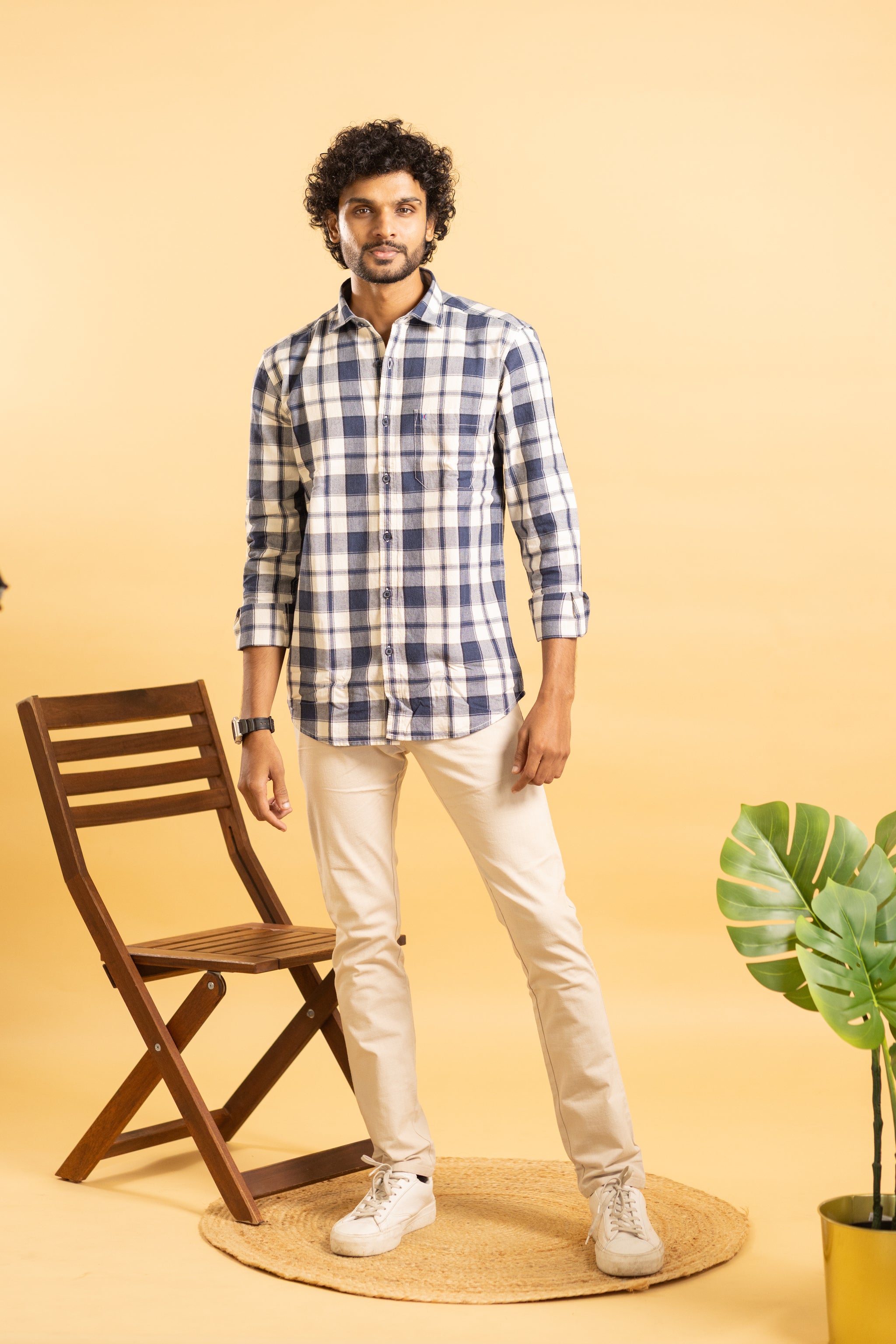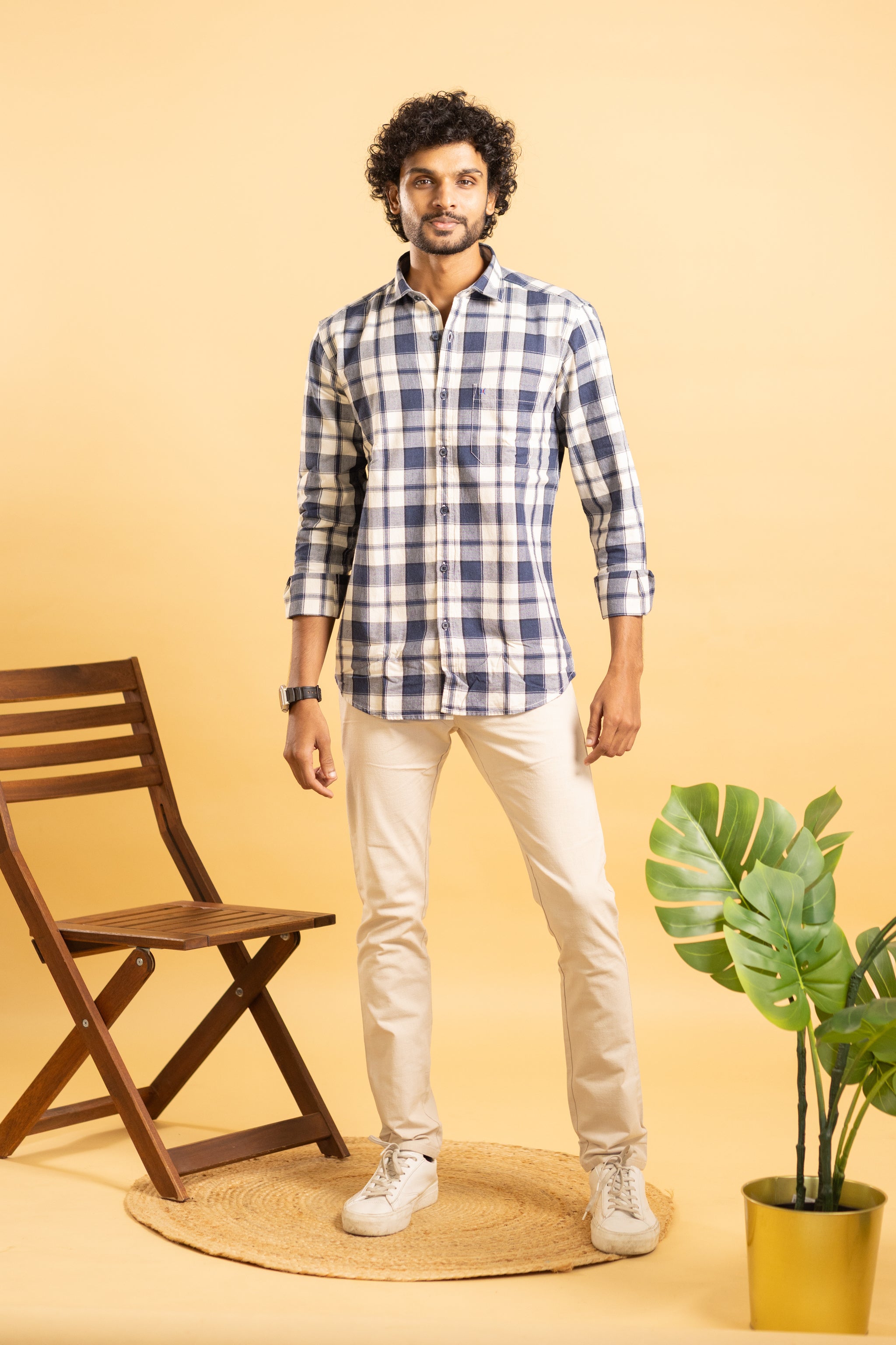 Elevate your wardrobe with this men's full sleeve plaid shirt in navy blue and beige. Crafted to combine classic style with modern sophistication, its timeless plaid pattern offers versatile appeal for both casual and semi-formal occasions. The full sleeves provide a polished look while ensuring comfort throughout the day. Ideal for those who appreciate refined yet understated fashion.