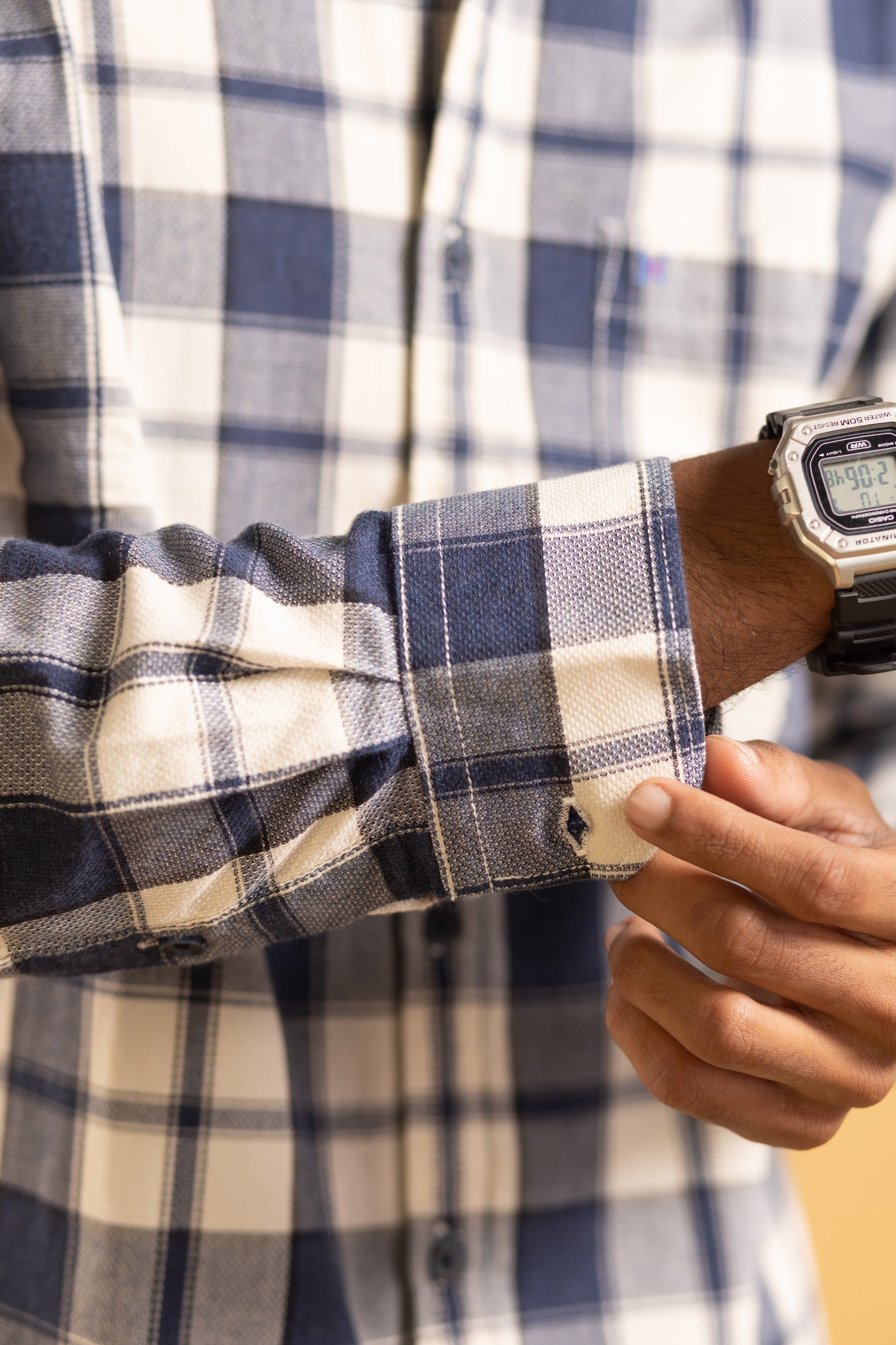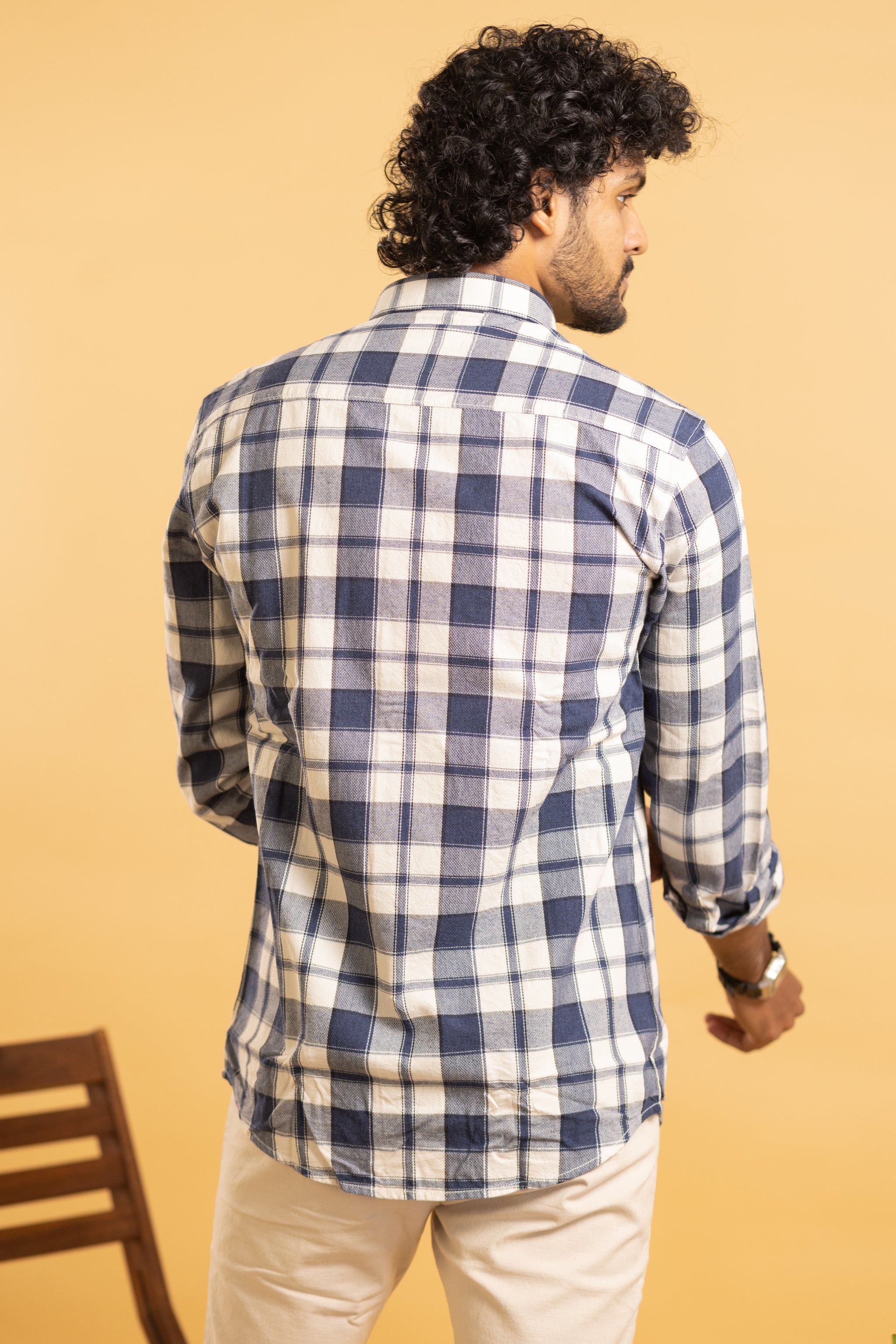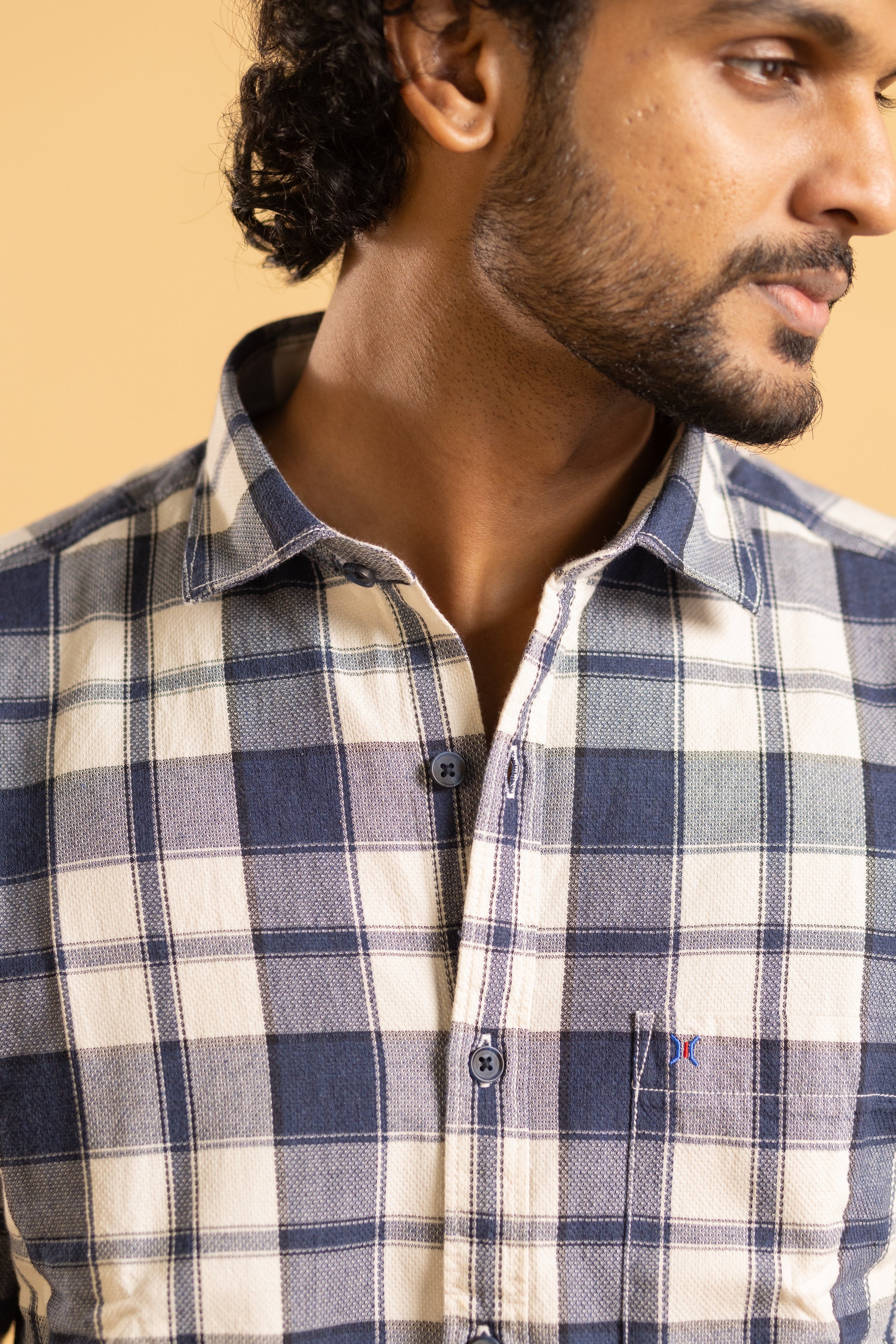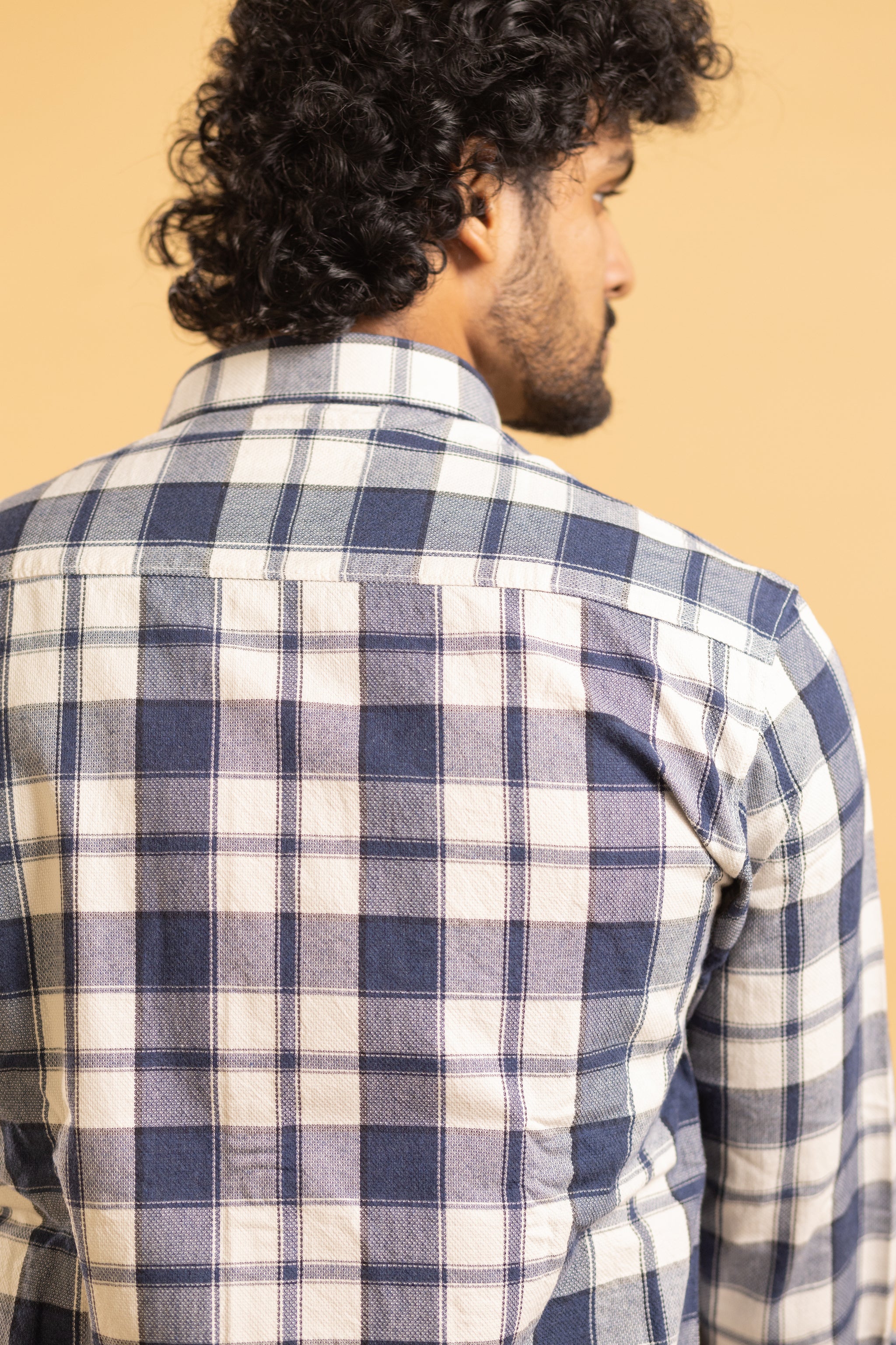 Elevate your wardrobe with this men's full sleeve plaid shirt in navy blue and beige. Crafted to combine classic style with modern sophistication, its timeless plaid pattern offers versatile appeal for both casual and semi-formal occasions. The full sleeves provide a polished look while ensuring comfort throughout the day. Ideal for those who appreciate refined yet understated fashion.