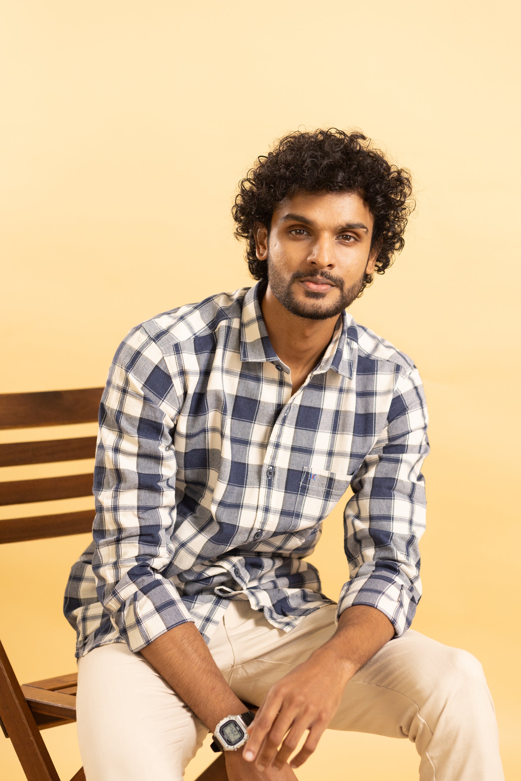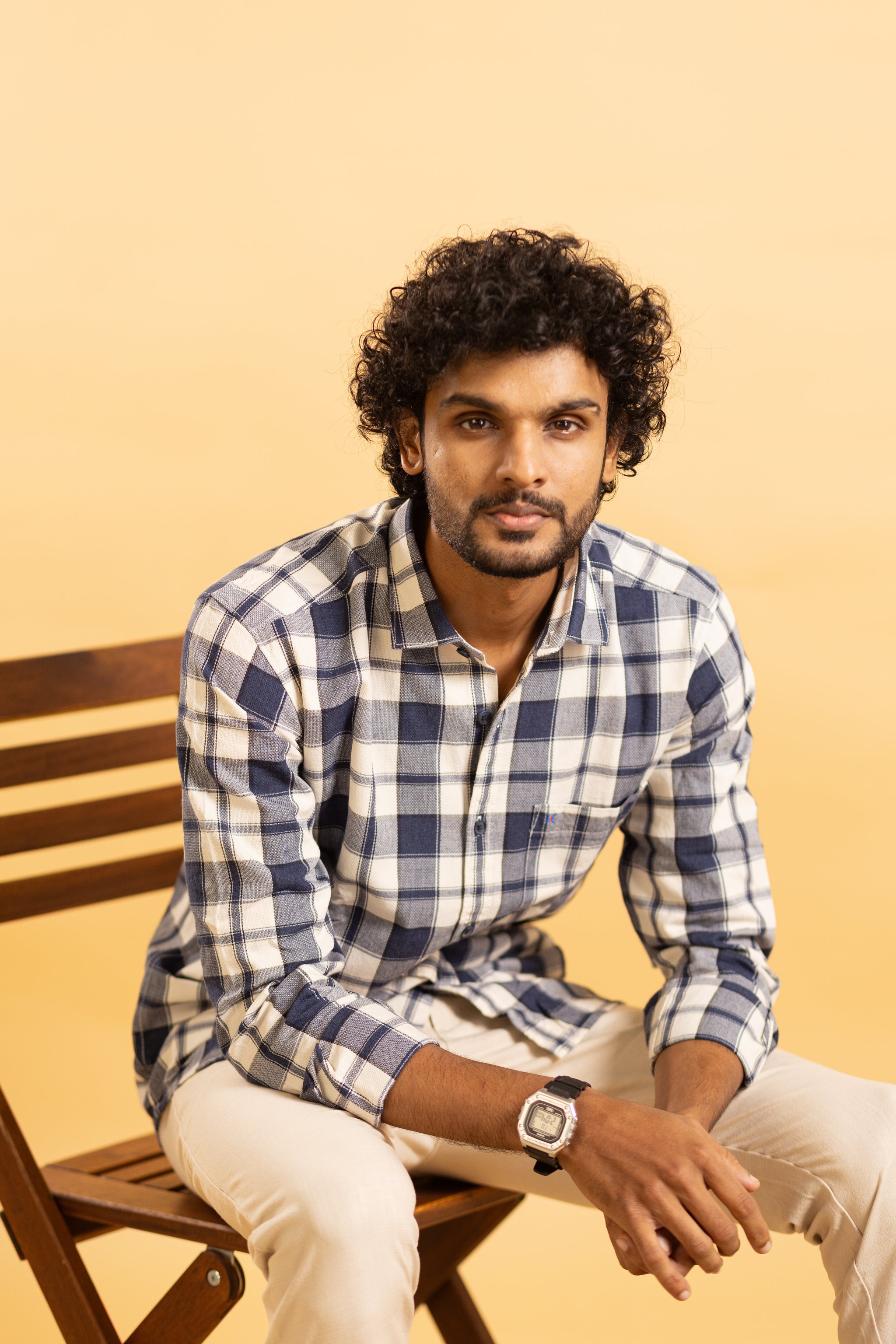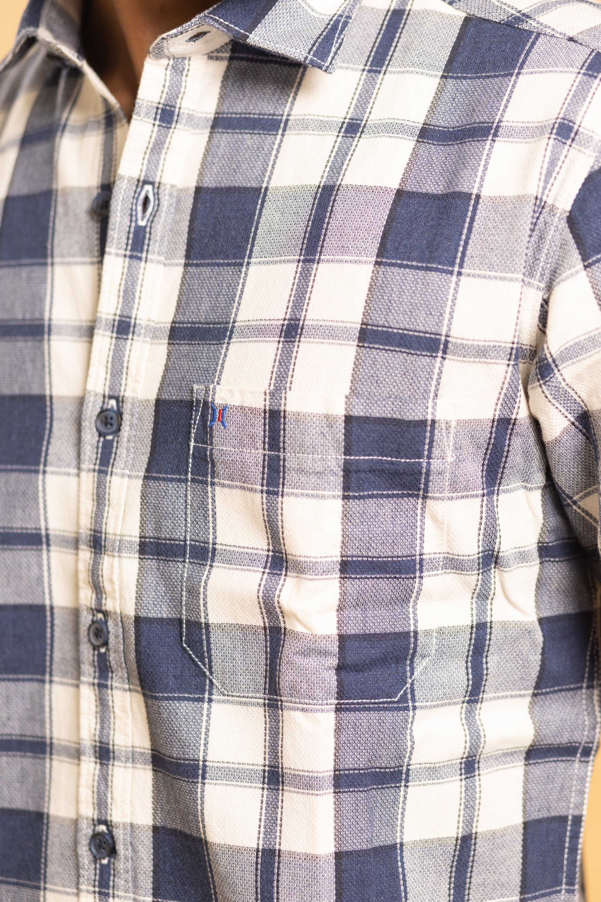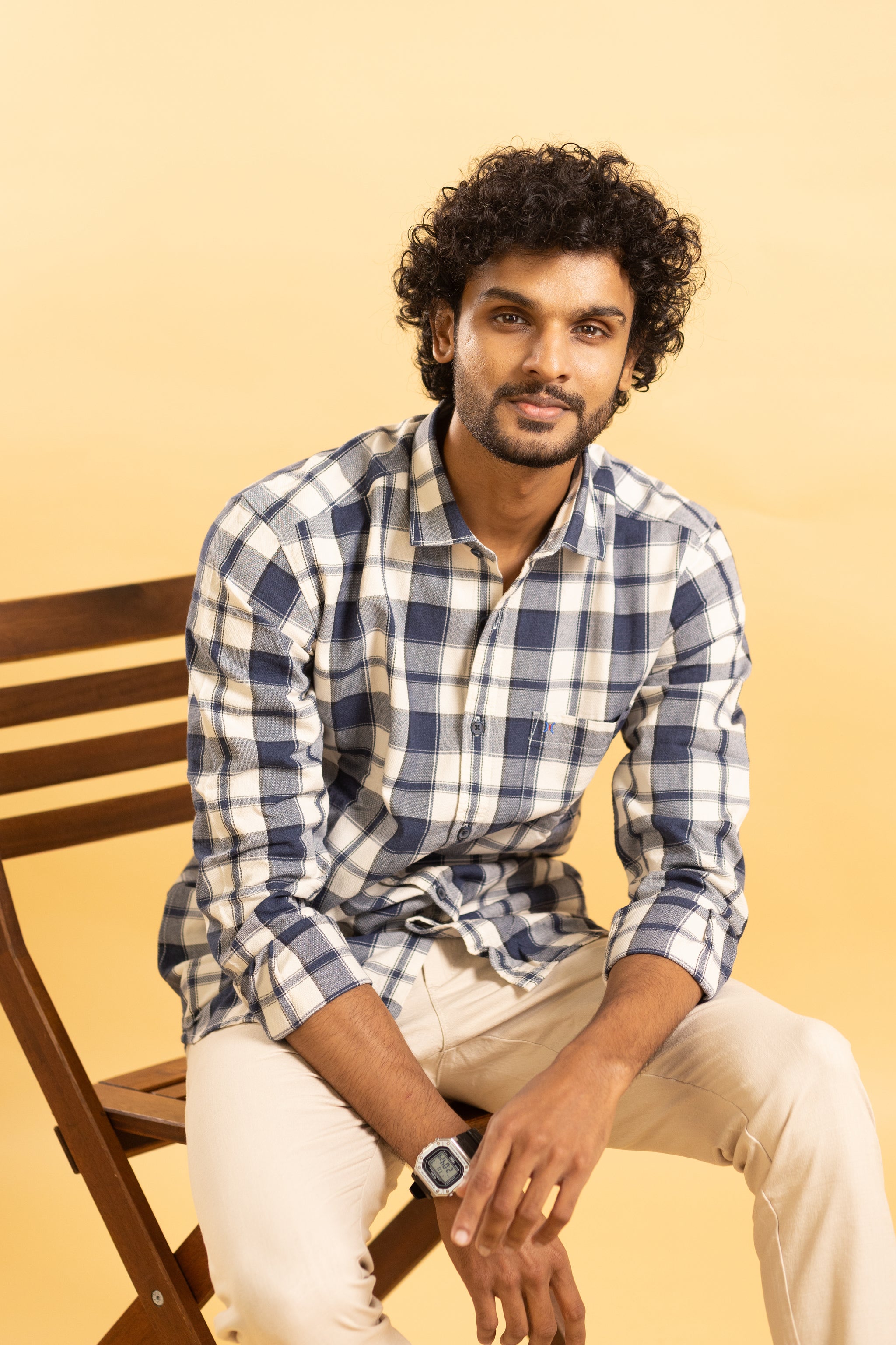 Elevate your wardrobe with this men's full sleeve plaid shirt in navy blue and beige. Crafted to combine classic style with modern sophistication, its timeless plaid pattern offers versatile appeal for both casual and semi-formal occasions. The full sleeves provide a polished look while ensuring comfort throughout the day. Ideal for those who appreciate refined yet understated fashion.