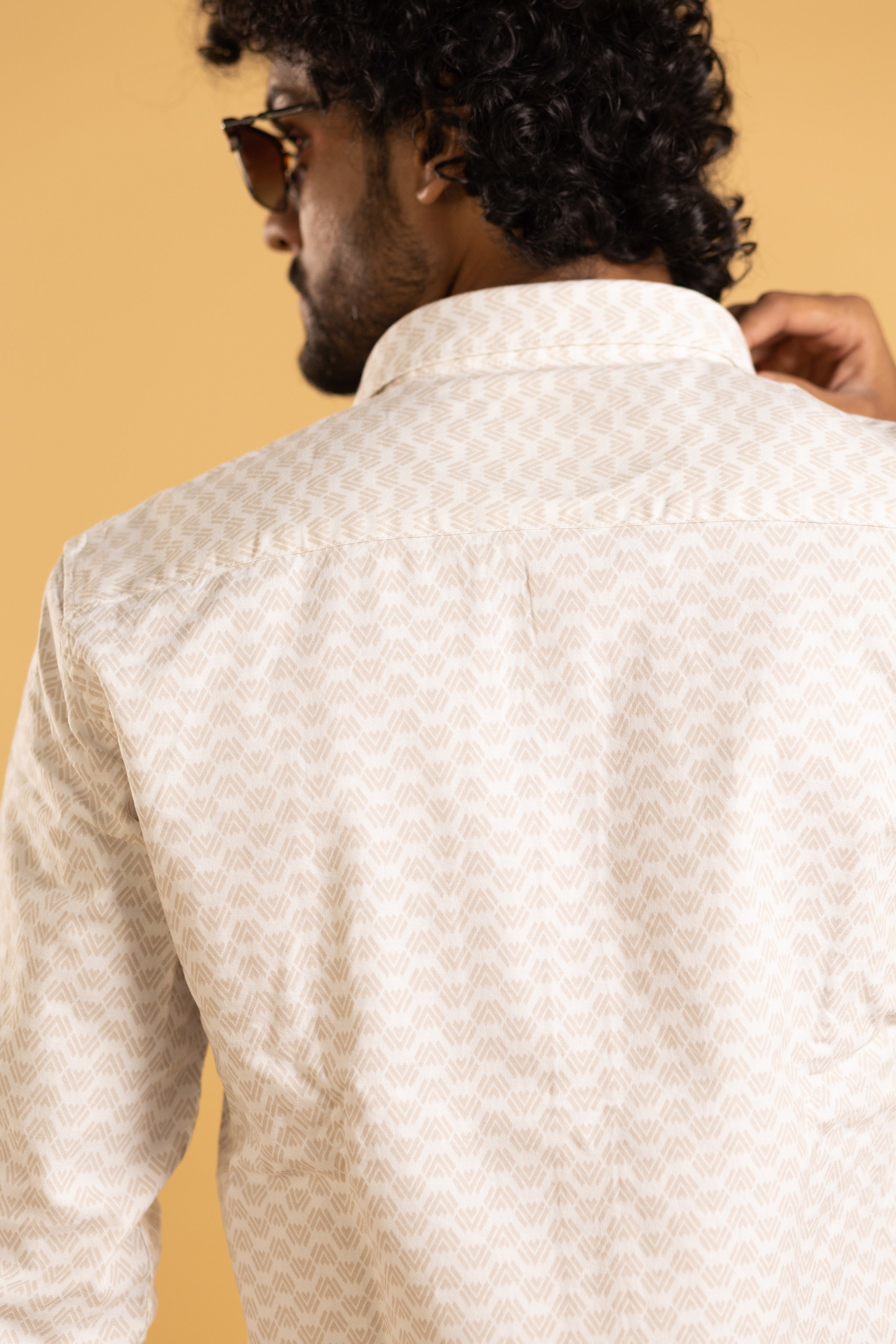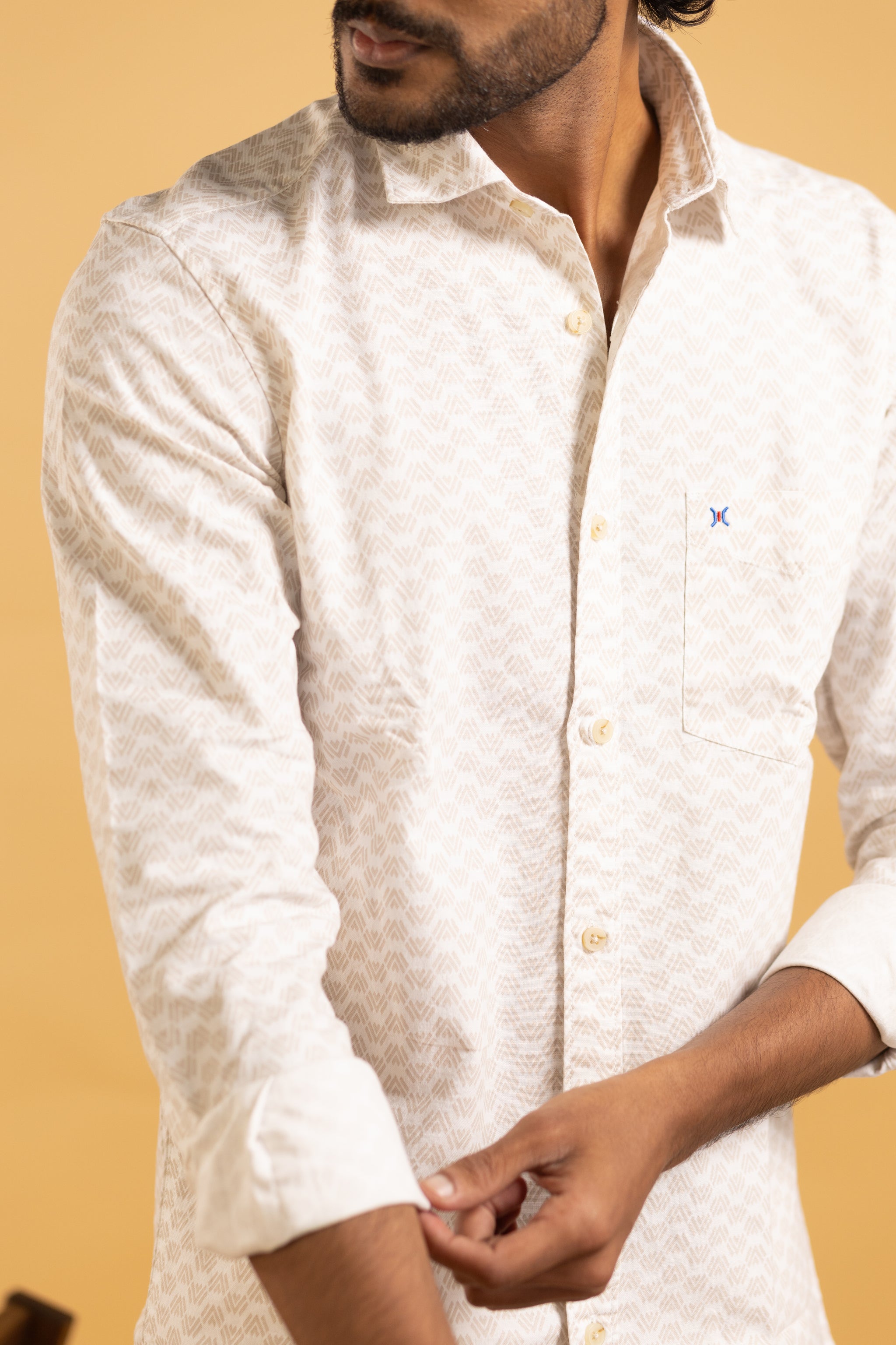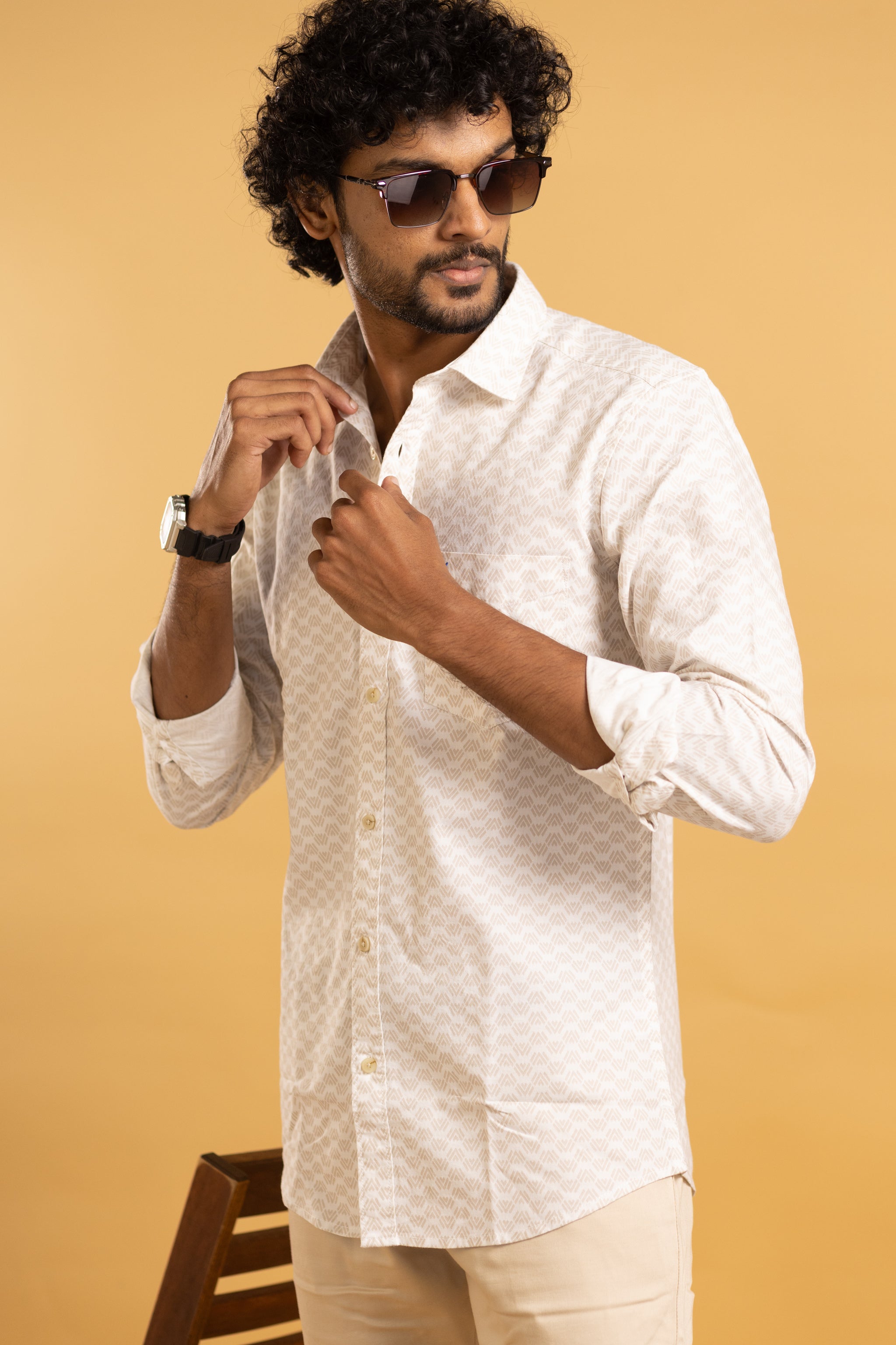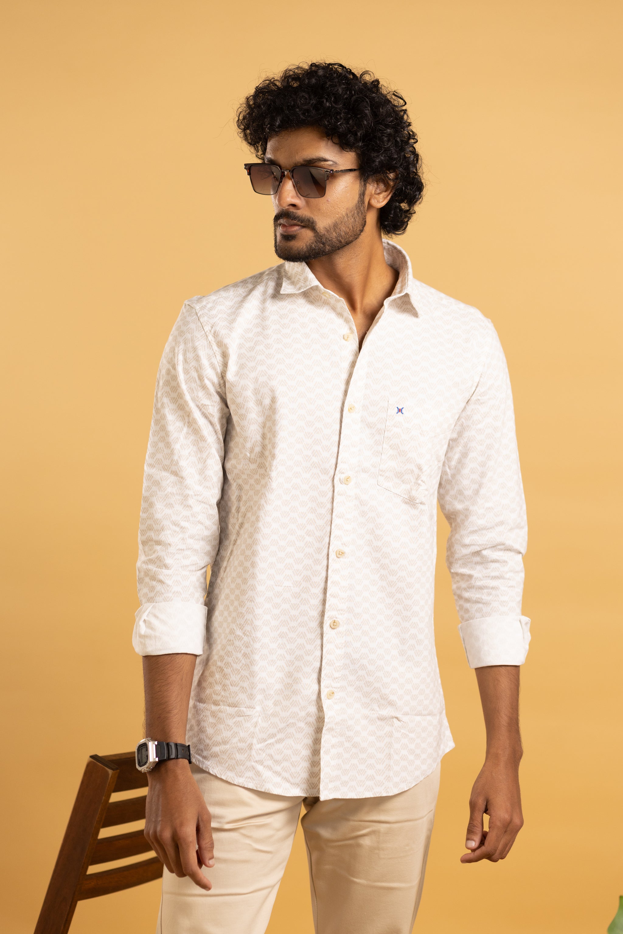 Elevate your wardrobe with this men's full sleeve shirt in a refined beige shade, featuring a subtle geometric print that adds understated elegance. Crafted to offer a sophisticated look, this shirt balances classic style with modern detail, making it perfect for both professional settings and upscale casual occasions. Its muted pattern ensures versatility, allowing effortless pairing with a variety of outfits.