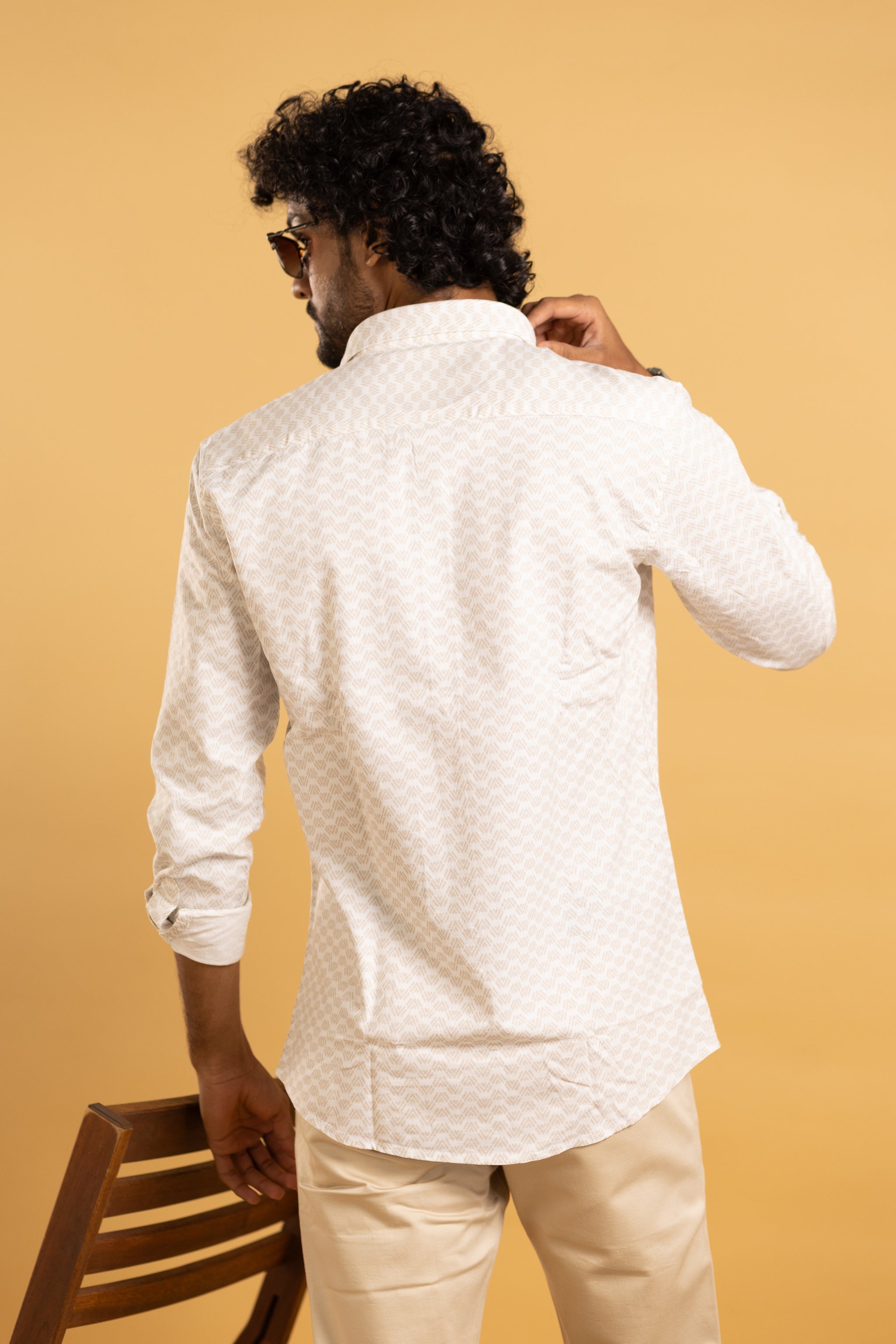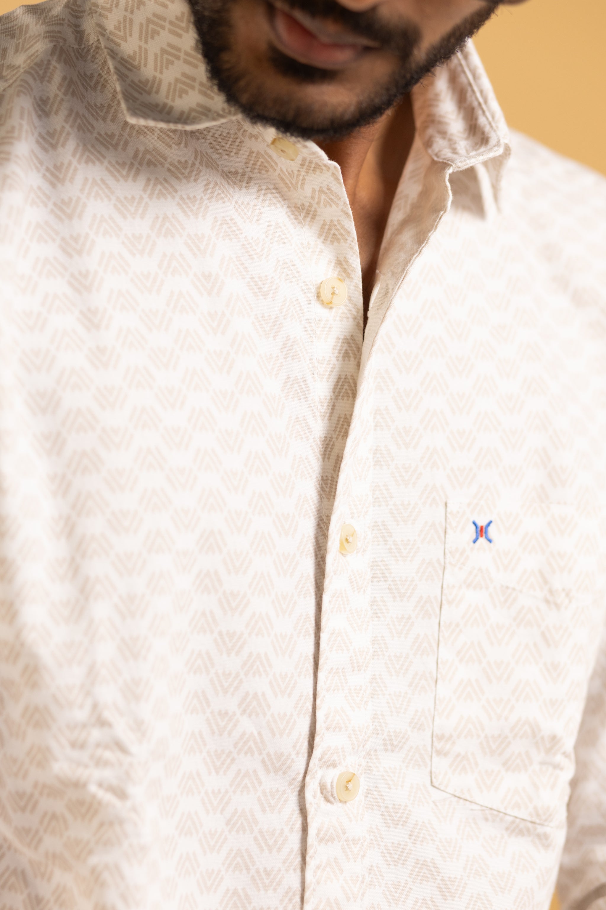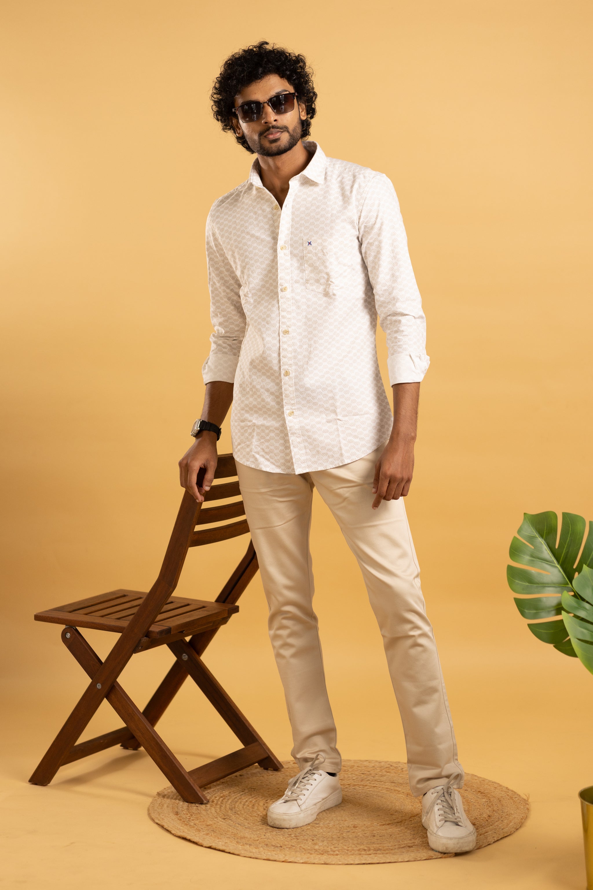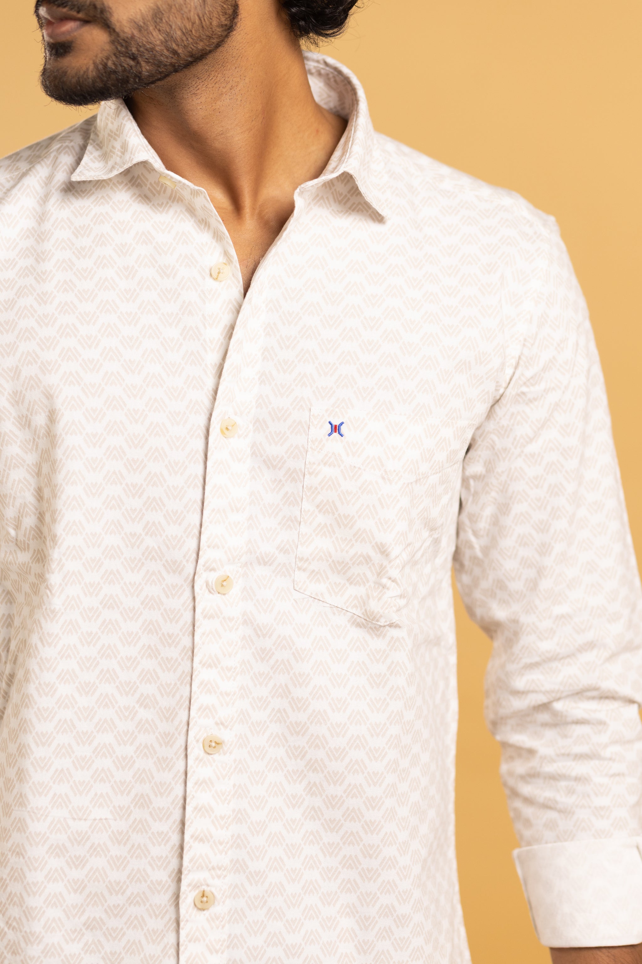 Elevate your wardrobe with this men's full sleeve shirt in a refined beige shade, featuring a subtle geometric print that adds understated elegance. Crafted to offer a sophisticated look, this shirt balances classic style with modern detail, making it perfect for both professional settings and upscale casual occasions. Its muted pattern ensures versatility, allowing effortless pairing with a variety of outfits.