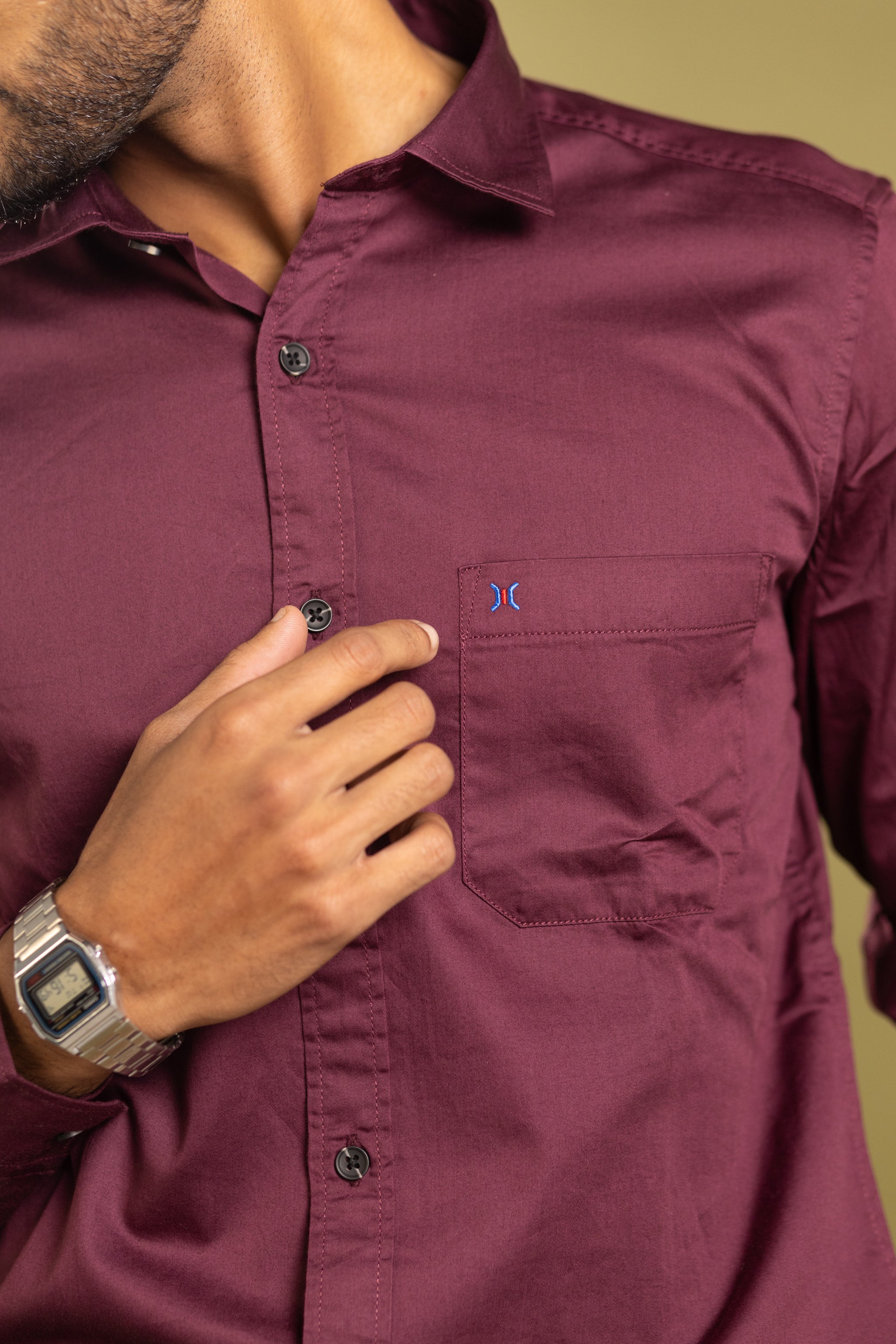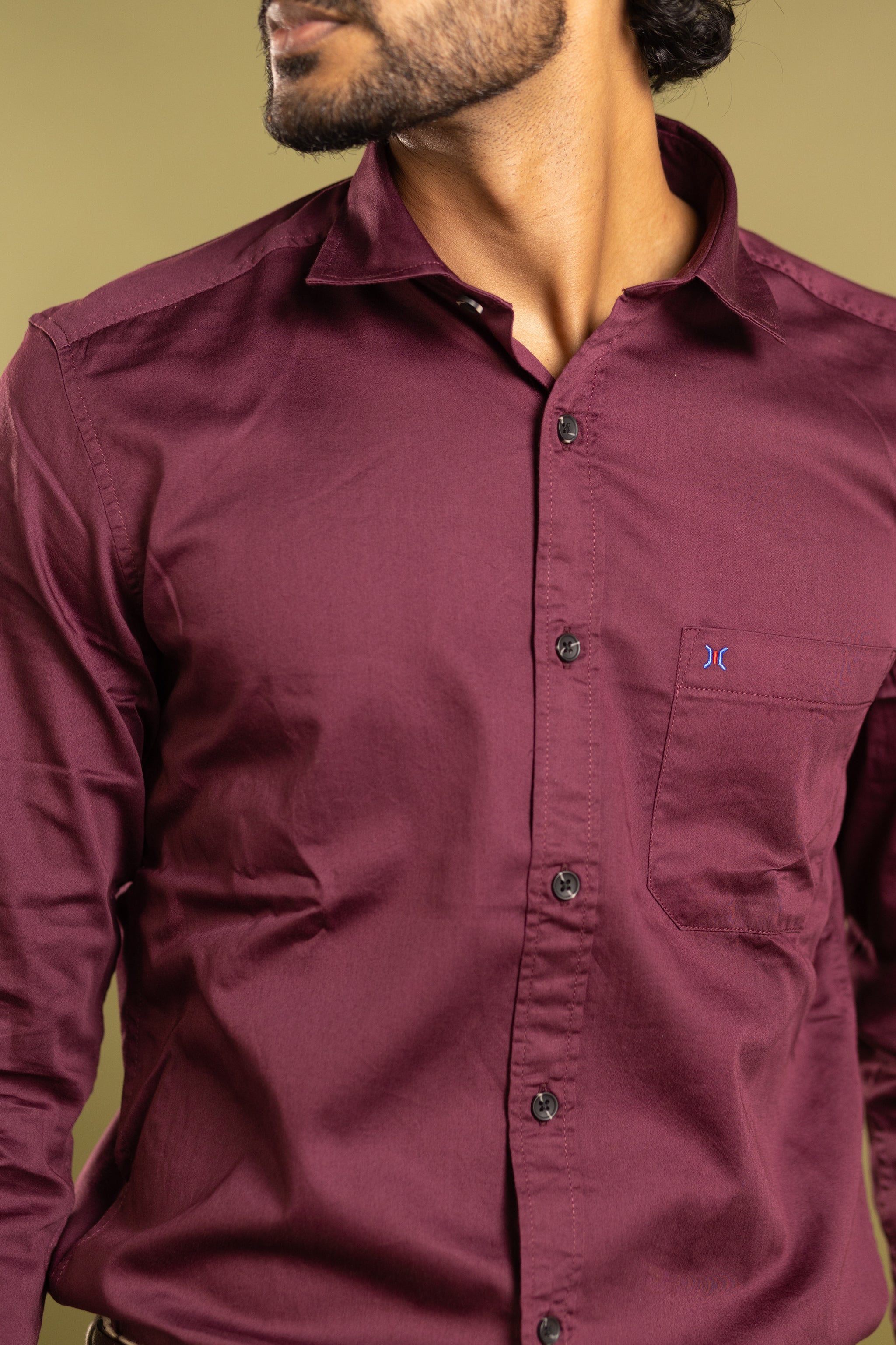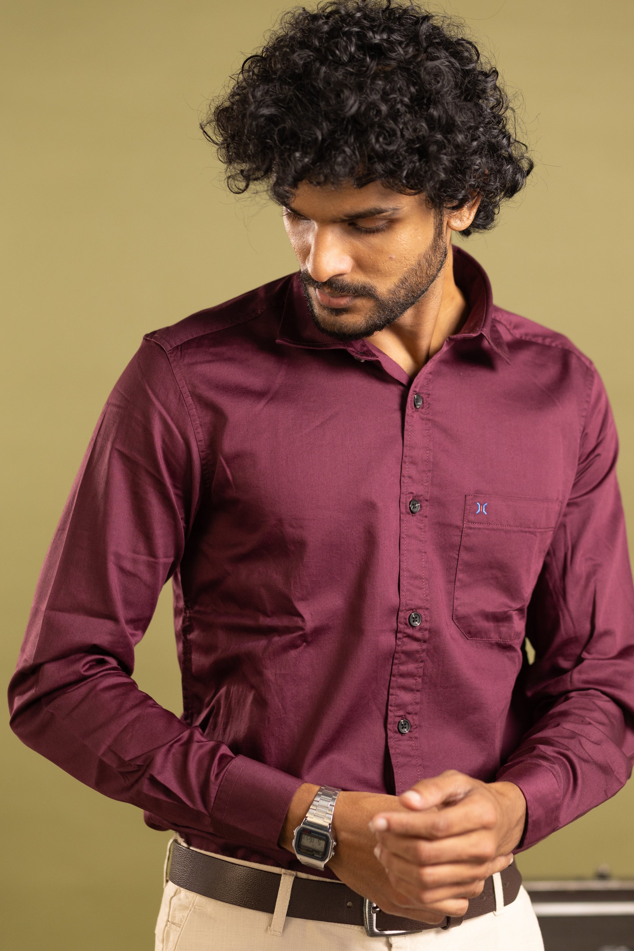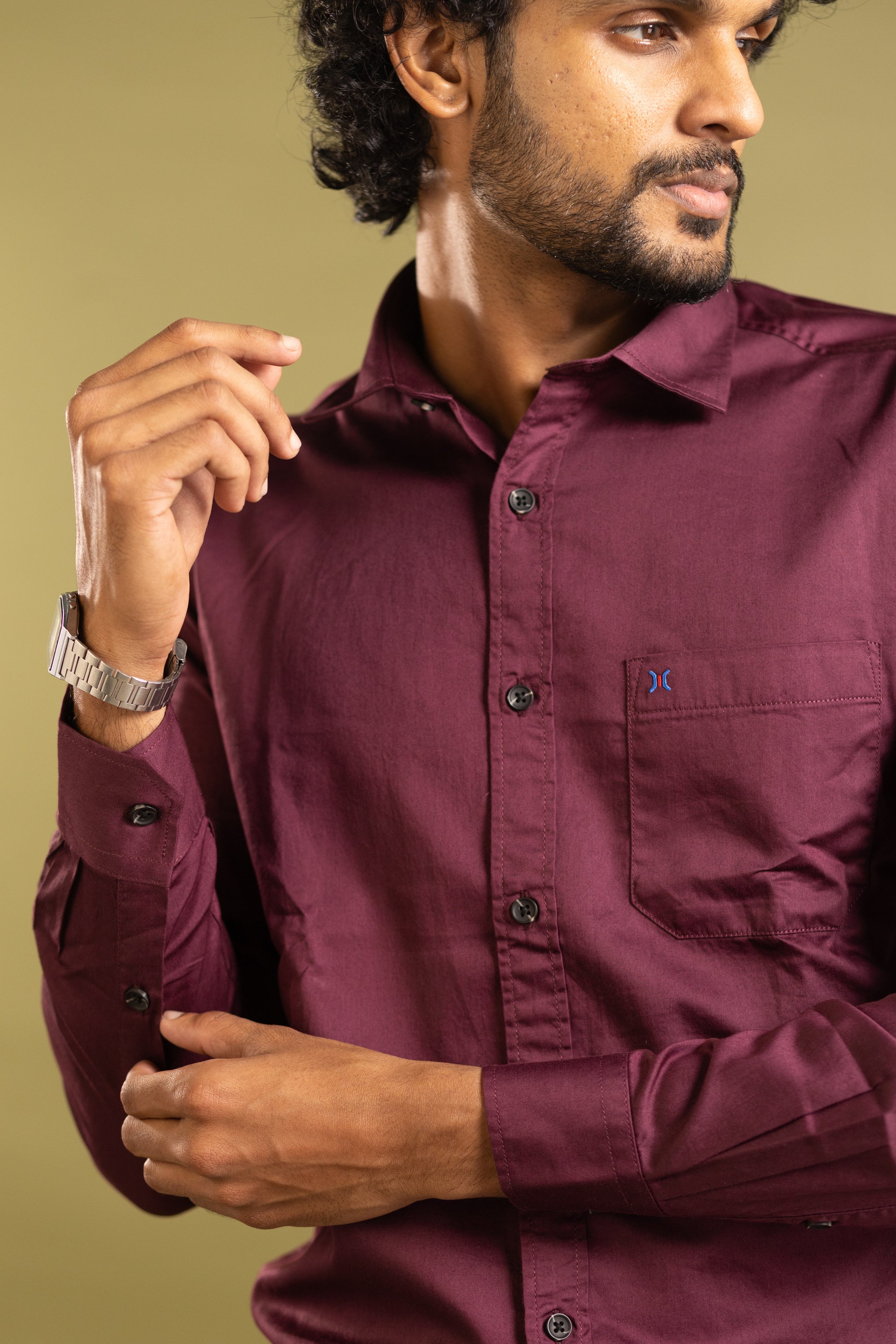 This men's full sleeve shirt in a rich dark wine hue offers a refined and timeless look. Crafted for a sleek silhouette, its solid color ensures versatility, making it perfect for both formal occasions and upscale casual events. The full sleeves add a touch of sophistication, balancing comfort with style effortlessly.