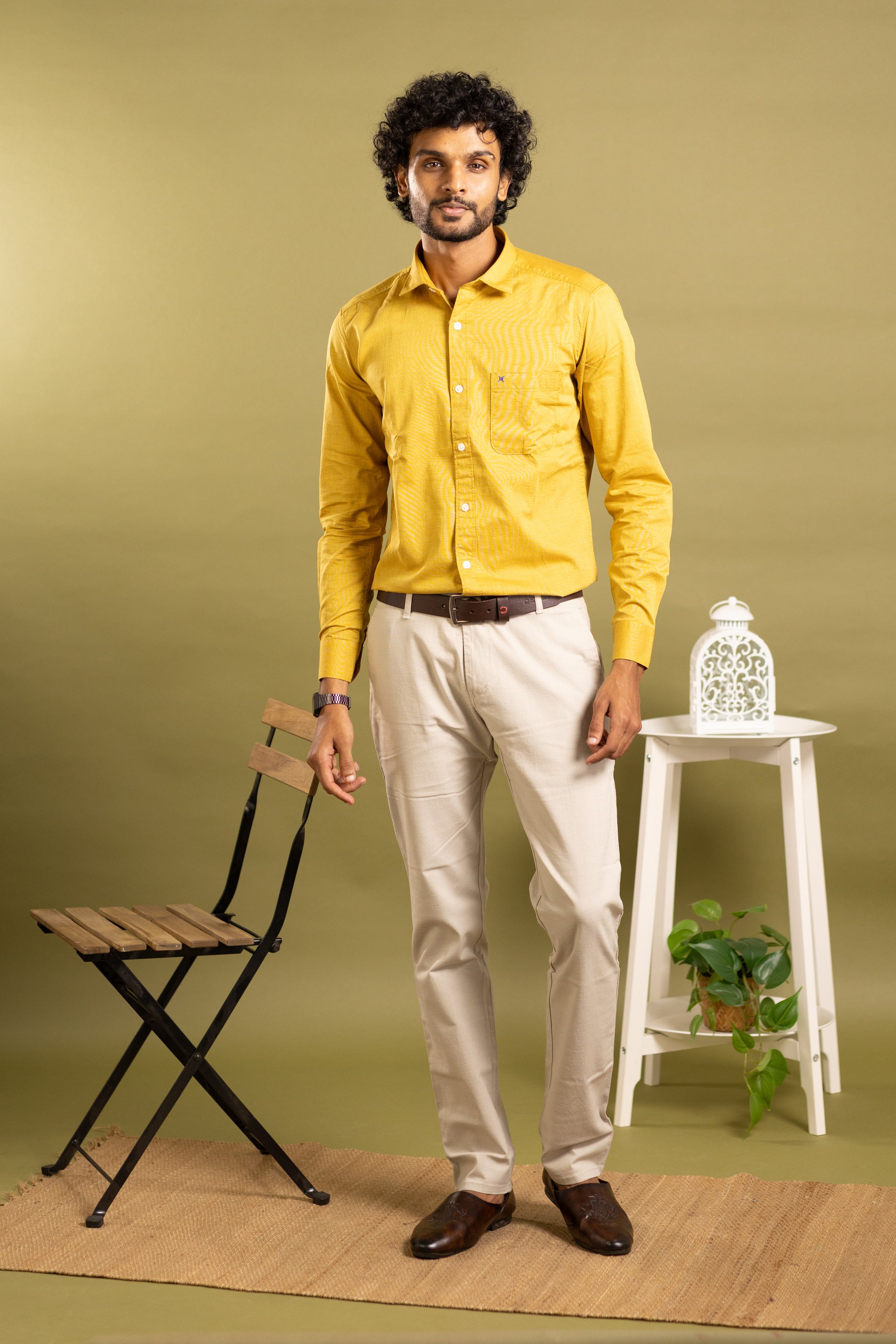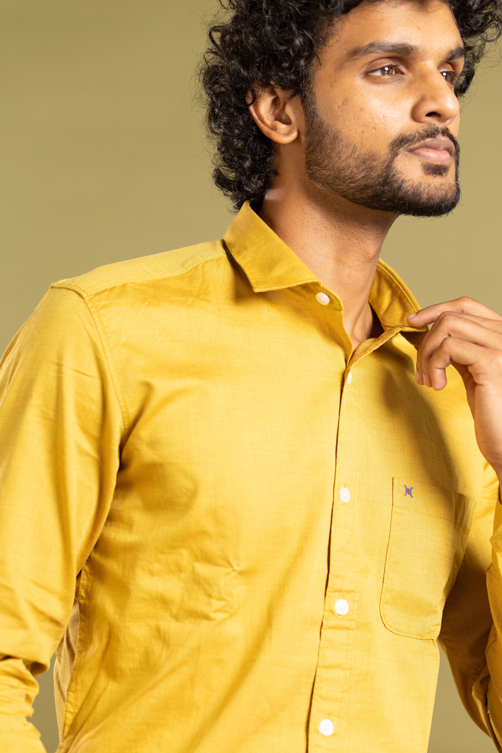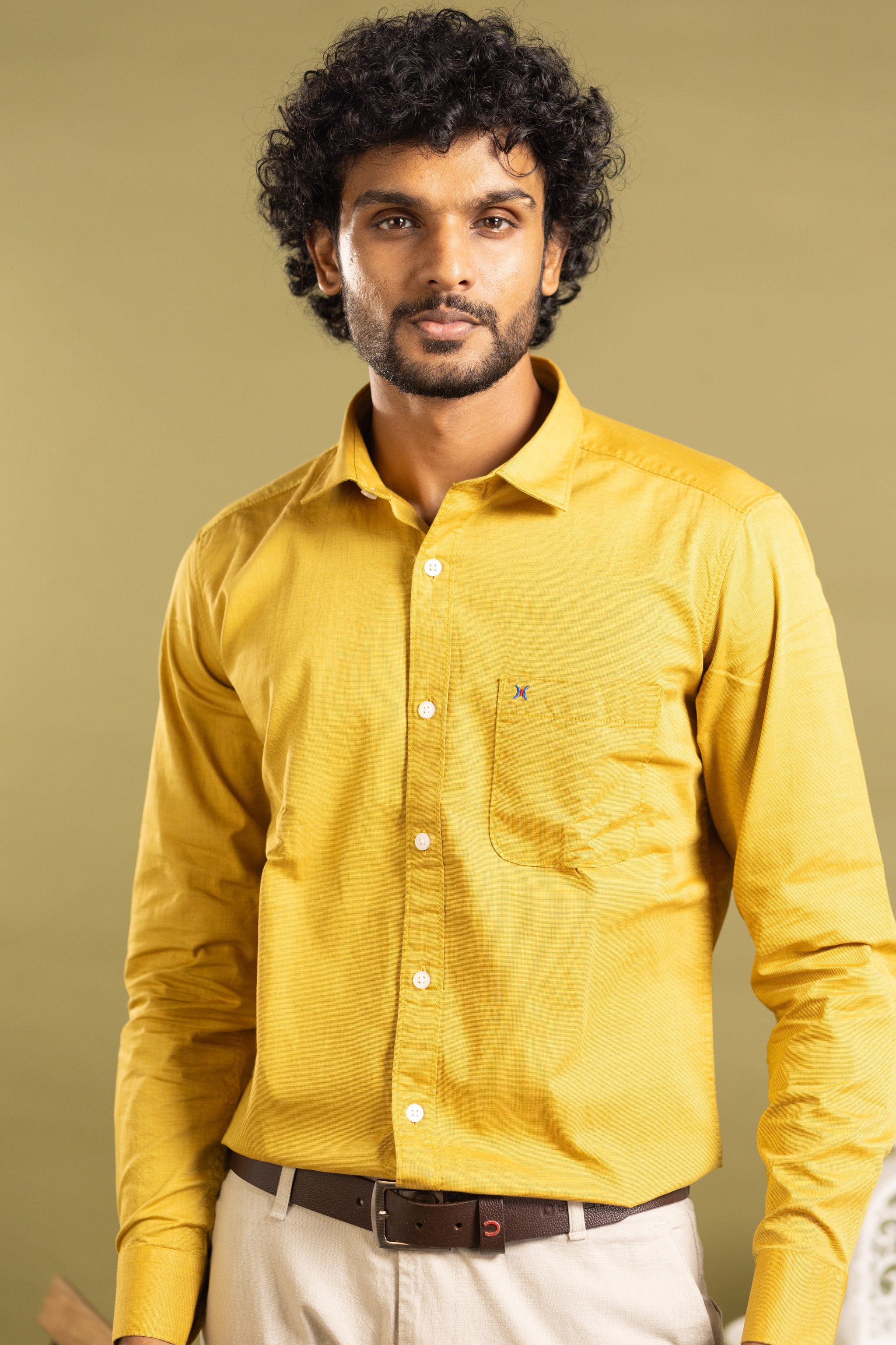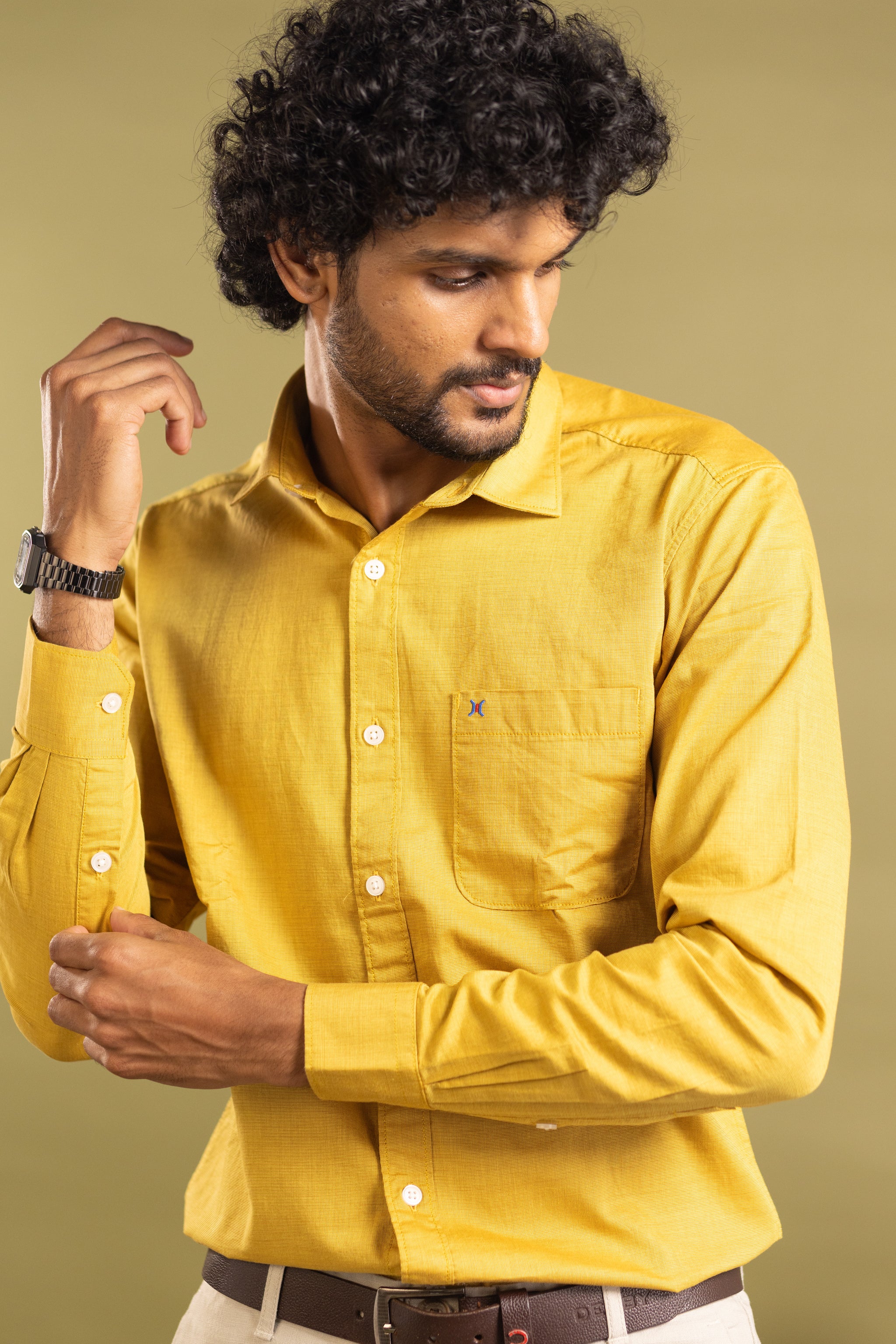 Elevate your wardrobe with this men's full sleeve shirt in a rich mustard yellow. Its solid tone offers versatility, making it perfect for both formal occasions and smart casual settings. Crafted for a comfortable fit, this shirt blends classic style with a contemporary edge, ensuring you stand out with understated sophistication.