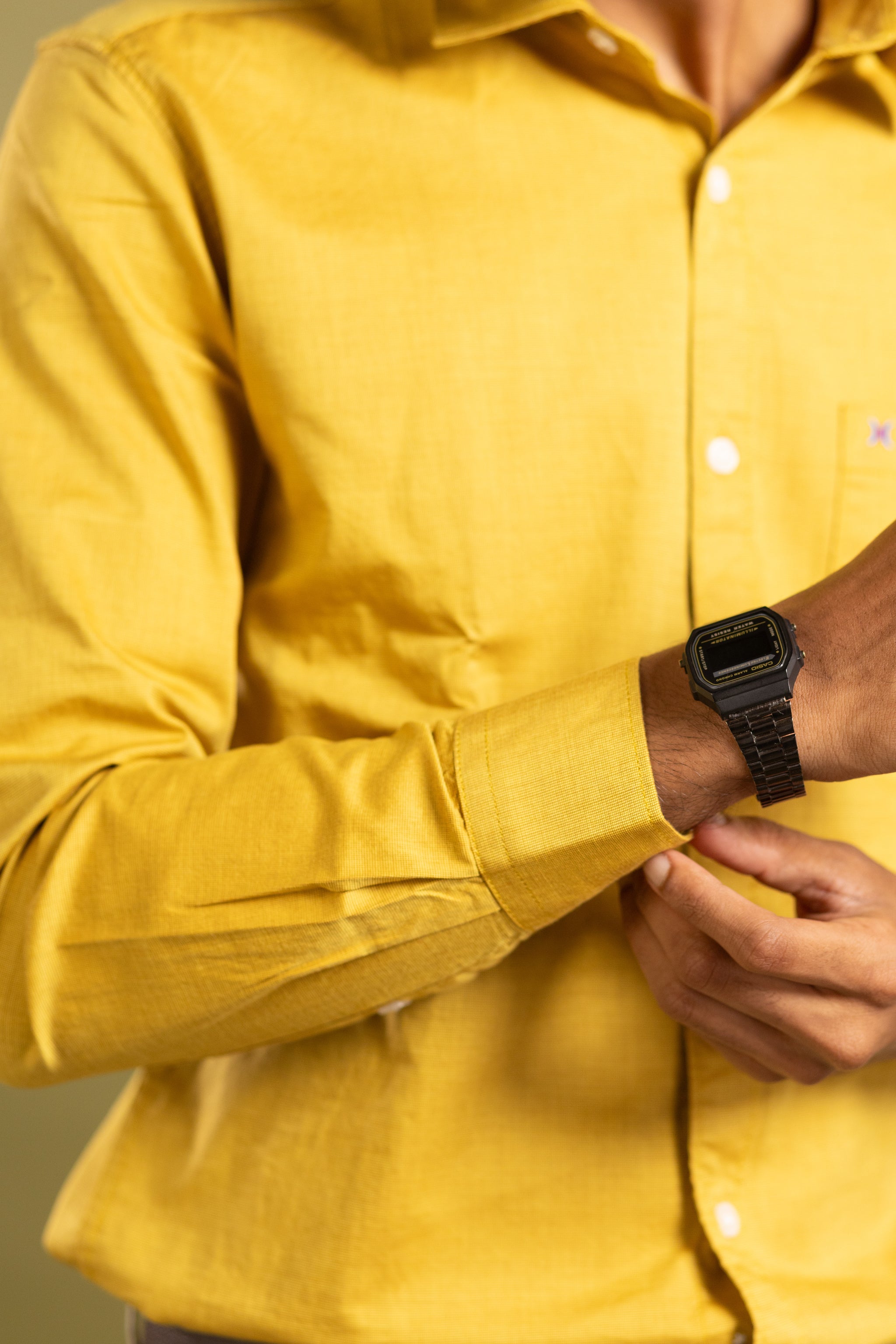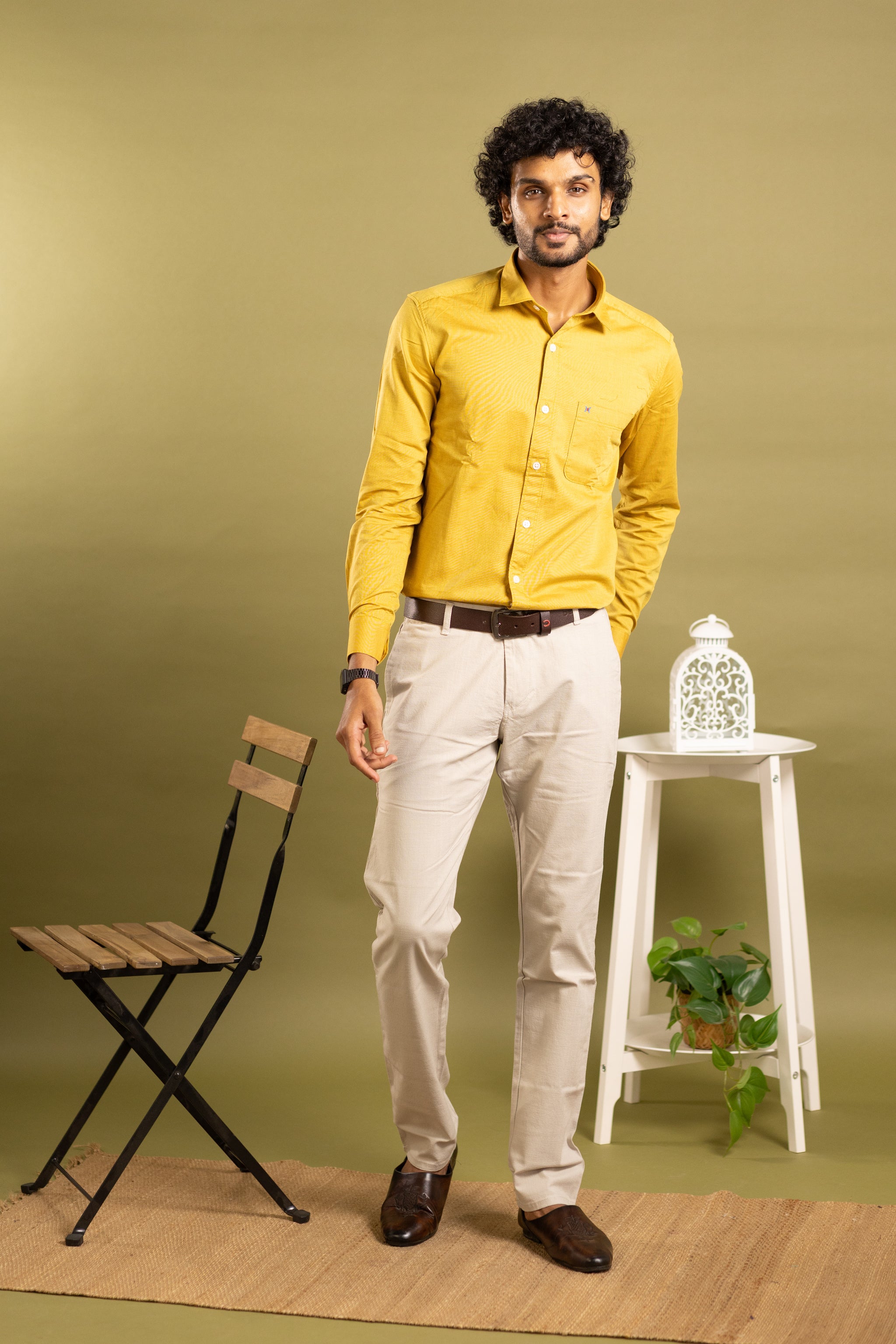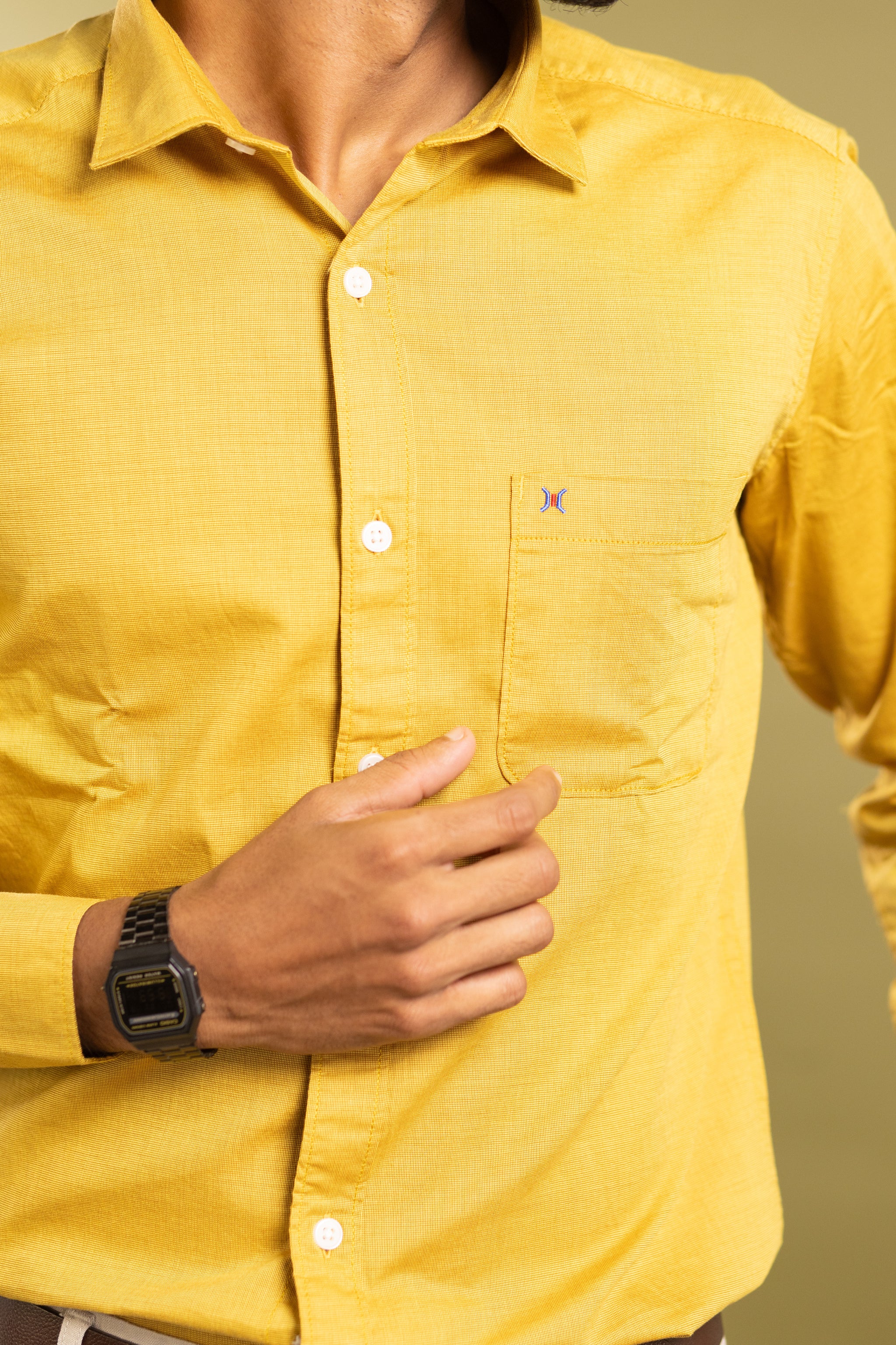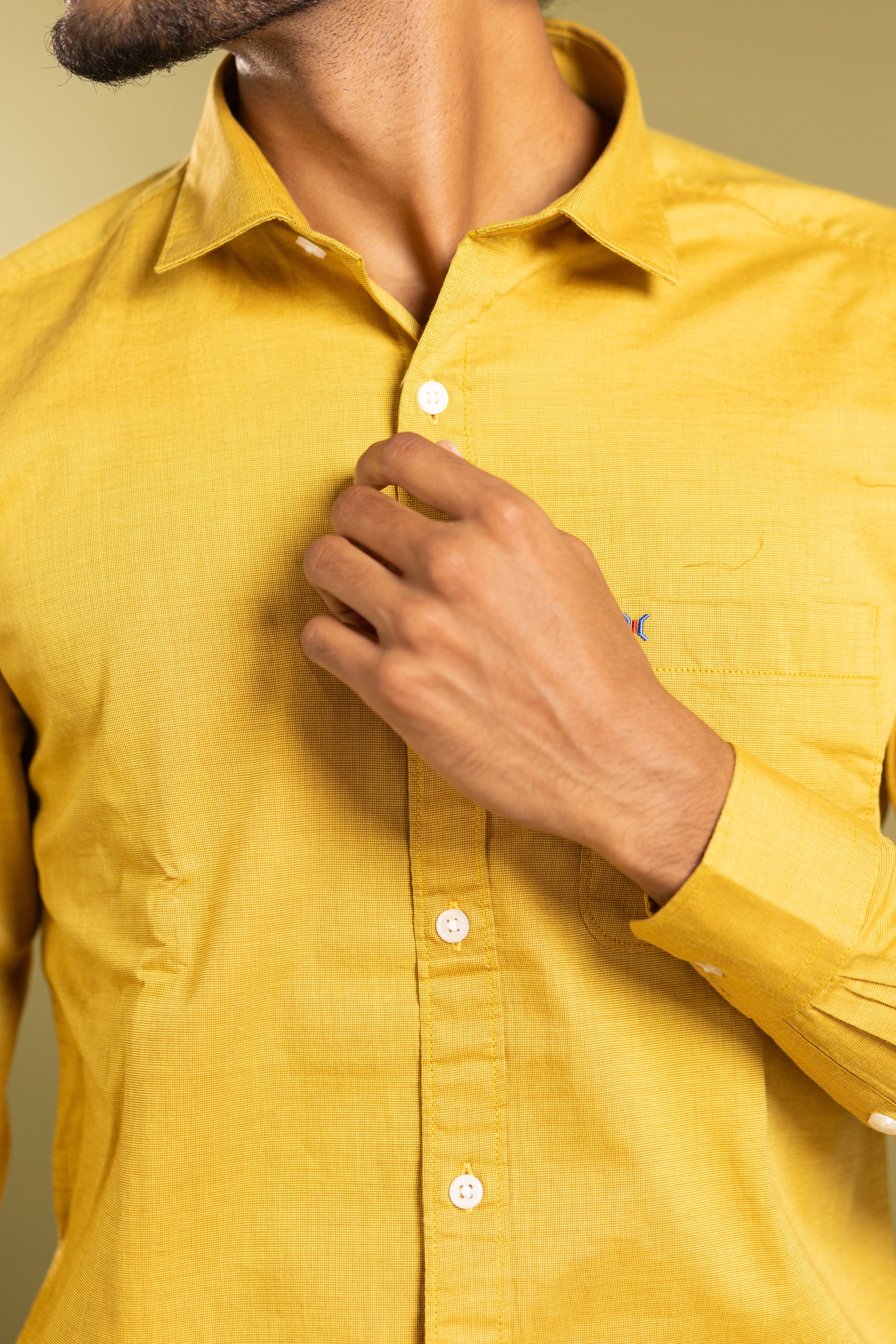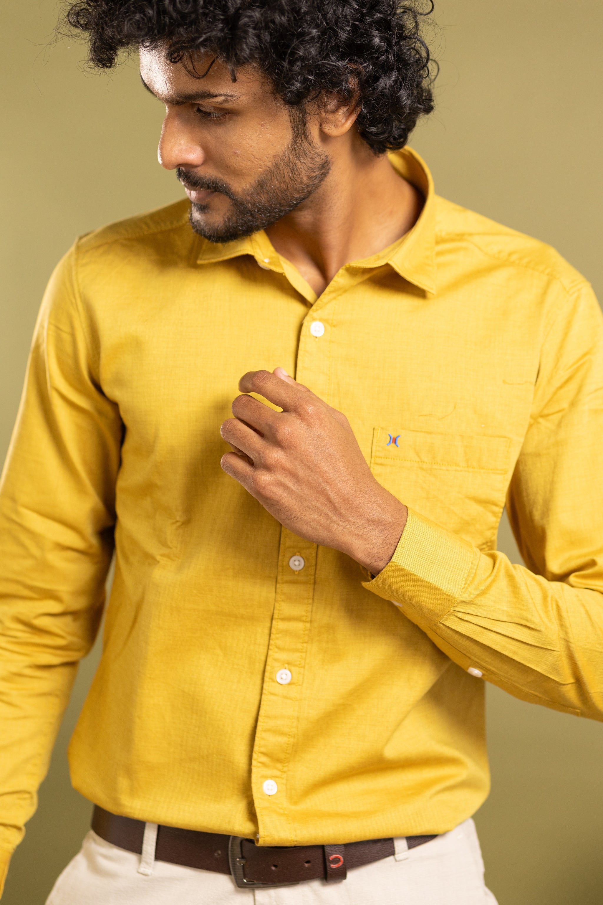 Elevate your wardrobe with this men's full sleeve shirt in a rich mustard yellow. Its solid tone offers versatility, making it perfect for both formal occasions and smart casual settings. Crafted for a comfortable fit, this shirt blends classic style with a contemporary edge, ensuring you stand out with understated sophistication.