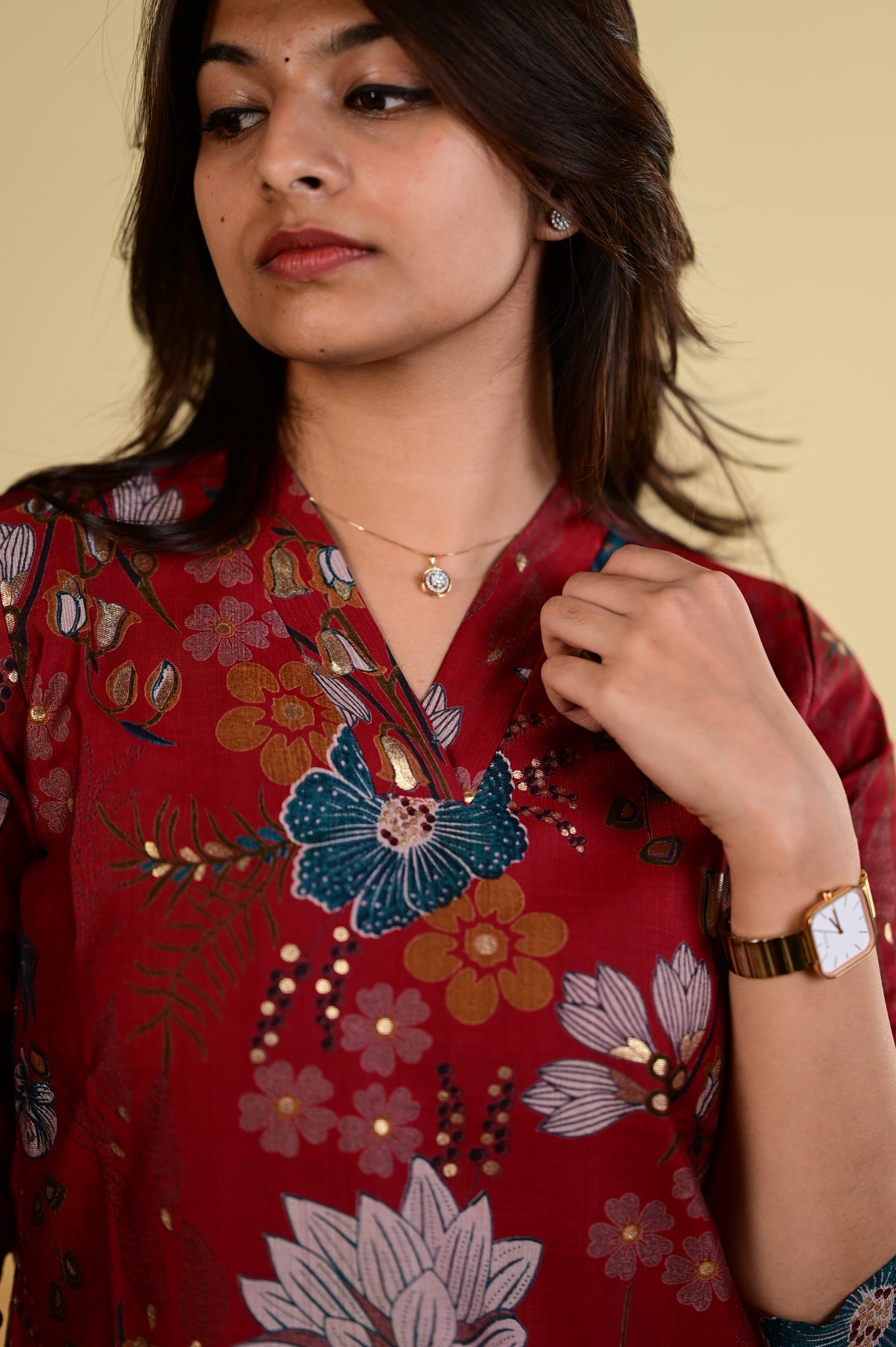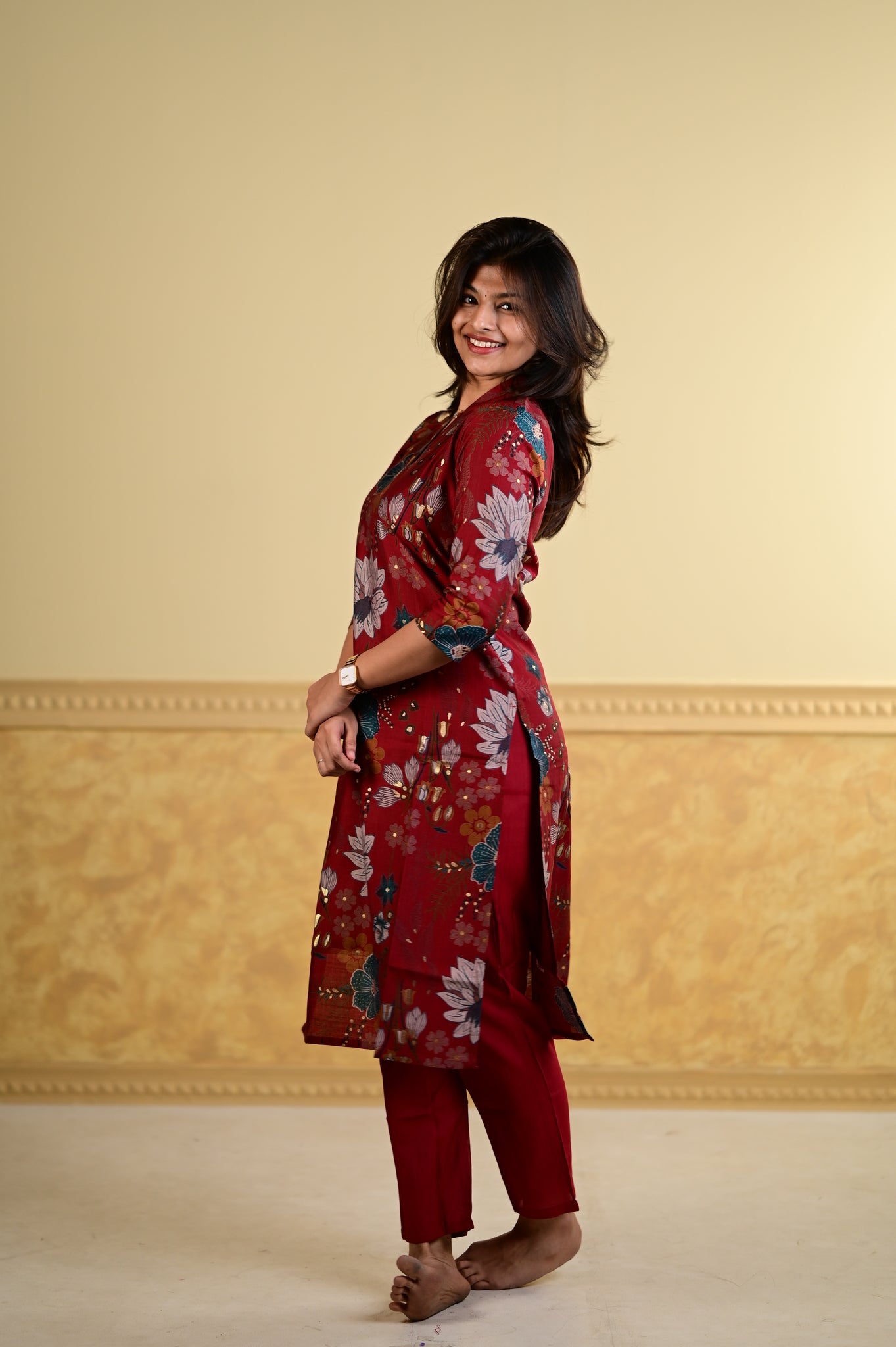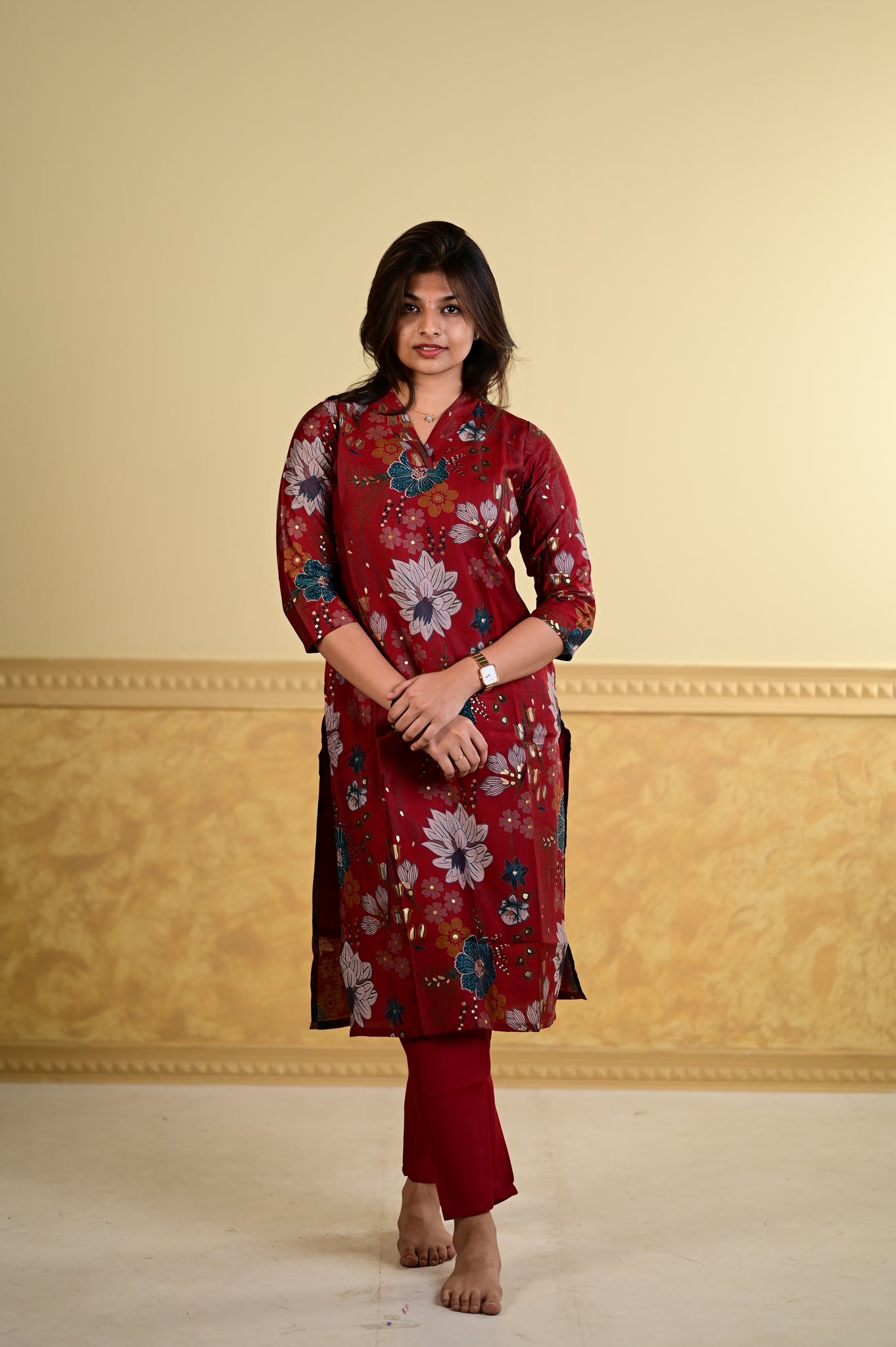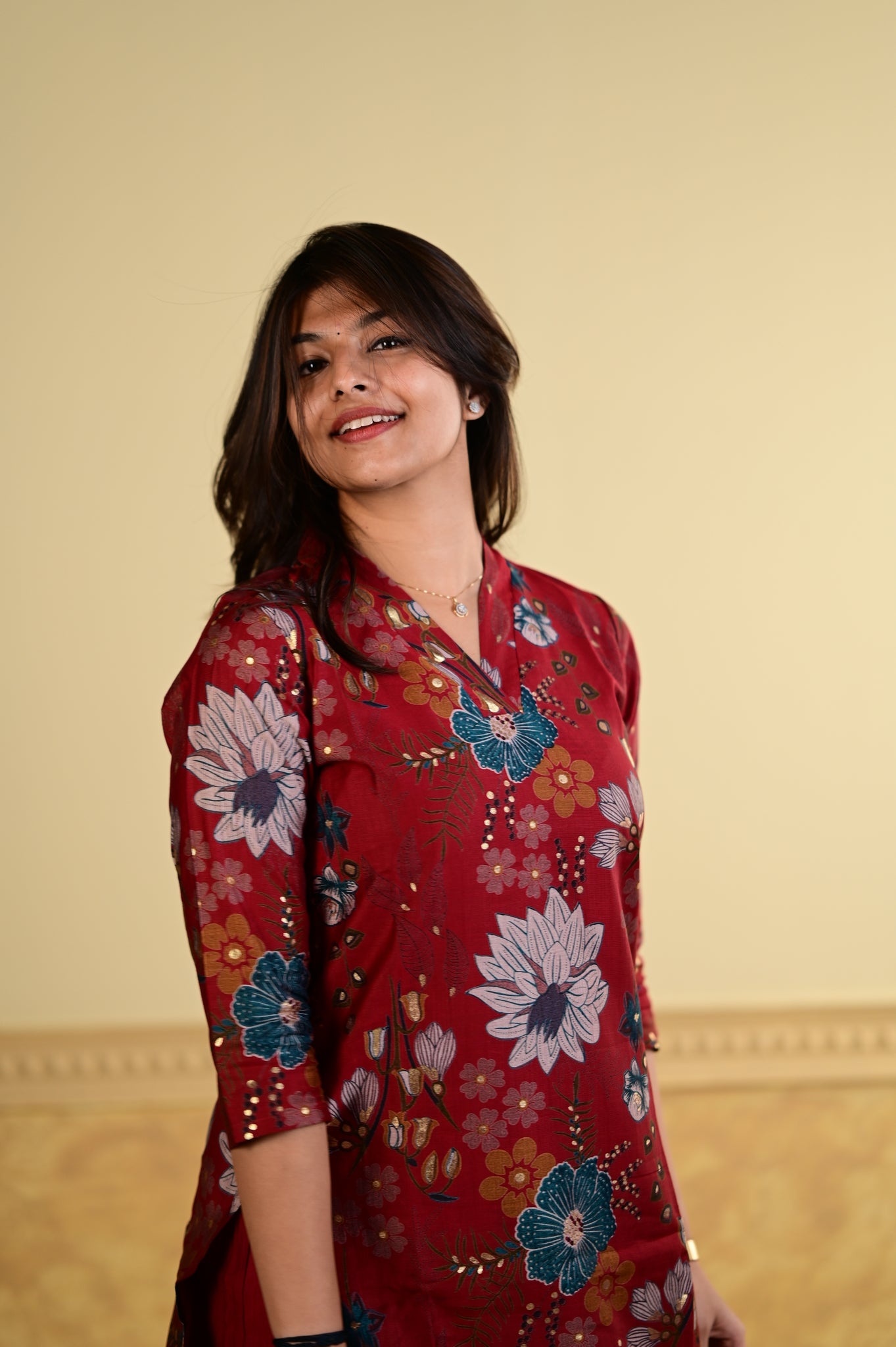 Elevate your everyday wardrobe with the Navya floral printed kurti in a striking red hue. This sophisticated piece features an intricate floral design that brings timeless elegance to traditional wear.