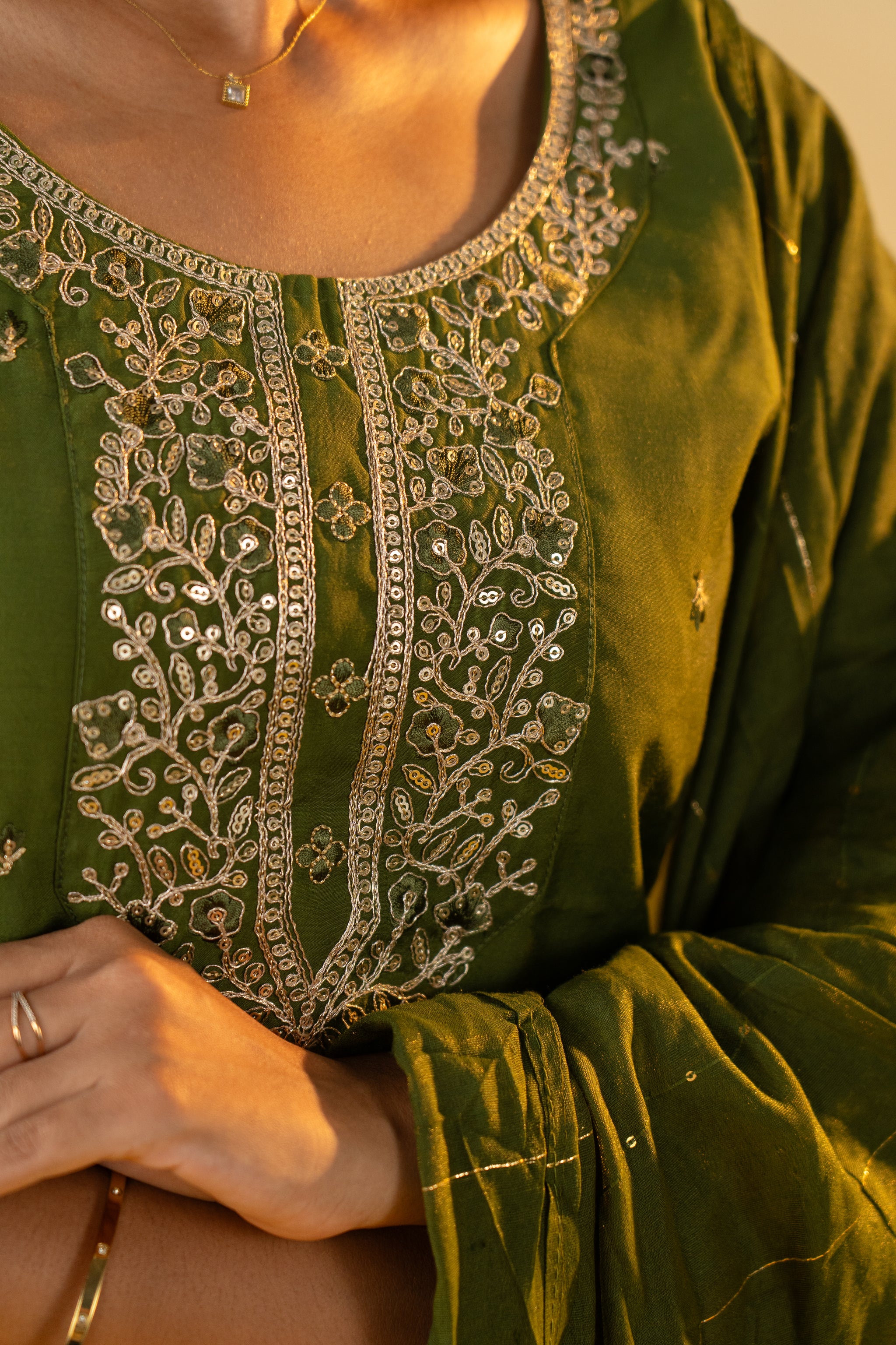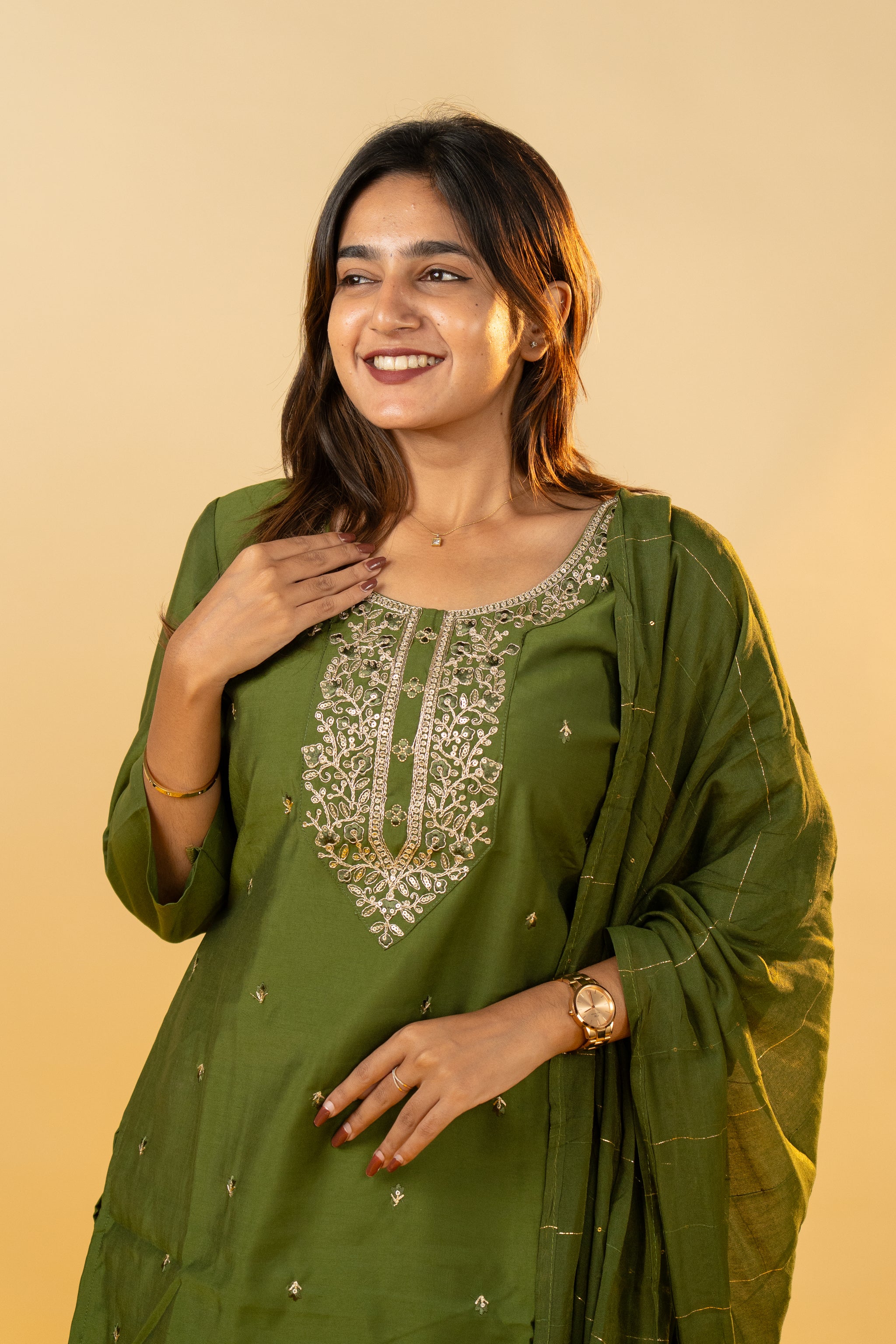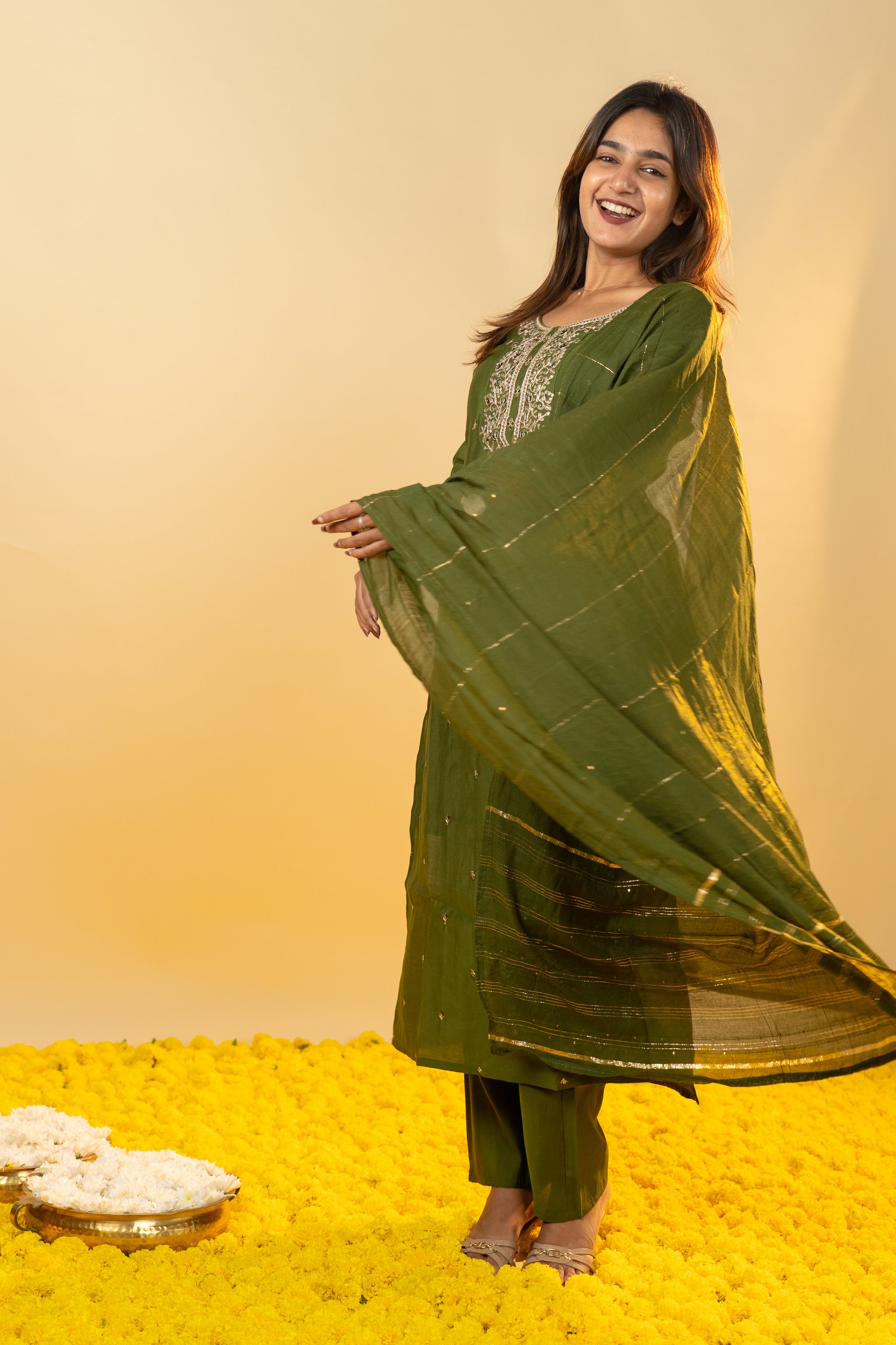 Elevate your ethnic wardrobe with the Pallavi salwar set in rich dark green. Crafted for a refined look, this ensemble pairs timeless elegance with comfortable wear. Its deep hue complements various occasions, offering a sophisticated charm that enhances your style effortlessly. Perfect for those who appreciate subtle yet striking traditional attire.