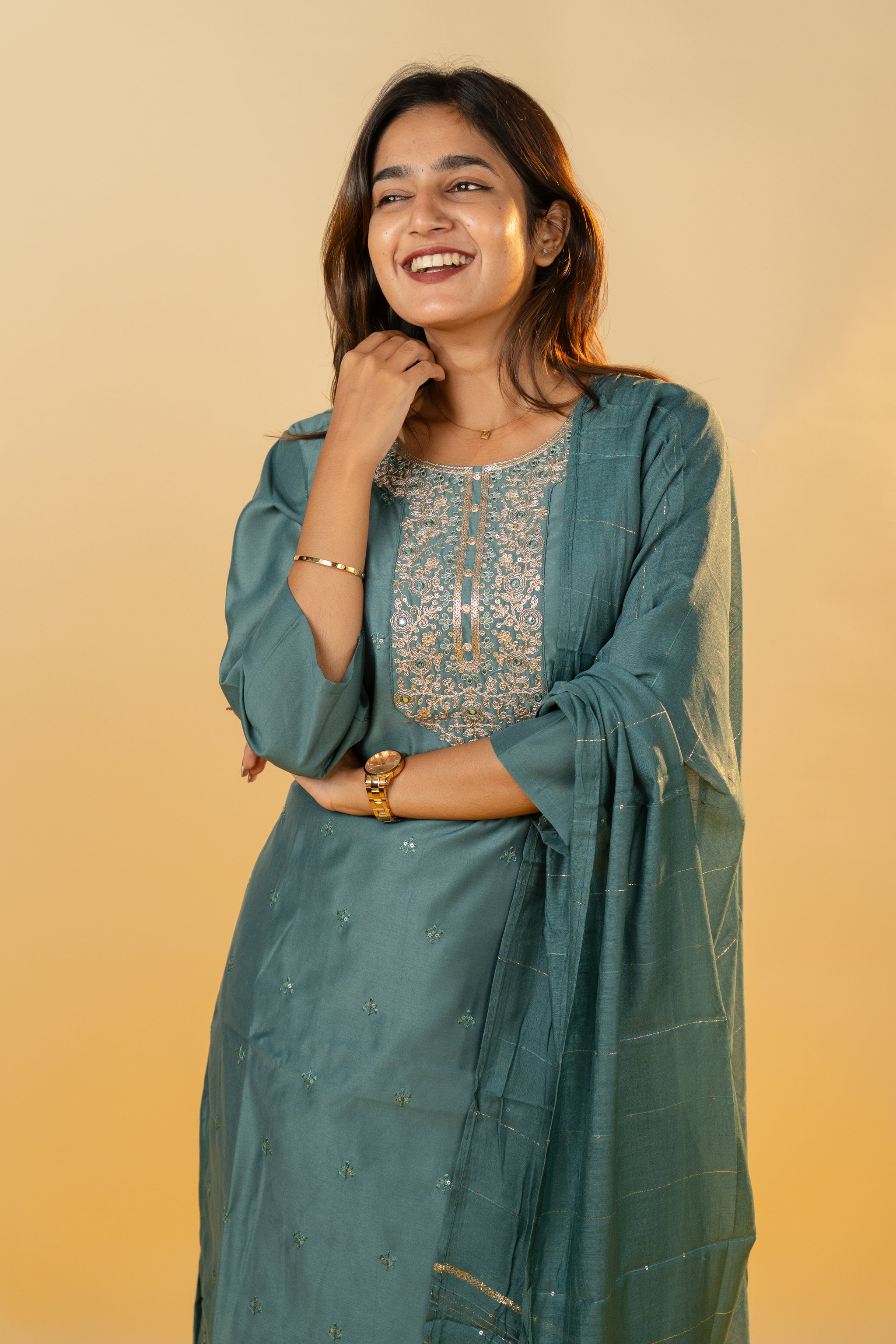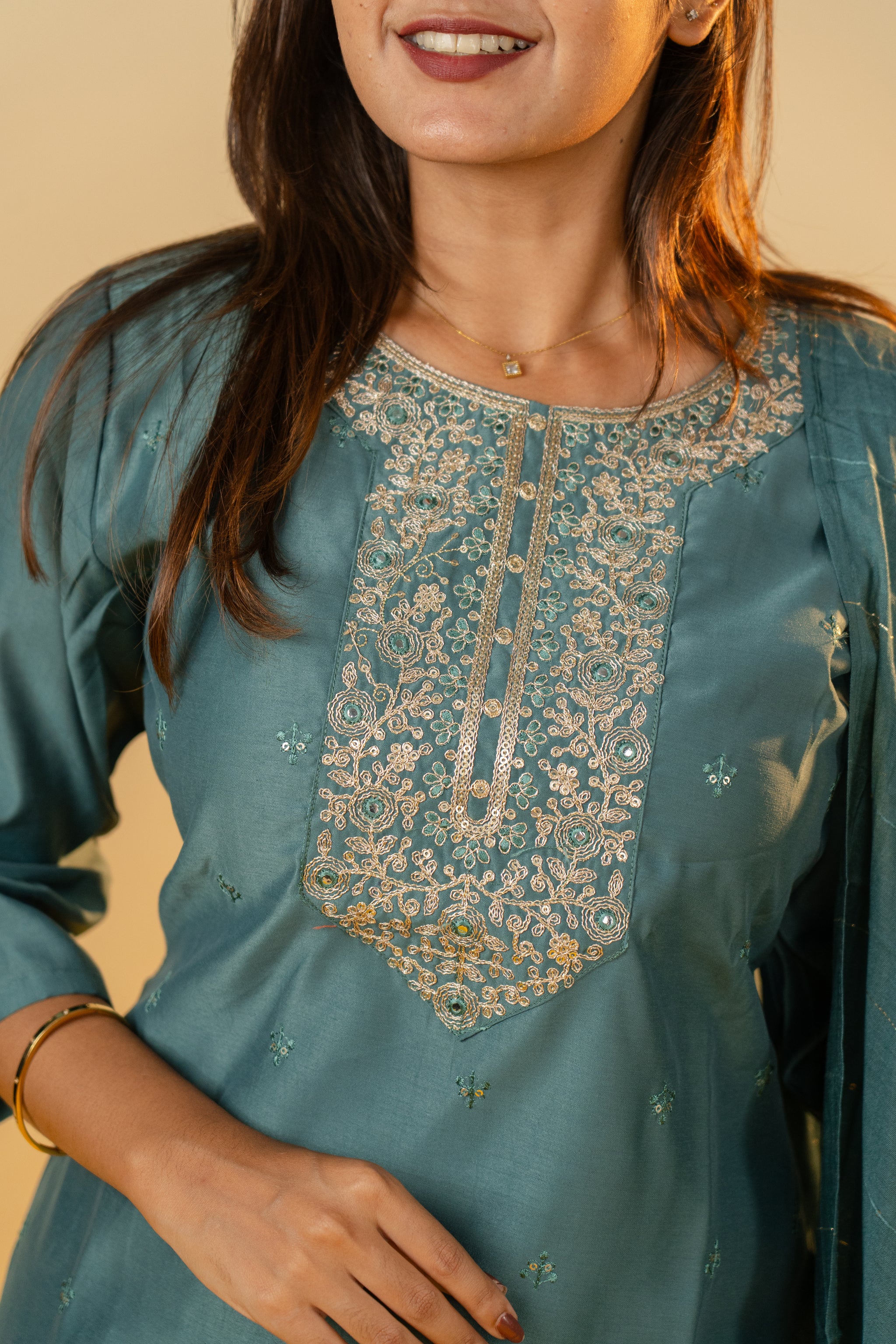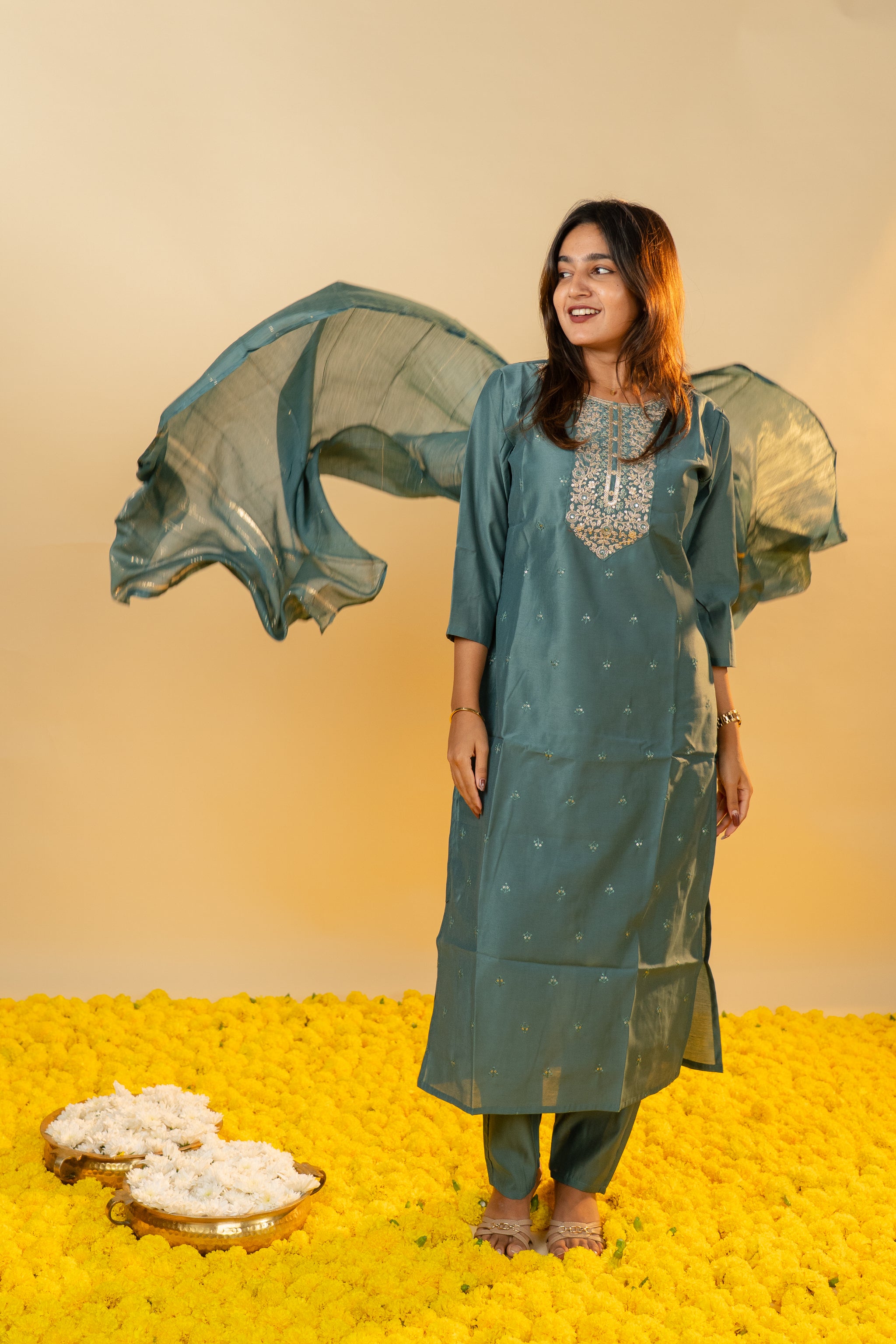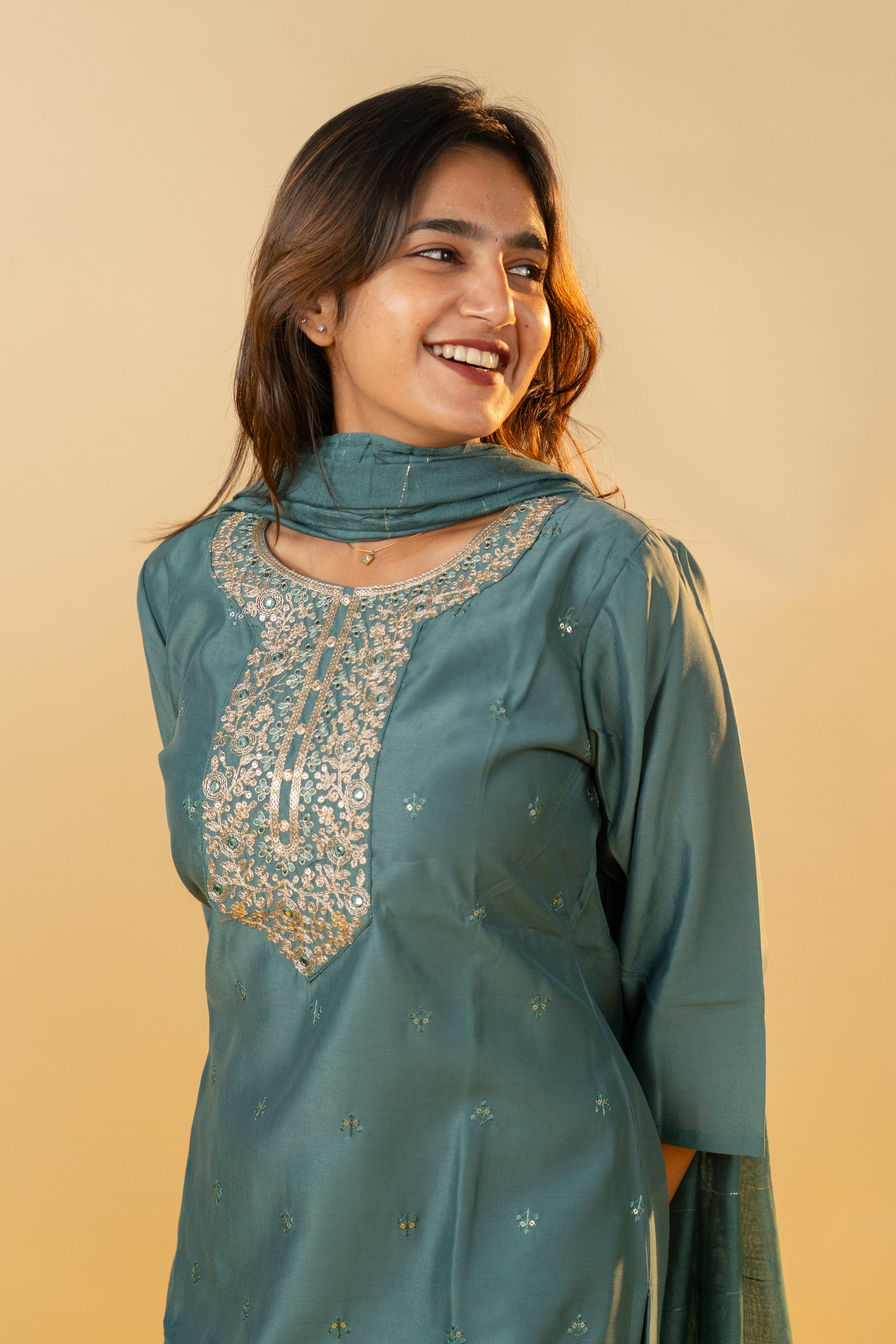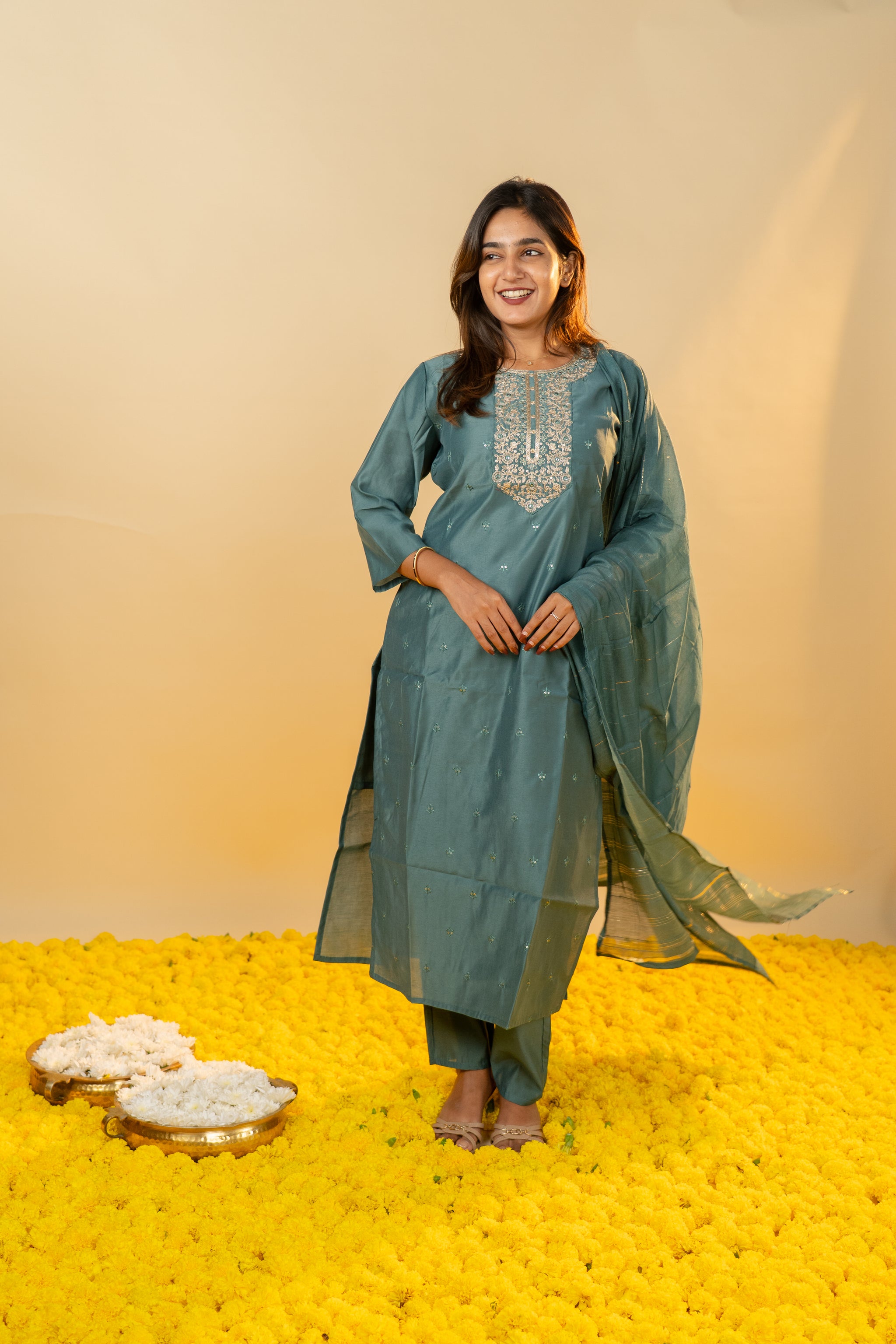 The Pallavi salwar set in sophisticated grey combines classic elegance with contemporary style. Crafted from smooth, high-quality fabric, this set offers a tailored fit that enhances your silhouette with subtle grace. Perfect for formal gatherings or refined everyday wear, it adds a touch of understated luxury to your wardrobe.