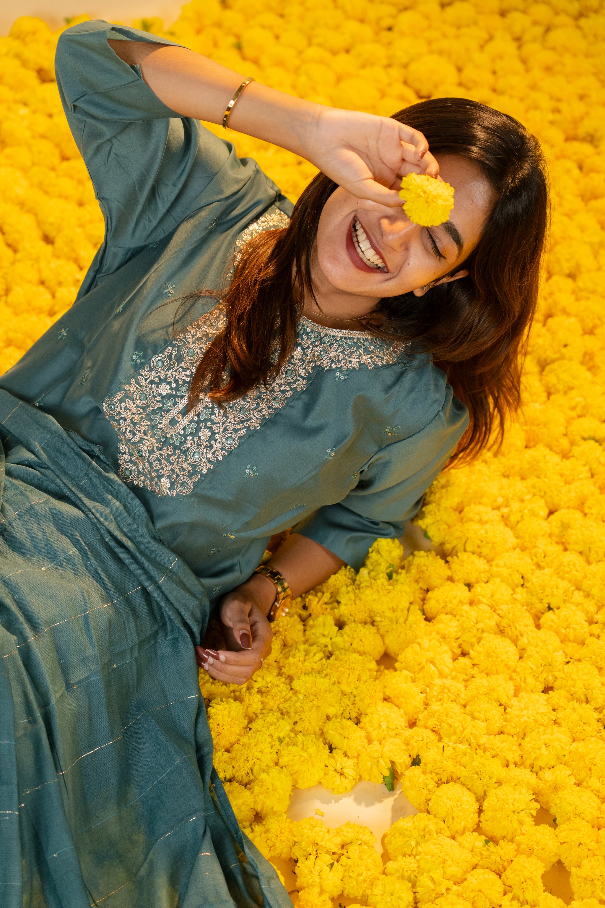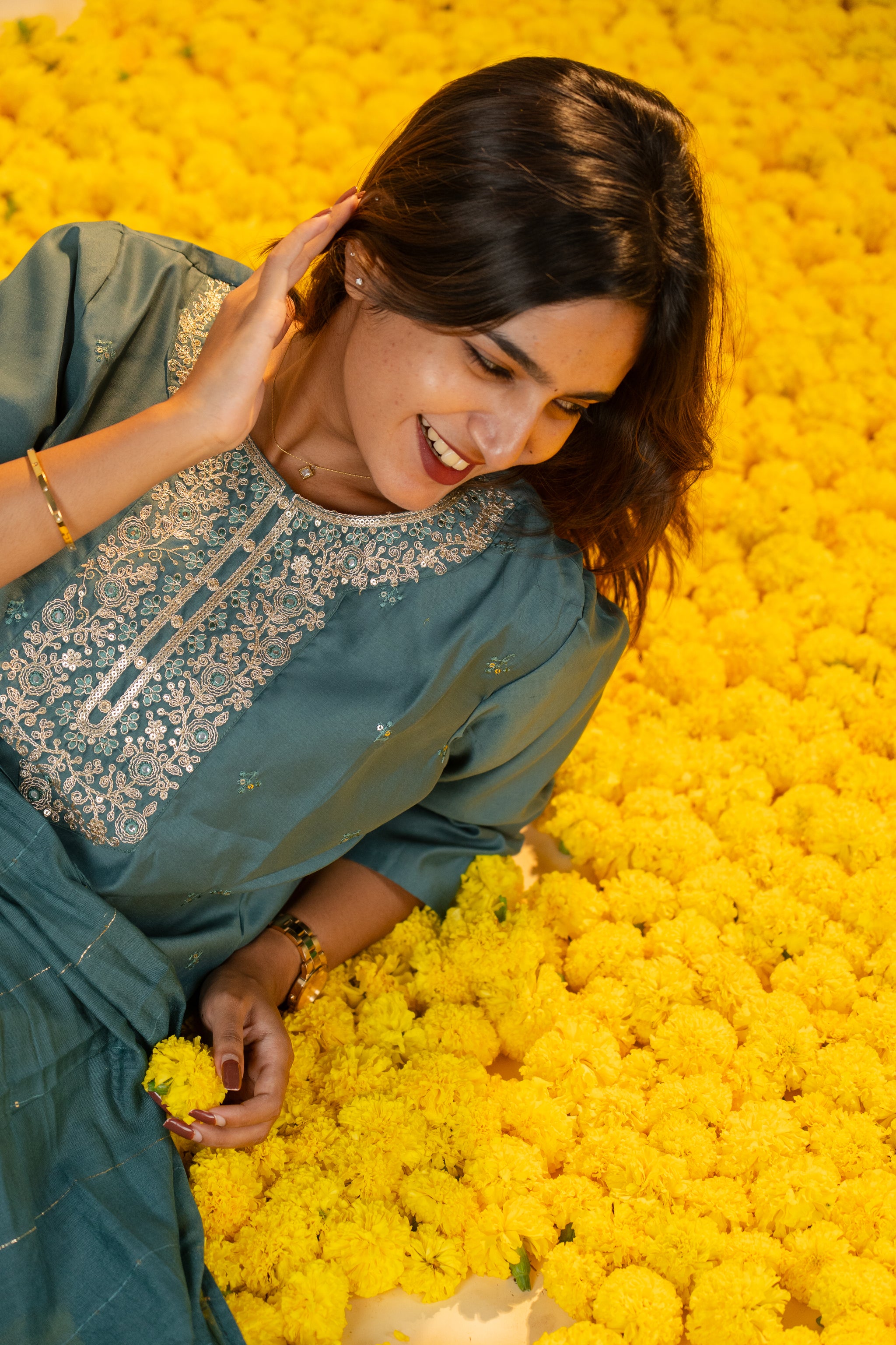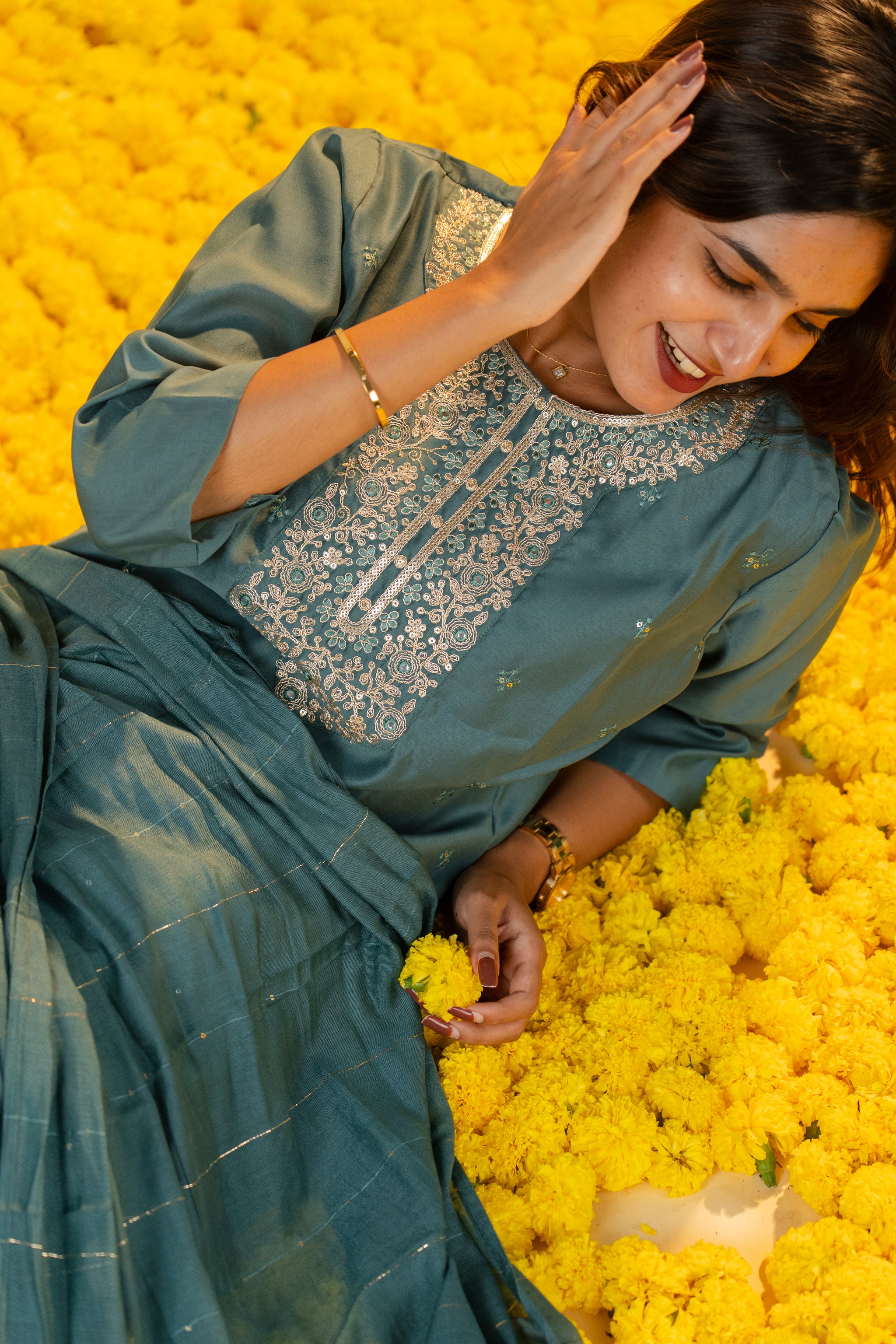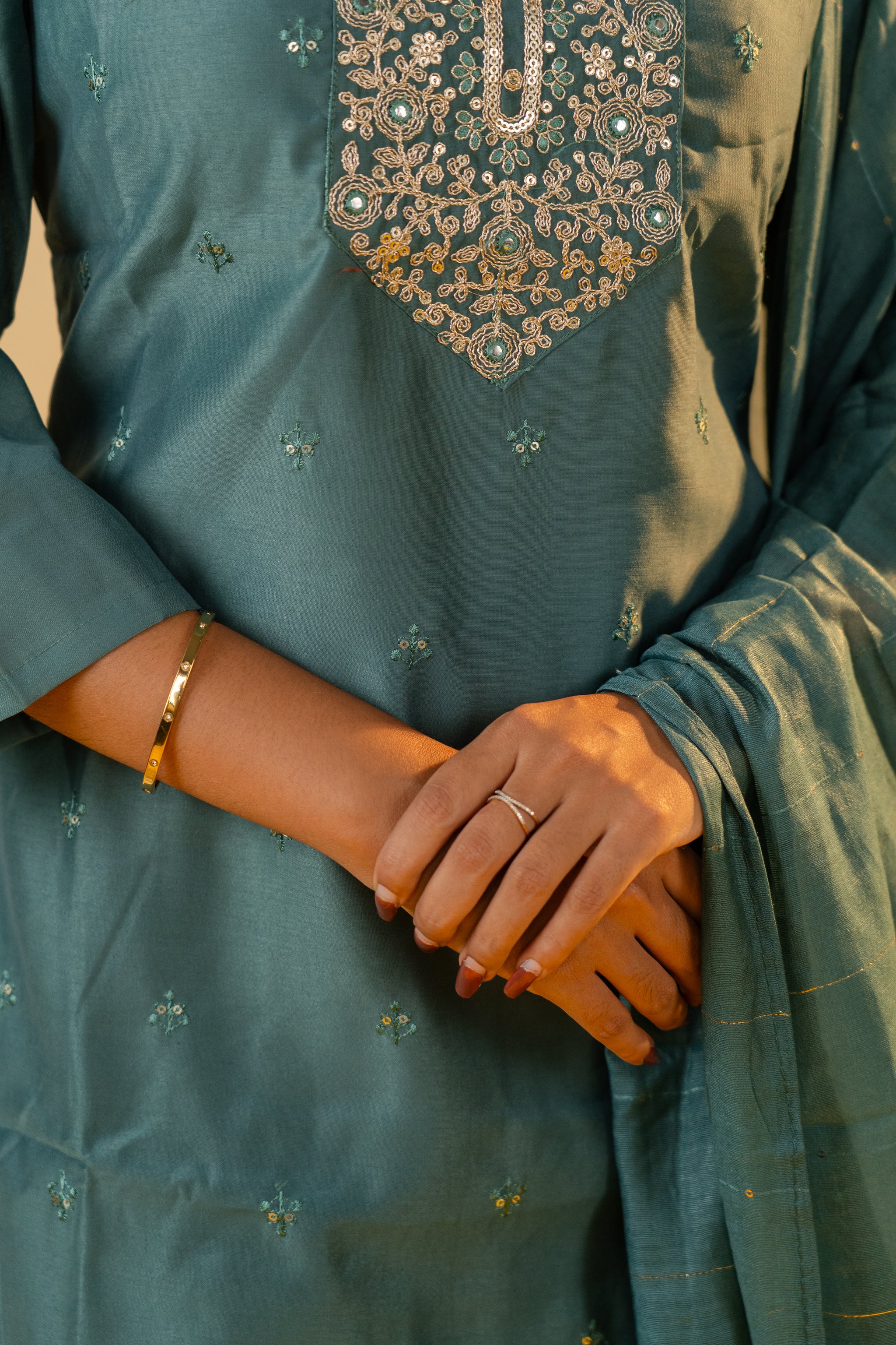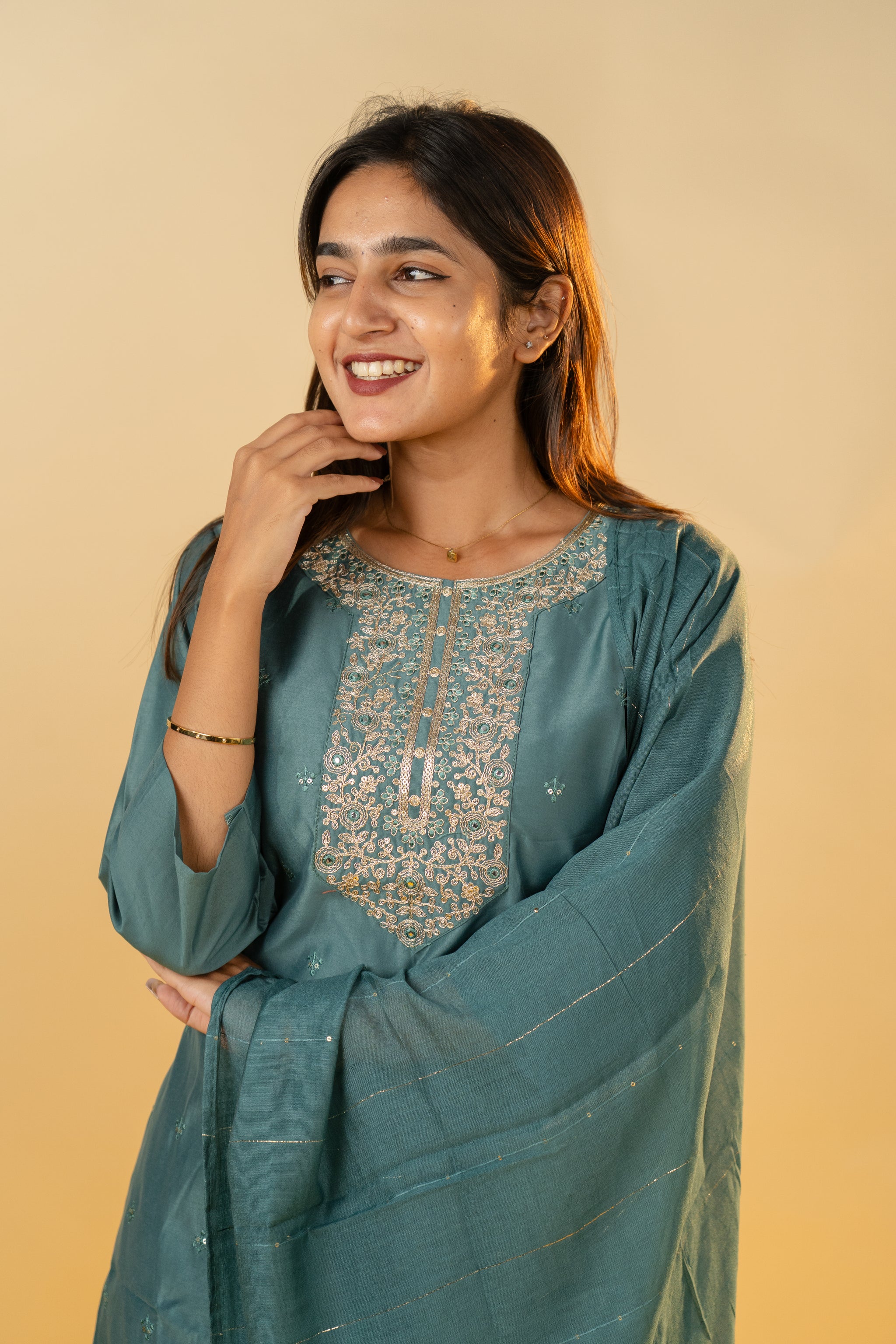 The Pallavi salwar set in sophisticated grey combines classic elegance with contemporary style. Crafted from smooth, high-quality fabric, this set offers a tailored fit that enhances your silhouette with subtle grace. Perfect for formal gatherings or refined everyday wear, it adds a touch of understated luxury to your wardrobe.