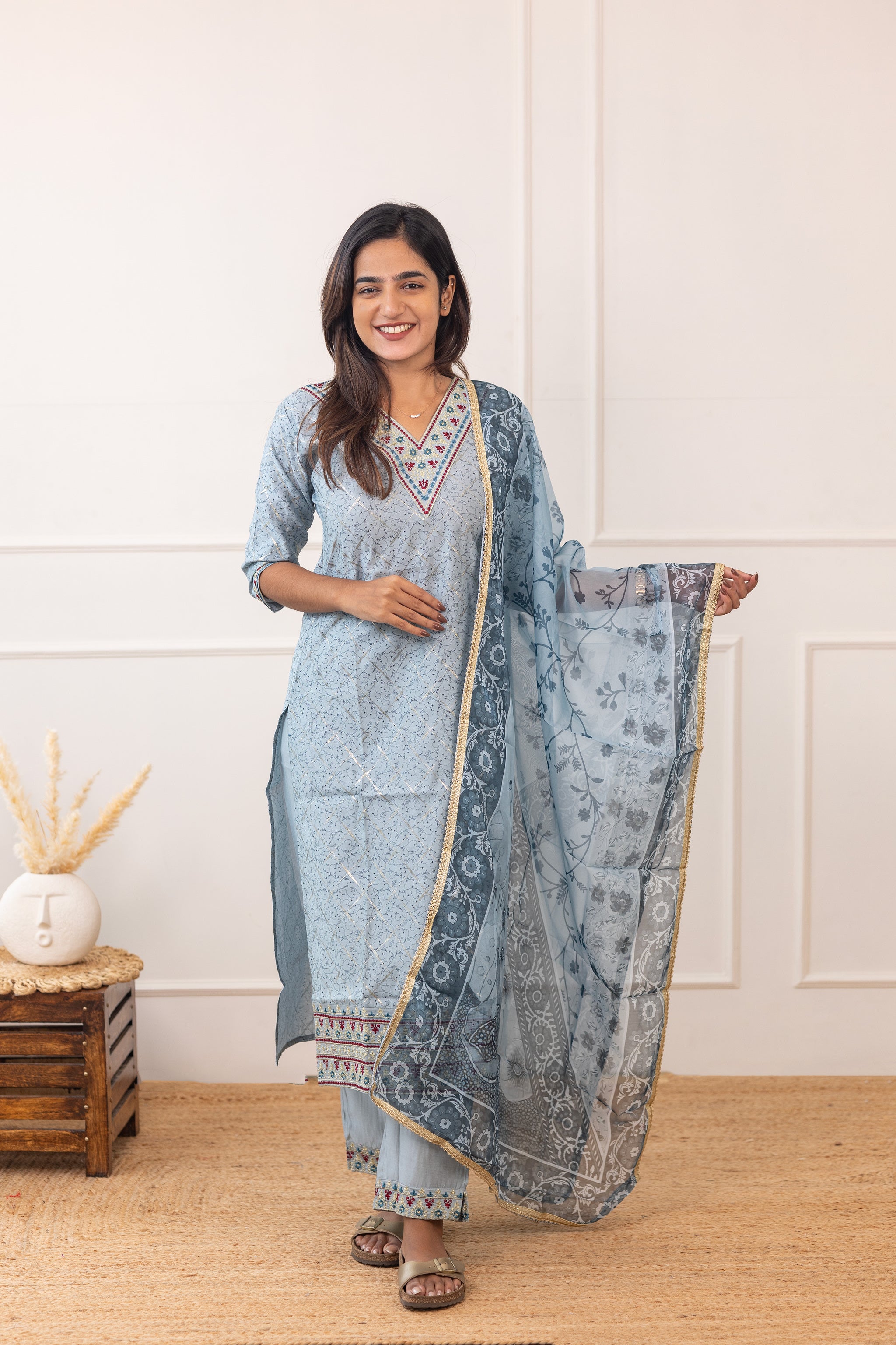 Introducing the Shanaya salwar set, a refined ensemble crafted in luxurious Roman silk. This sophisticated piece features an elegant grey base adorned with intricate silver printed patterns and delicate embroidery work that elevates its timeless appeal. Perfect for festive occasions and celebrations, the Shanaya combines traditional craftsmanship with contemporary elegance. The premium silk fabric drapes beautifully while the silver embellishments catch light gracefully, making it an ideal choice for those who appreciate understated luxury and authentic artistry.