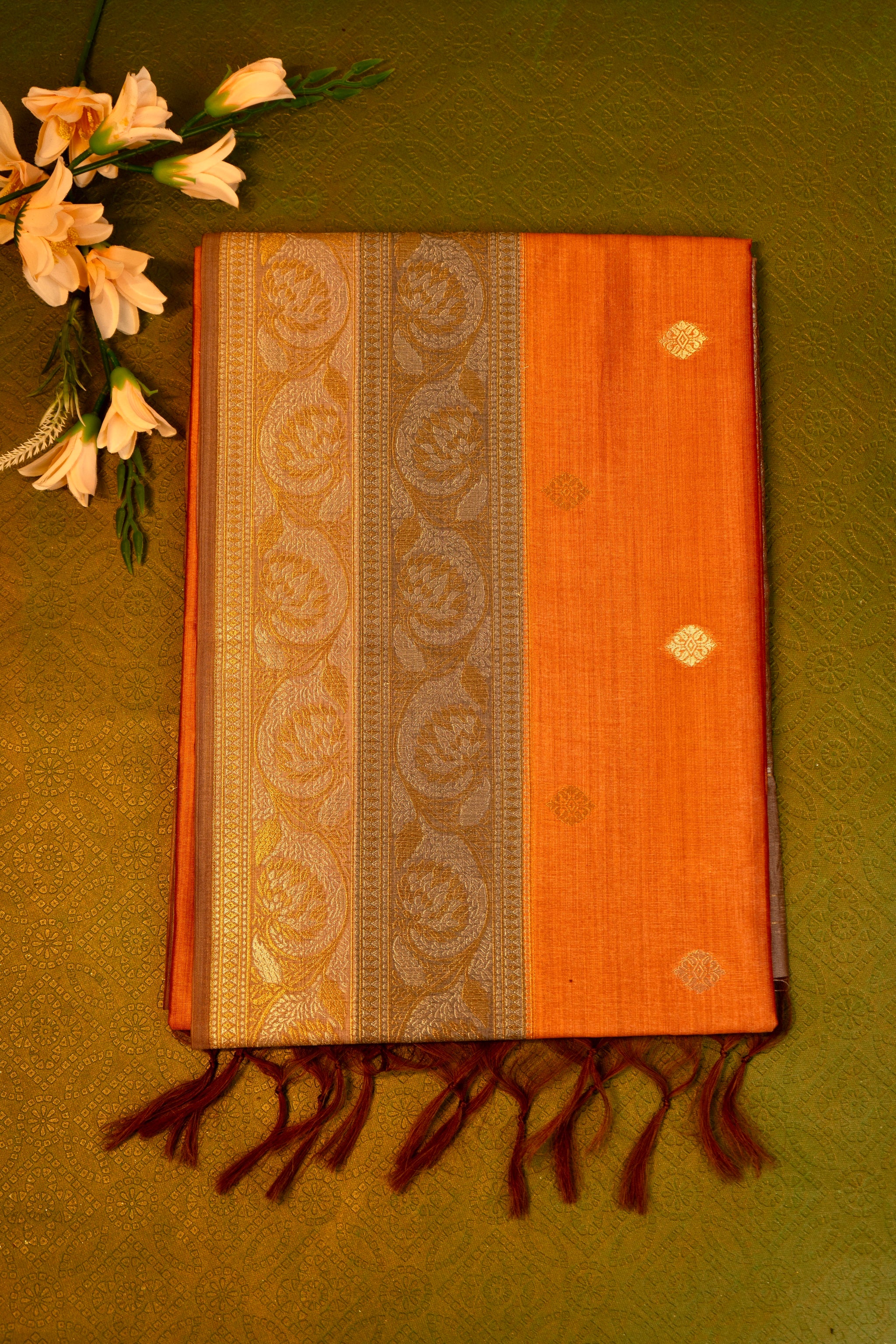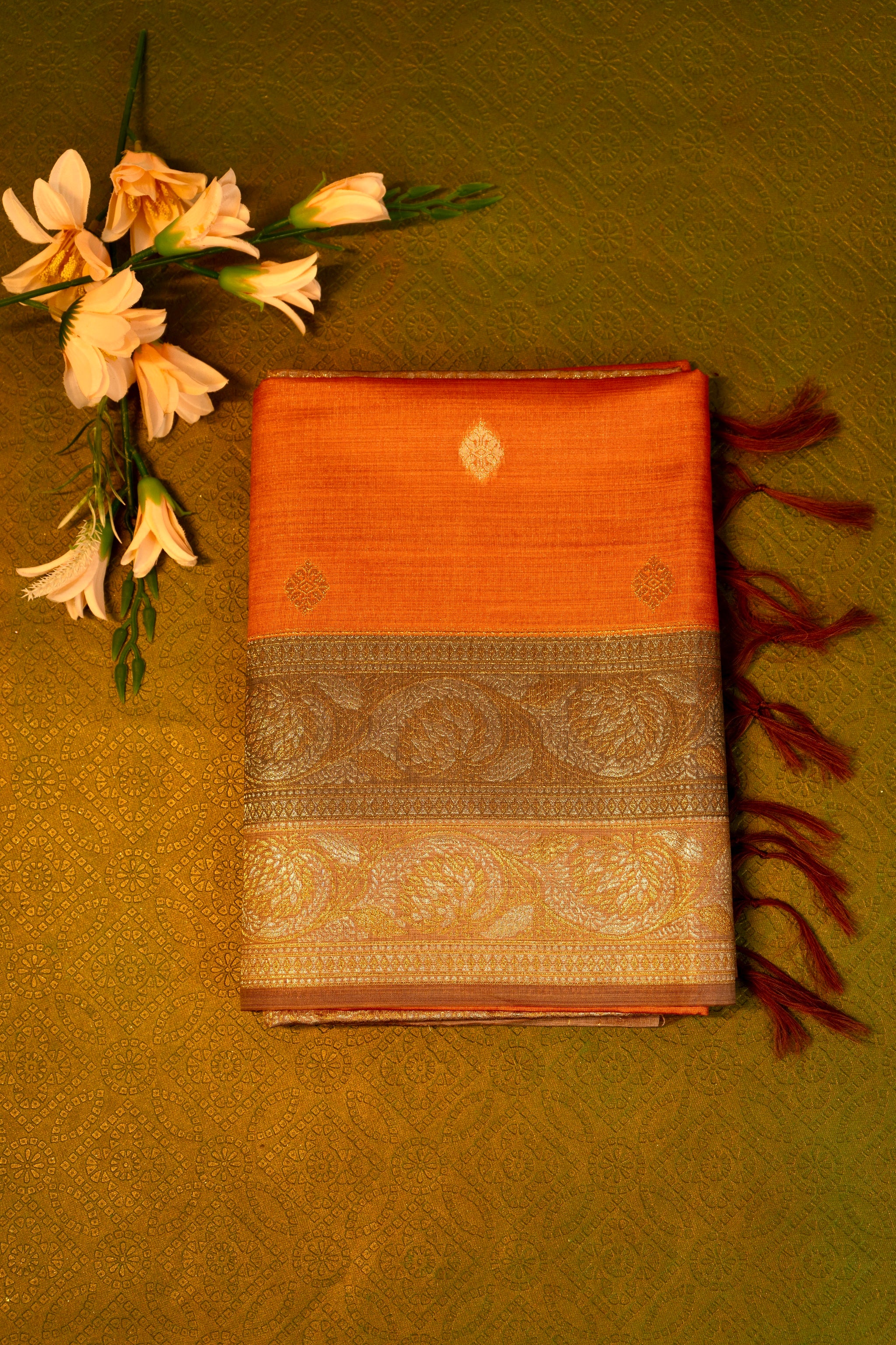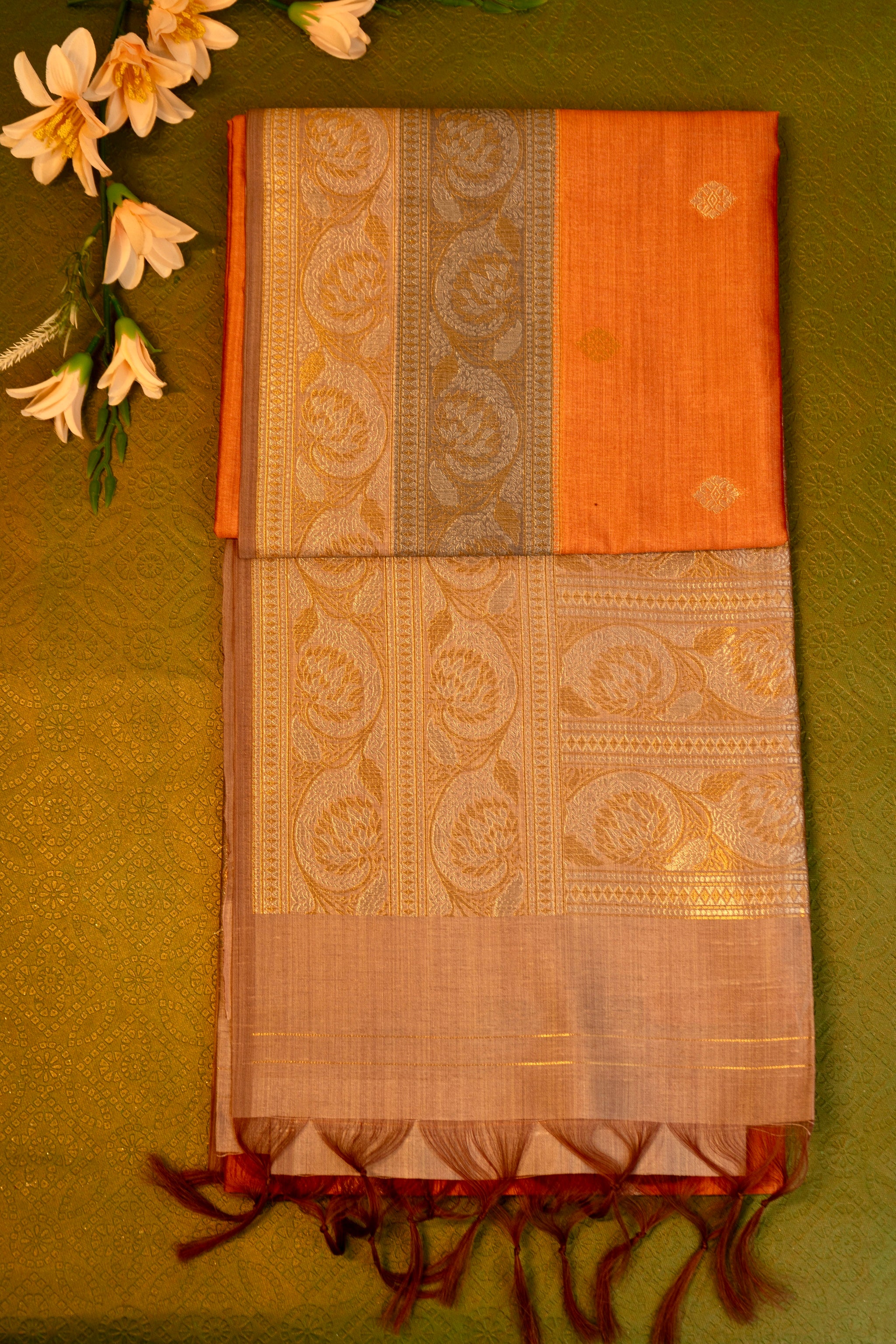 This soft silk saree in orange features a luxurious gold zari border adorned with delicate floral motifs. Small butta patterns woven throughout the body add subtle texture, creating a refined and elegant look perfect for sophisticated occasions.