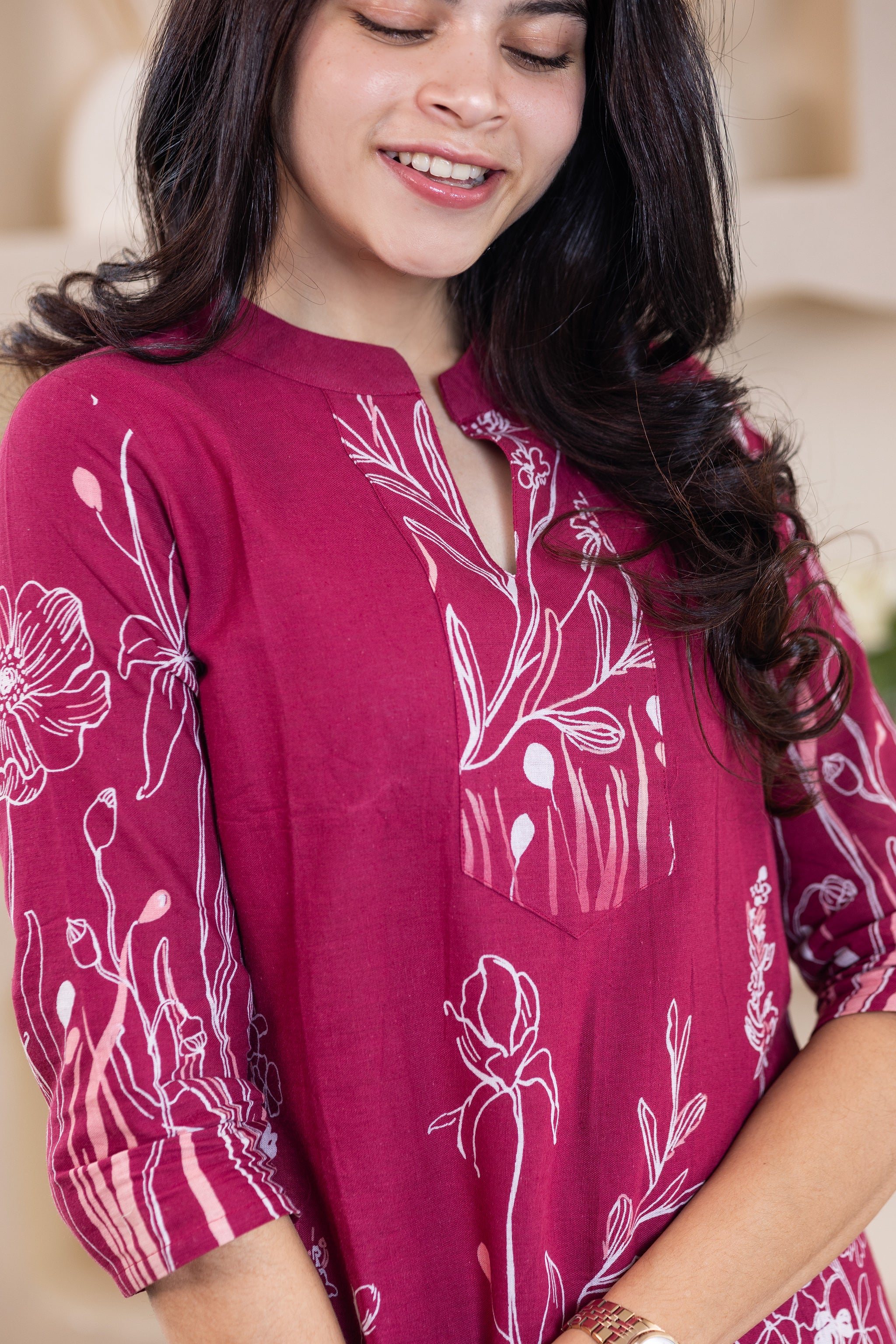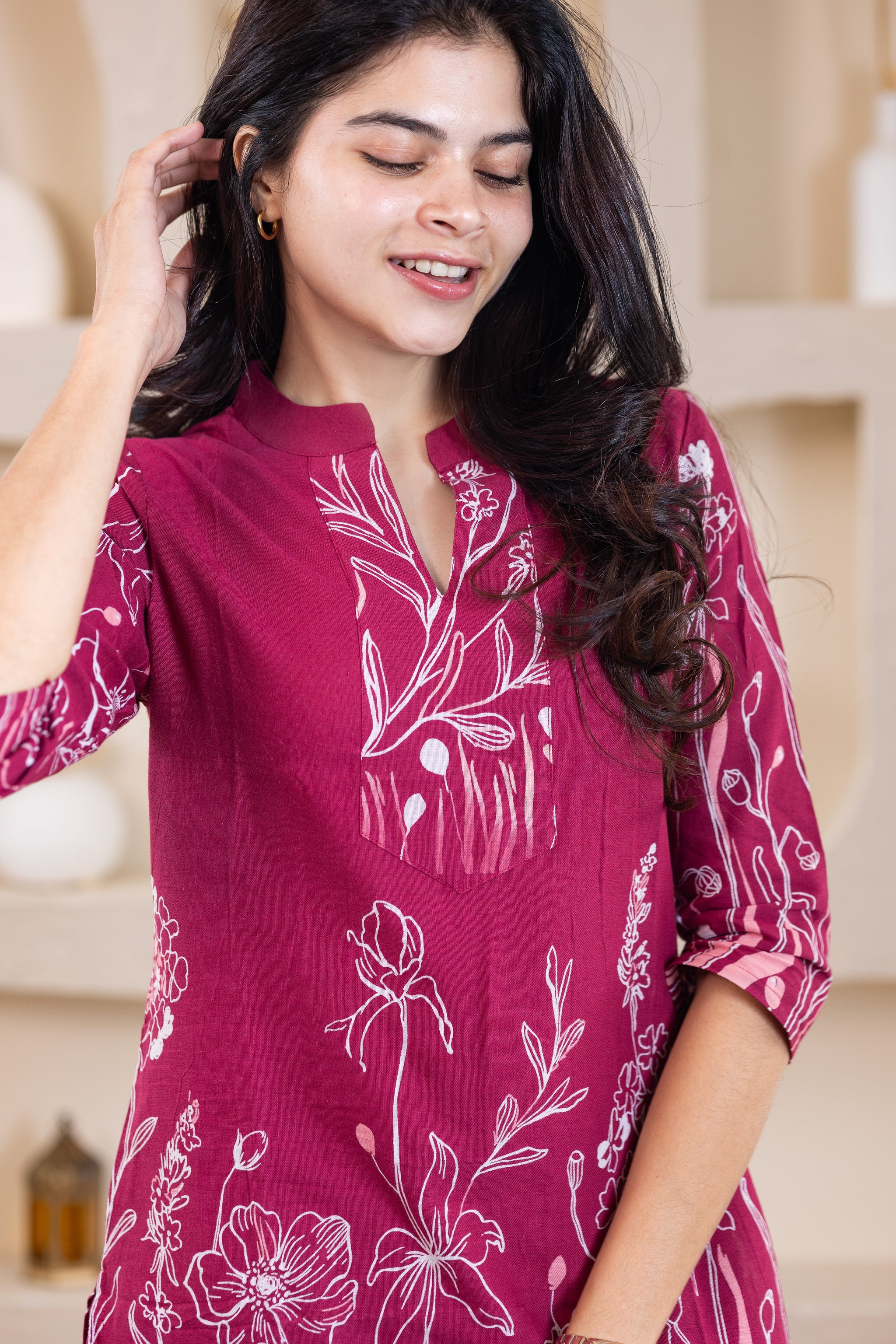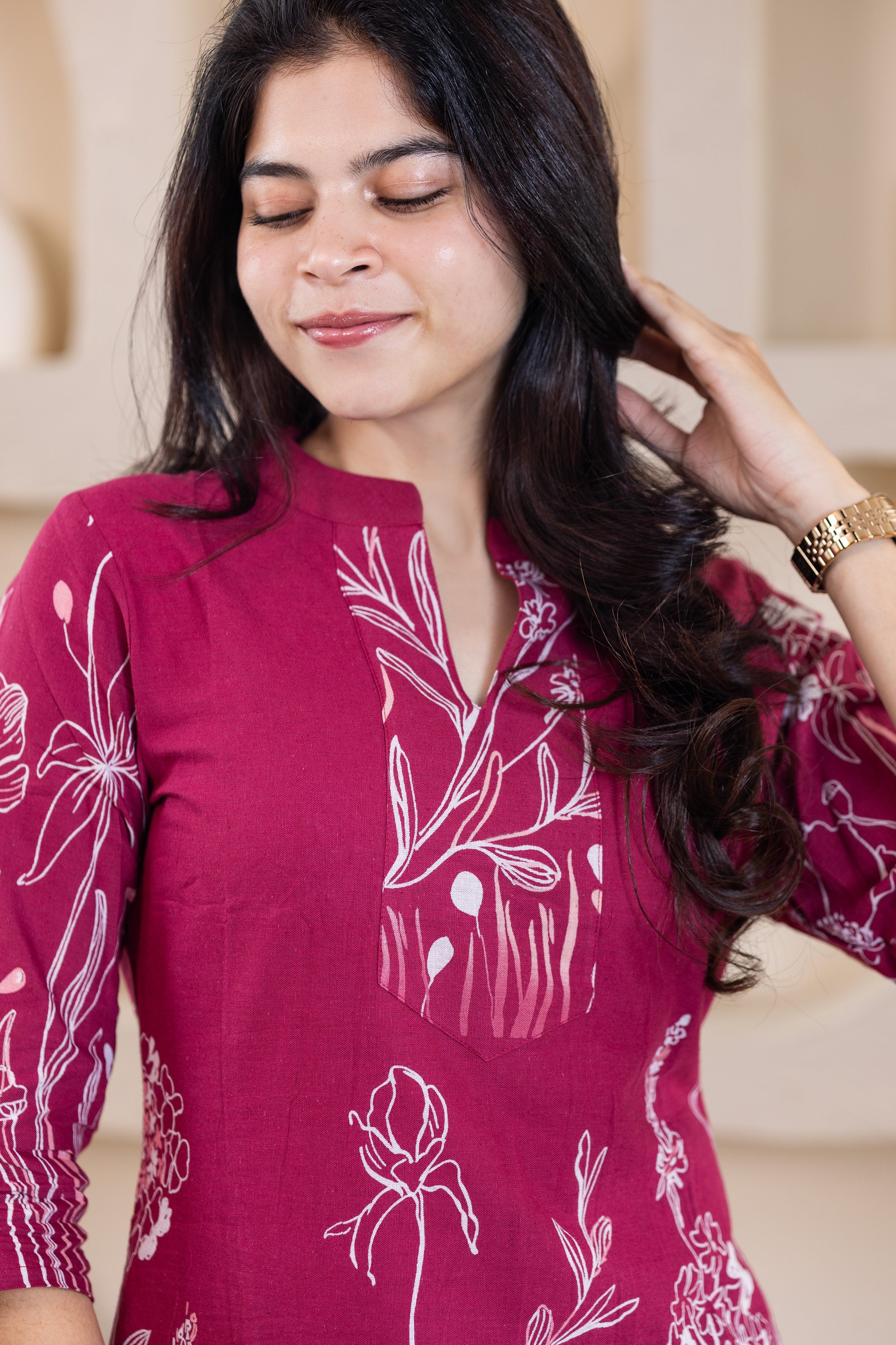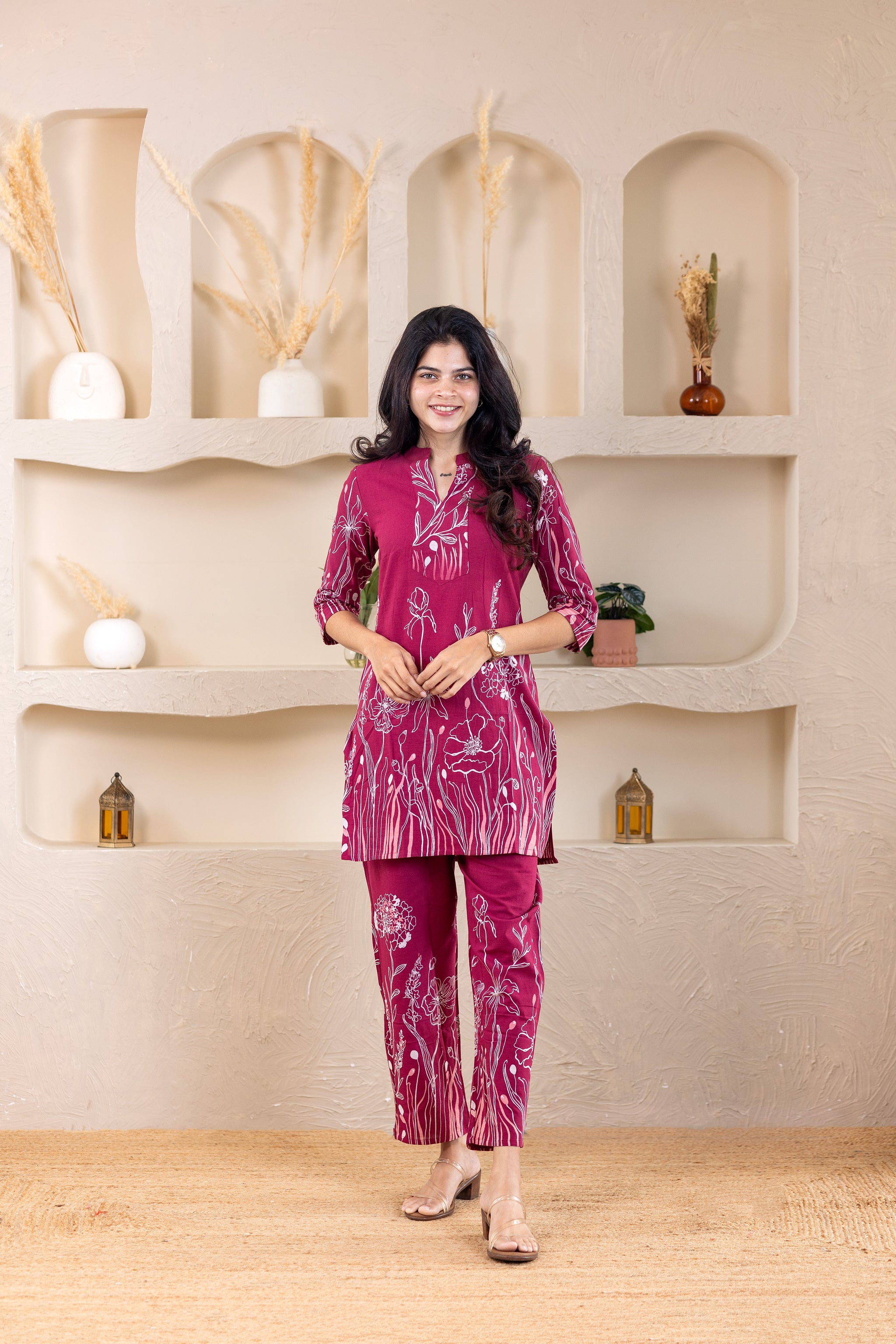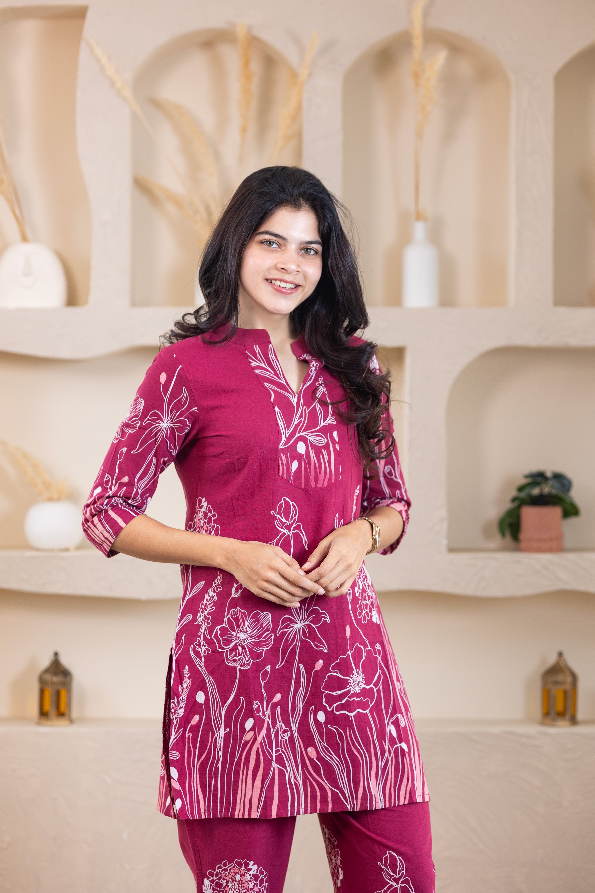 Elevate your everyday wardrobe with the Sierra kurti set, a refined ensemble crafted from premium flex cotton. The rich Beaujolais wine hue provides a luxurious backdrop for delicate cream printed detailing, creating an understated yet striking aesthetic. Perfect for both casual gatherings and semi-formal occasions, this versatile set combines comfort with timeless elegance. The breathable fabric ensures all-day wearability, while the thoughtful design celebrates traditional craftsmanship with contemporary sensibility.