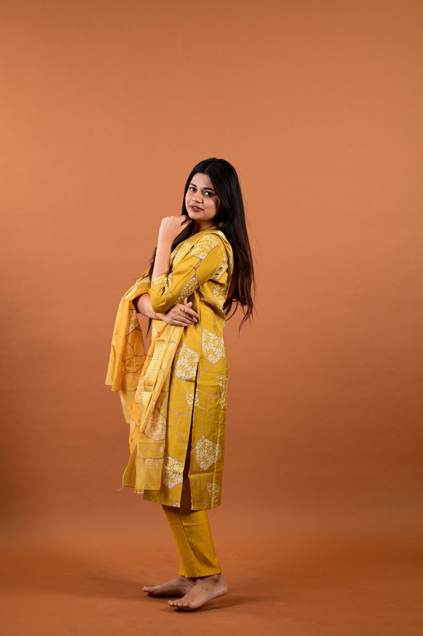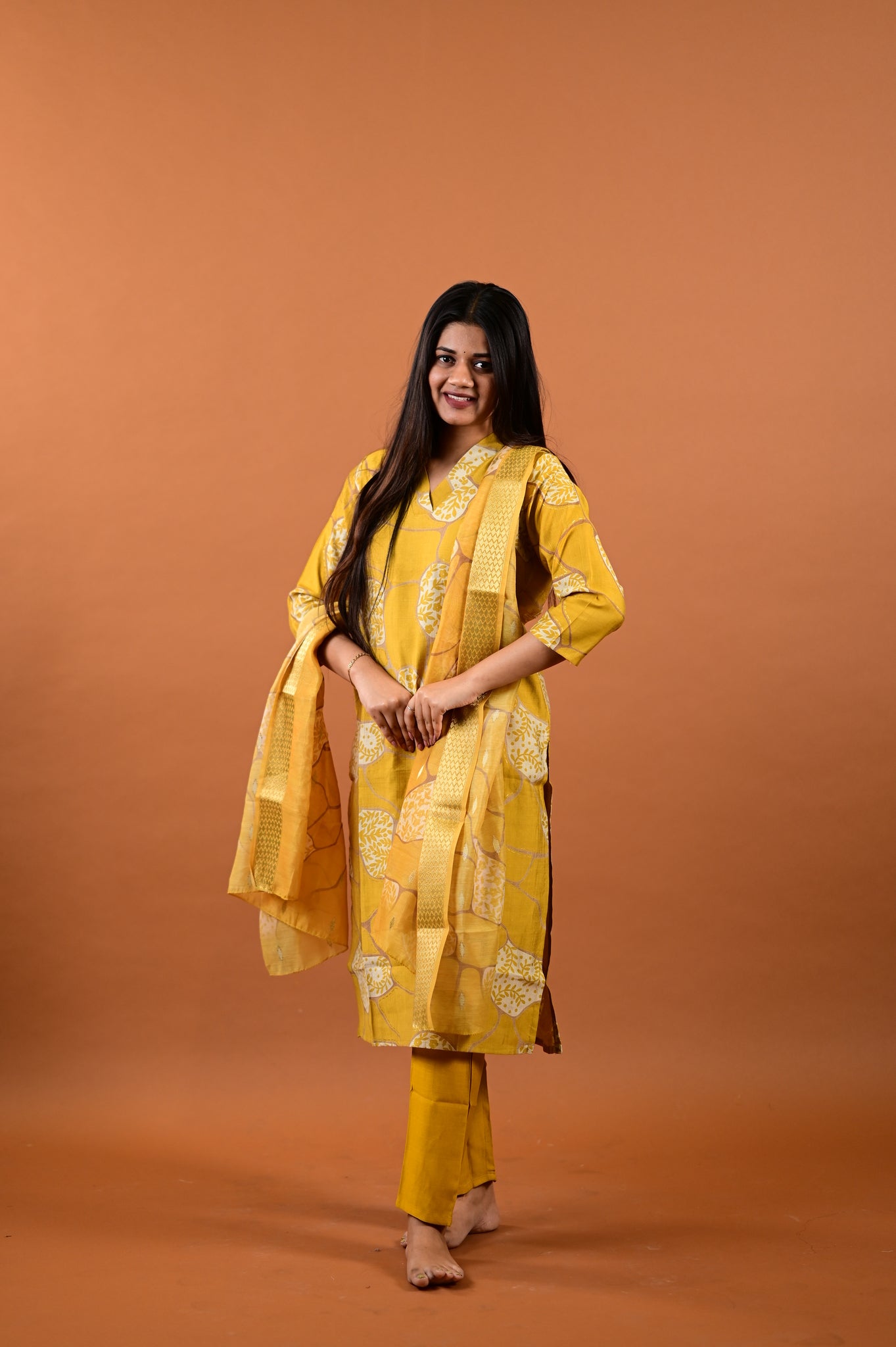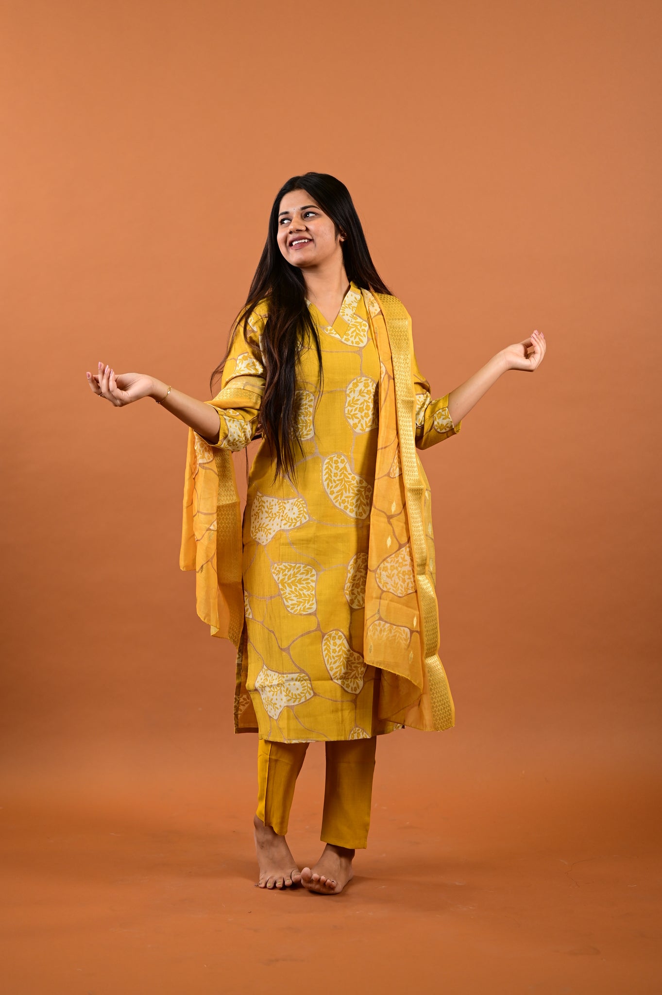 Introducing the Ziya salwar set, a refined ensemble in warm mustard yellow that captures timeless elegance. Adorned with delicate vertical flower motifs, this piece showcases meticulous craftsmanship in premium fabric. The thoughtfully lined construction ensures comfort and durability, allowing you to move with confidence throughout your day. Perfect for celebrations, gatherings, or elevating your everyday wardrobe, this salwar set seamlessly blends traditional artistry with contemporary sophistication.
